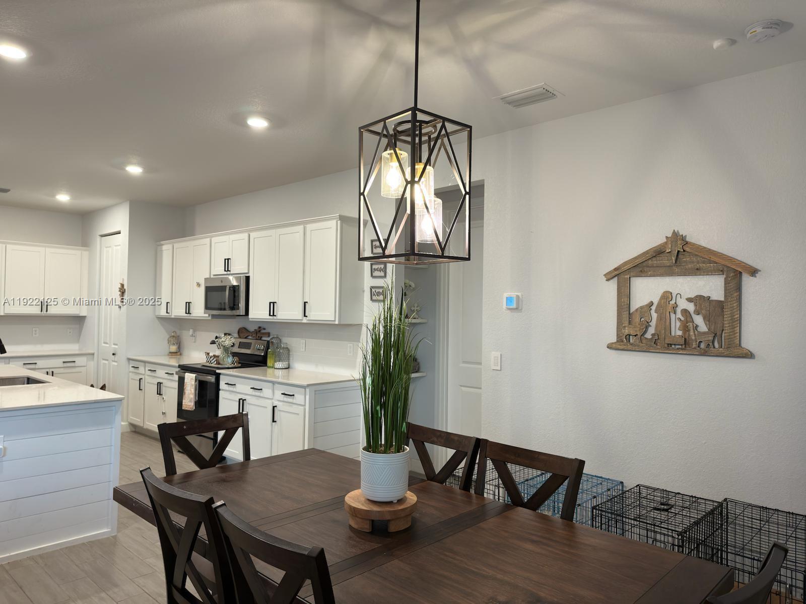 Welcome to the Santa Fe smart home model nestled in the warm, gated, family-friendly Copper Creek community! This captivating residence seamlessly blends modern elegance with inviting charm, with sleek tile floors leading to a open kitchen with quartz countertops and a white backsplash. Entertain around the kitchen island with shiplap detailing. Enjoy the fenced yard and screened patio for relaxation. Inside, find a den and family room with a shiplap wall. Retreat to spacious bedrooms with walk-in closets, including a 3rd bedroom with an en-suite bathroom. Copper Creek offers exclusive amenities including a clubhouse and fitness center, with Allapattah Flatts K-8th Grade School just a stroll away. Experience resort-style living in this haven of comfort!