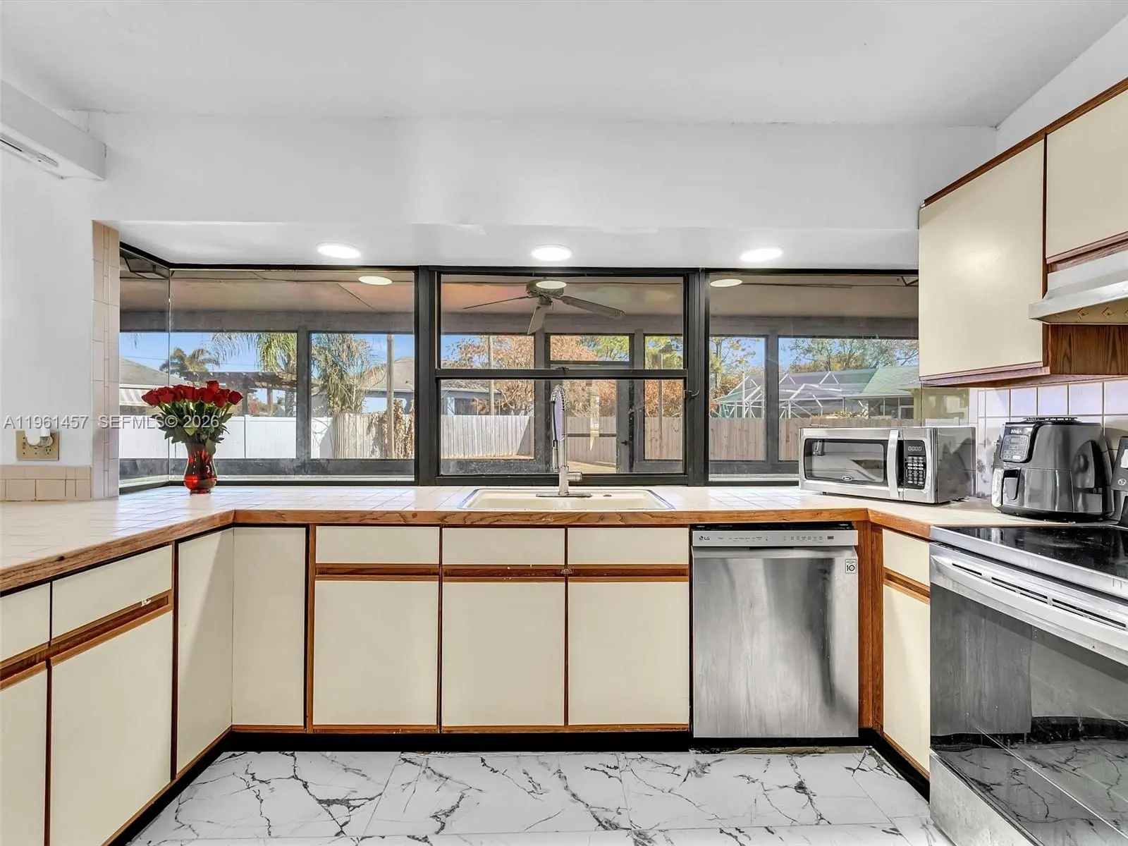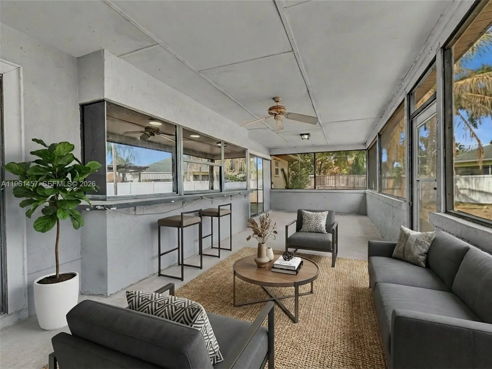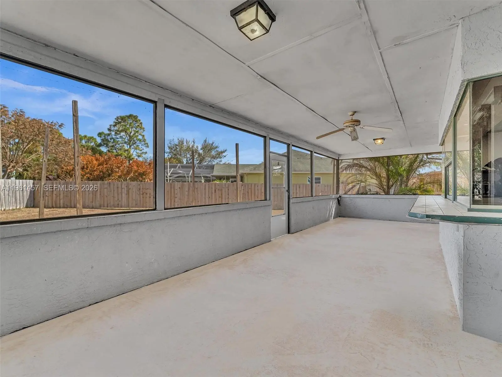 Incredible opportunity to own this charming 2 bedroom, 2 bathroom home on a spacious corner lot located in the heart of Port St. Lucie. This pristine property was recently renovated with porcelain tiles throughout and updated master bathroom. An open kitchen, adjacent to a large dining room, with a new Samsung refrigerator and garbage disposal, recently installed. A split bedroom layout with spacious walk-in closets and plenty of storage room. The fencing was just replaced along with a new flat roof. It features an oversized covered patio with a pass through bar top, giving you that great feeling for relaxation and entertaining your family and friends.