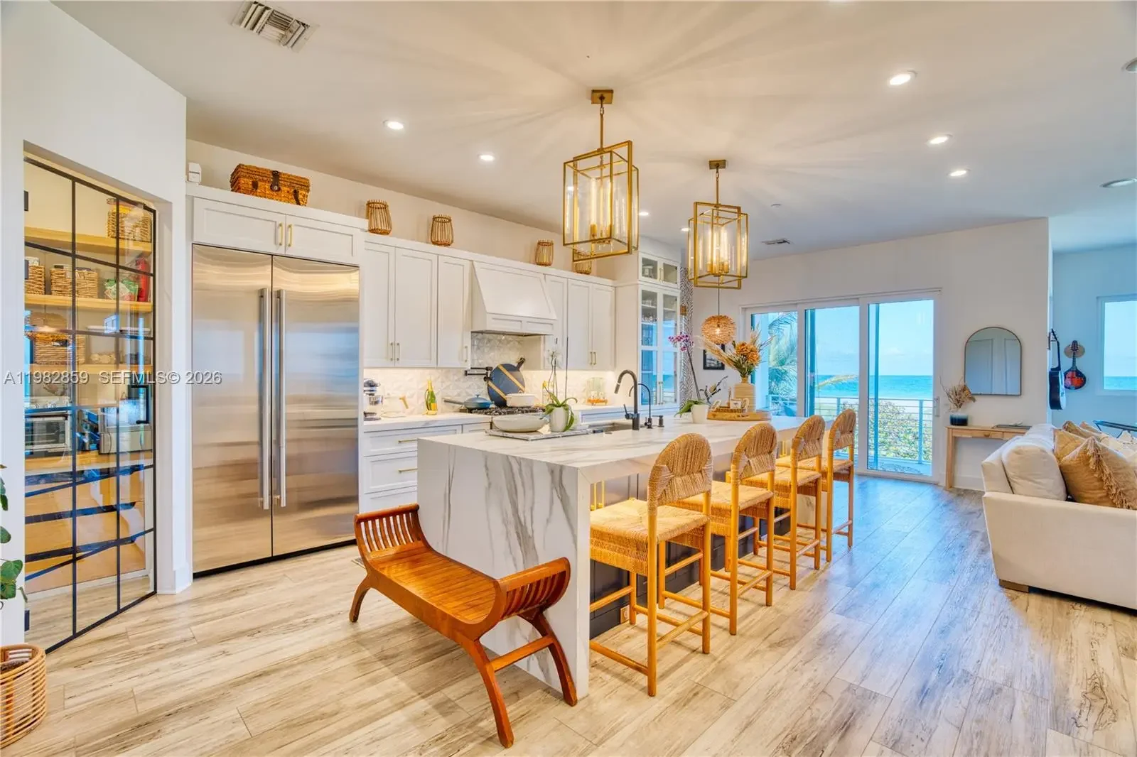 Experience modern coastal luxury in this stunning 2022 custom-built oceanfront retreat located in the exclusive gated community of Watersong on South Hutchinson Island. This 4-bedroom, 3-bath residence with a den/office features a thoughtfully designed floor plan centered around a chef’s kitchen with premium cabinetry, professional-grade appliances, gas range, and an oversized island perfect for entertaining. Soaring ceilings, durable luxury vinyl flooring, and expansive hurricane-impact windows fill the home with natural light while showcasing breathtaking ocean views. The primary suite is a private coastal sanctuary featuring its own balcony overlooking the Atlantic, two oversized walk-in closets, and a spa-inspired bath with a soaking tub, expansive wet-room shower, and dual vanities. Wake up to spectacular sunrises over the ocean and unwind each evening with colorful sunsets over the Intracoastal. Outdoor living is designed for the ultimate island lifestyle, complete with an outdoor shower, hot tub, gas fireplace, workout area, and pass-through garage doors ideal for storing a midsize center console boat or multiple jet skis. An elevator provides easy access to all levels. The private, quiet community offers both security and serenity, along with a resort-style pool perfect for swimming laps or entertaining guests. Schedule your private tour today and start living the South Hutchinson Island lifestyle.
