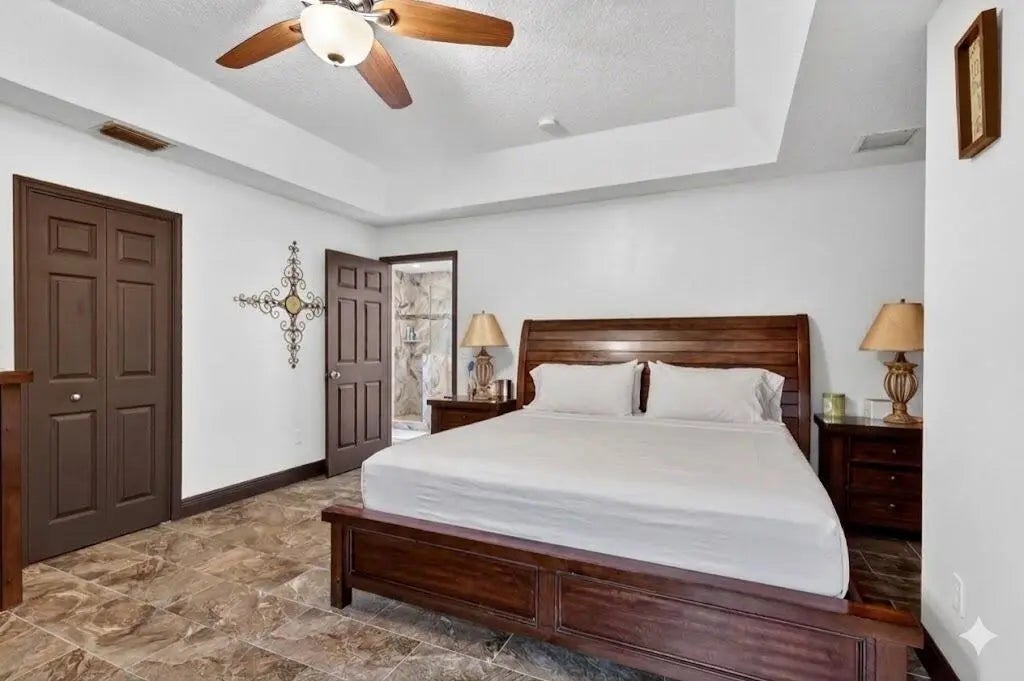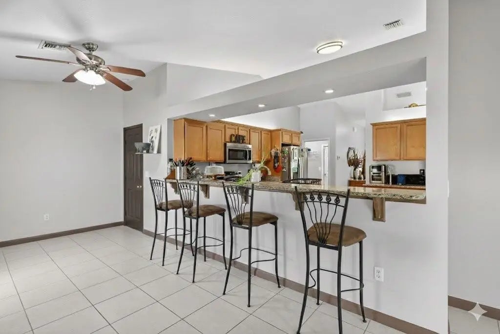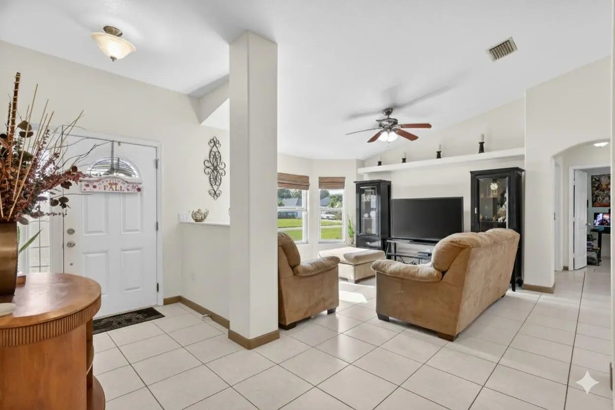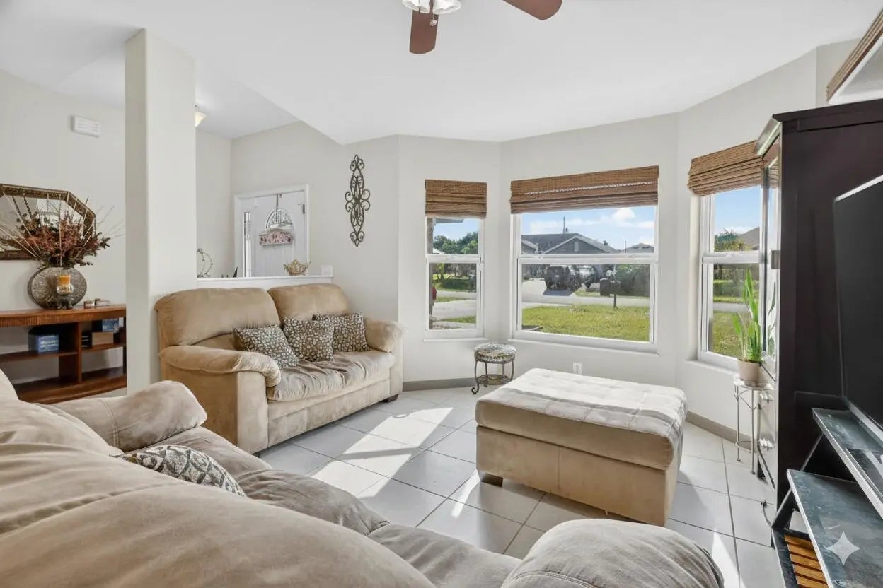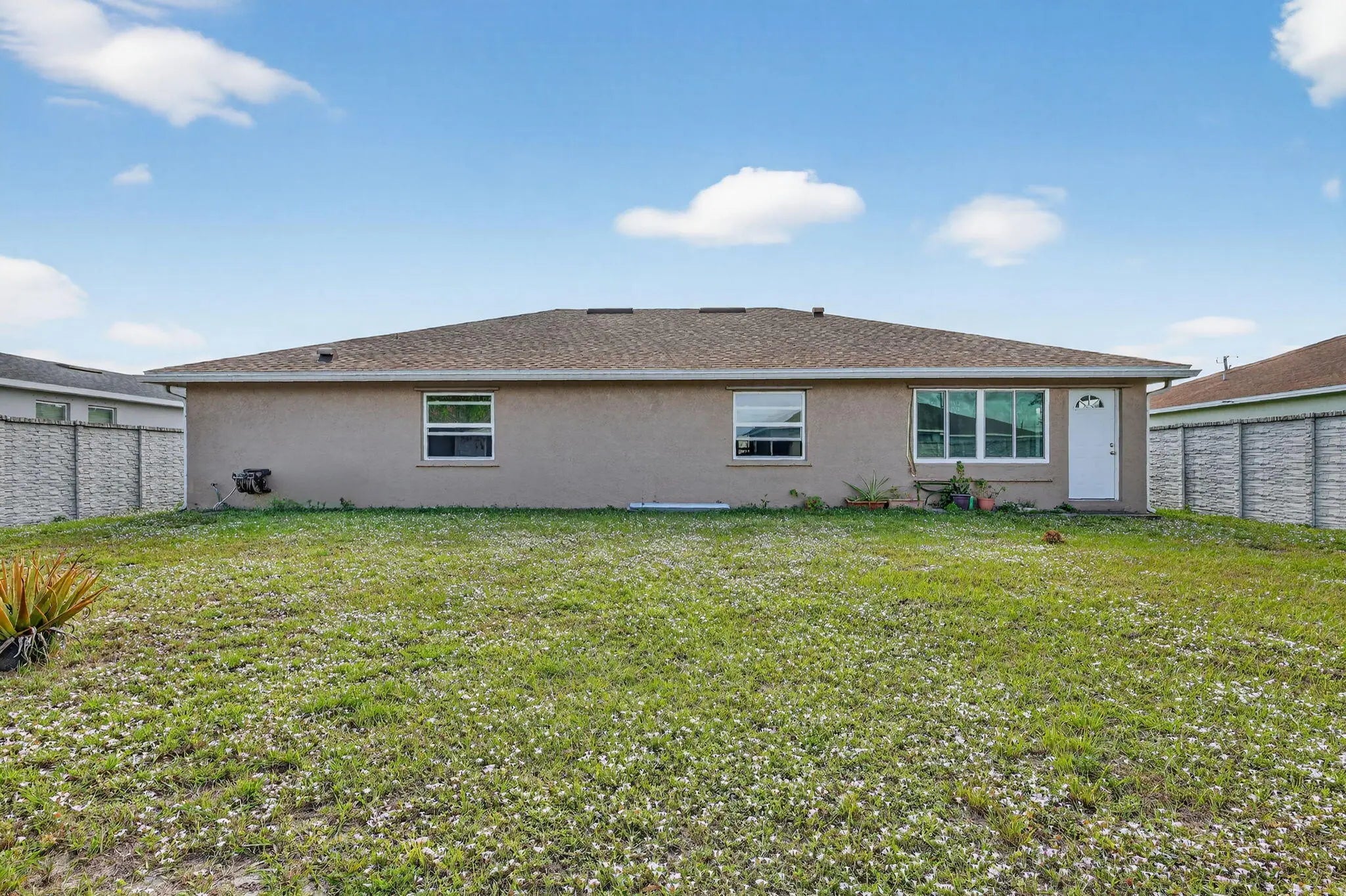 Welcome to this beautifully maintained 3-bedroom, 2-bathroom home offering 2,006 sq ft of living space in Port St. Lucie, featuring tile flooring throughout and an impressive 18-foot ceiling that enhances the bright and open living area. A spacious flex room filled with natural light adds incredible versatility and can easily function as a home office, den, playroom, gym, or potential 4th bedroom. The upgraded kitchen features granite countertops, modern cabinetry, and stainless steel appliances, while the primary suite offers a comfortable retreat with walk-in closet, dual vanities and a walk-in glass shower. A convenient walk-in laundry room with washer and dryer included adds everyday practicality. This home offers peace of mind with impact windows installed in 2021, a new roof from 2022, and a solid concrete privacy fence completed in 2021, along with a 2016 A/C system. The fully fenced yard provides privacy and space to enjoy the outdoors, and an additional storage shed is included for extra convenience. Located in a quiet Port St. Lucie neighborhood close to boat ramps, parks, shopping, restaurants, and major roadways, this home offers the perfect combination of comfort, flexibility, and location. Schedule your showing today and see the possibilities this spacious home has to offer.
