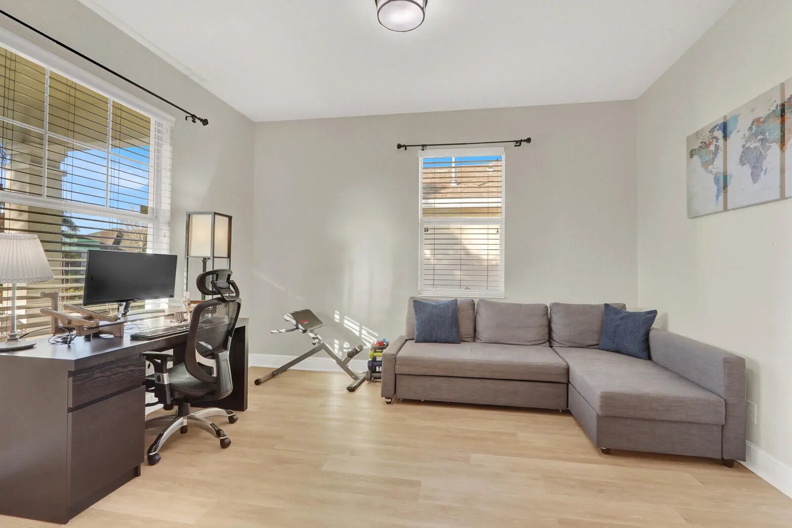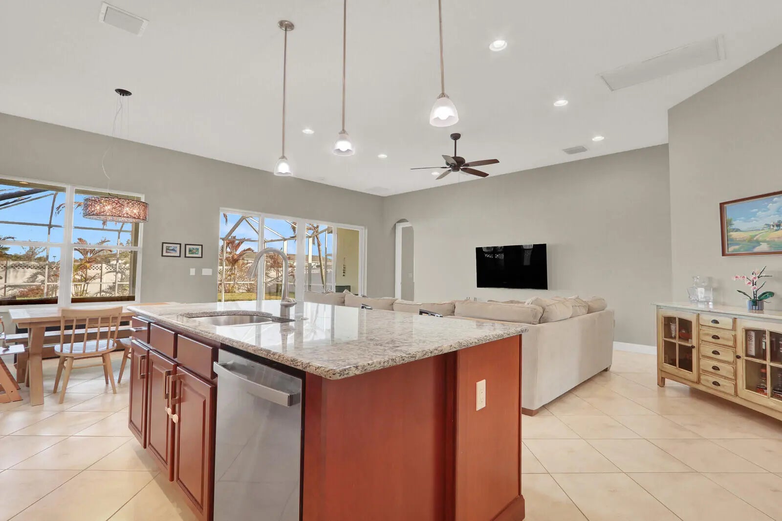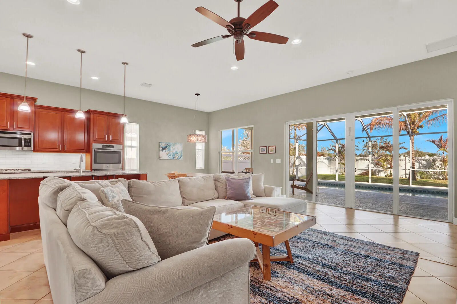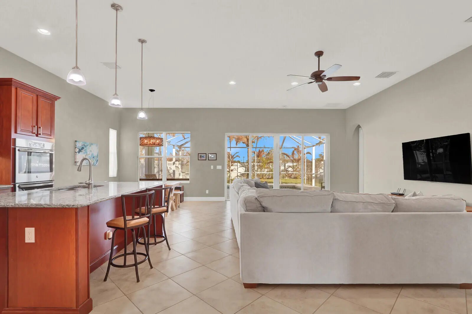 The Epitome of Tradition Living: Private Pool Home in Bedford Park! Enjoy the best location in Tradition with this turnkey CBS pool home. This property offers the perfect balance of community engagement and private seclusion. Just a short walk from the vibrant Tradition Square, residents can enjoy dining and events, then return to a serene backyard retreat. Step inside to direct views of your private, screened-in salt-water pool. The fully fenced backyard is a tropical paradise, featuring matured trees and palms. Inside, enjoy a bright, open-concept design with volume ceilings, ample lighting, and a large chef's kitchen with granite countertops, gas cooking, and a double oven. The master suite is a true retreat with two walk-in closets, including a remodeled custom closet organization system. The master bathroom boasts and a spa-like bath with a soaker tub, double vanity, and a walk-in shower. Upgrades & Peace of Mind: The home is technologically updated for modern living with an EV charger (50a 240v) in the garage, a tankless water heater, and an advanced HVAC UV light system. Enjoy complete hurricane protection with impact windows and doors throughout the entire property. The versatile floor plan offers a dedicated office, flex, or 3rd bedroom space. This impeccably maintained home in the gated-free community of Bedford Park is a rare find. Turn-key and pristine—schedule your showing today!