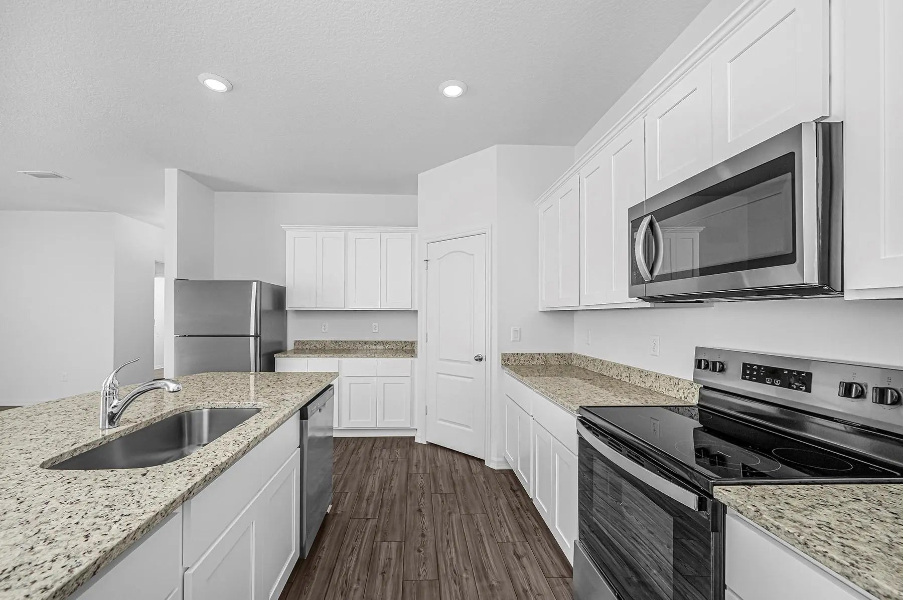 Ask us about our builder paid closing costs & no down payment options! Located within the highly sought-after area of Port St. Lucie, the Coral is more than move inready. This one-story home features an open-concept floor plan, 5 bedrooms and 3 full bathscomplete with thousands of dollars' in upgrades included. Features such as energy-efficient Whirlpool®appliances, sprawling granite countertops in the kitchen, beautiful wood cabinets, brushed nickelhardware and an attached two-car garage. The Coral also consists of a covered back patio, front yardlandscaping and a master suite complete with a massive walk-in closet. *Appliance models are subject to availability. **Exterior color scheme is as shown in first photo.