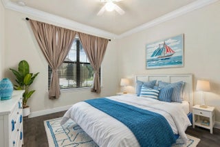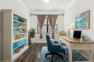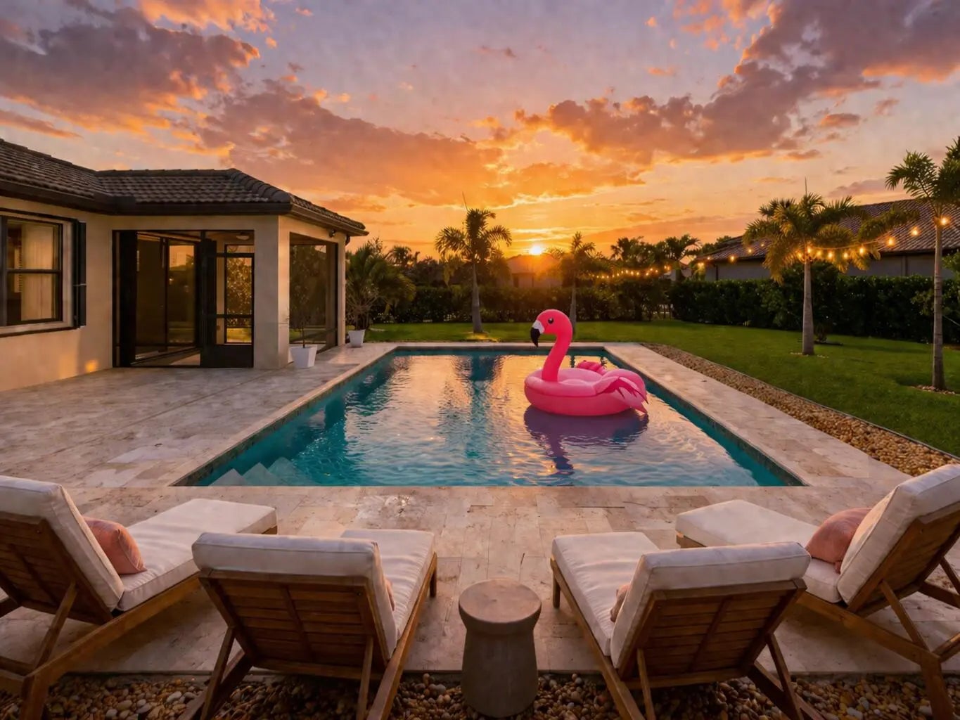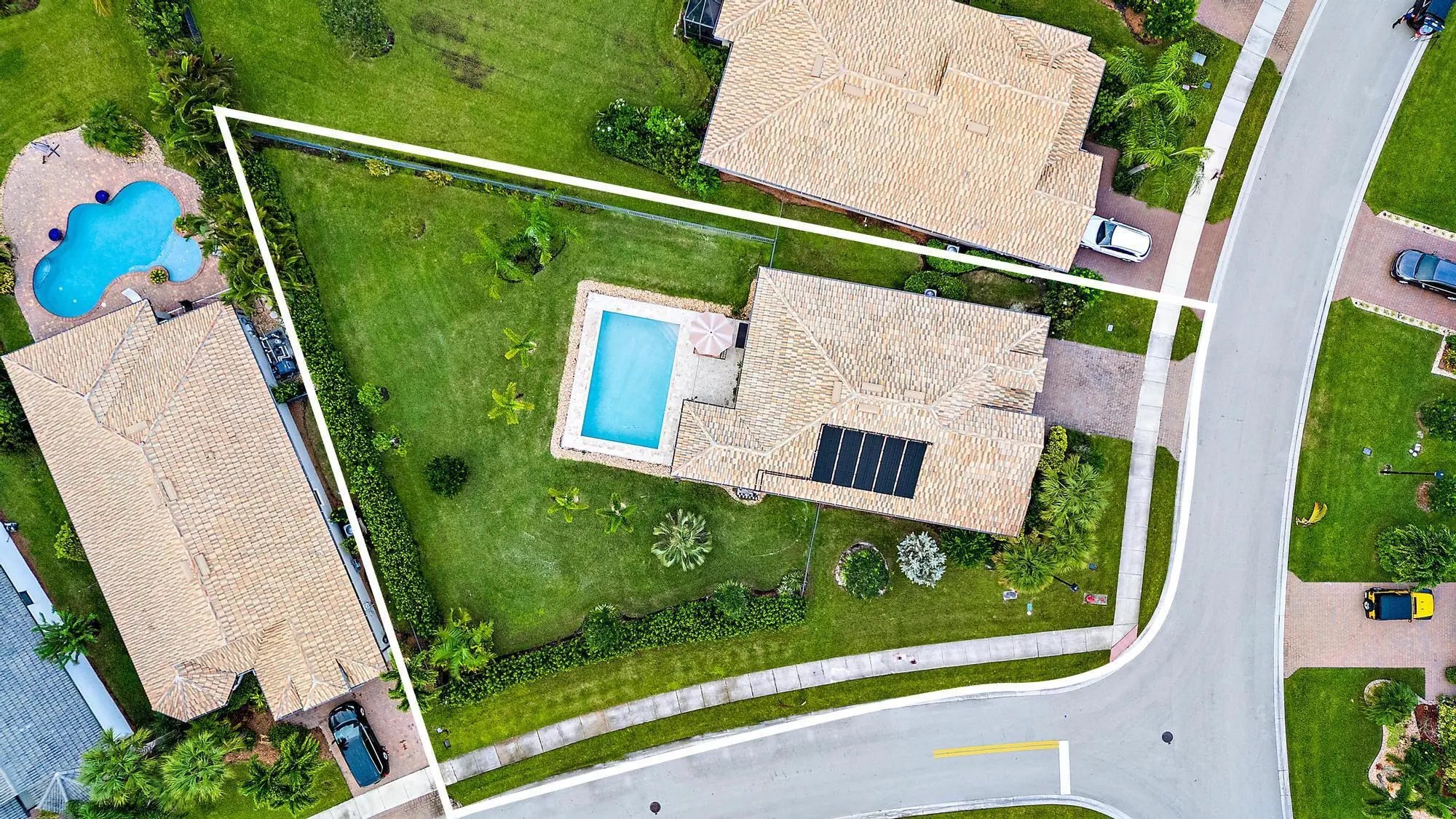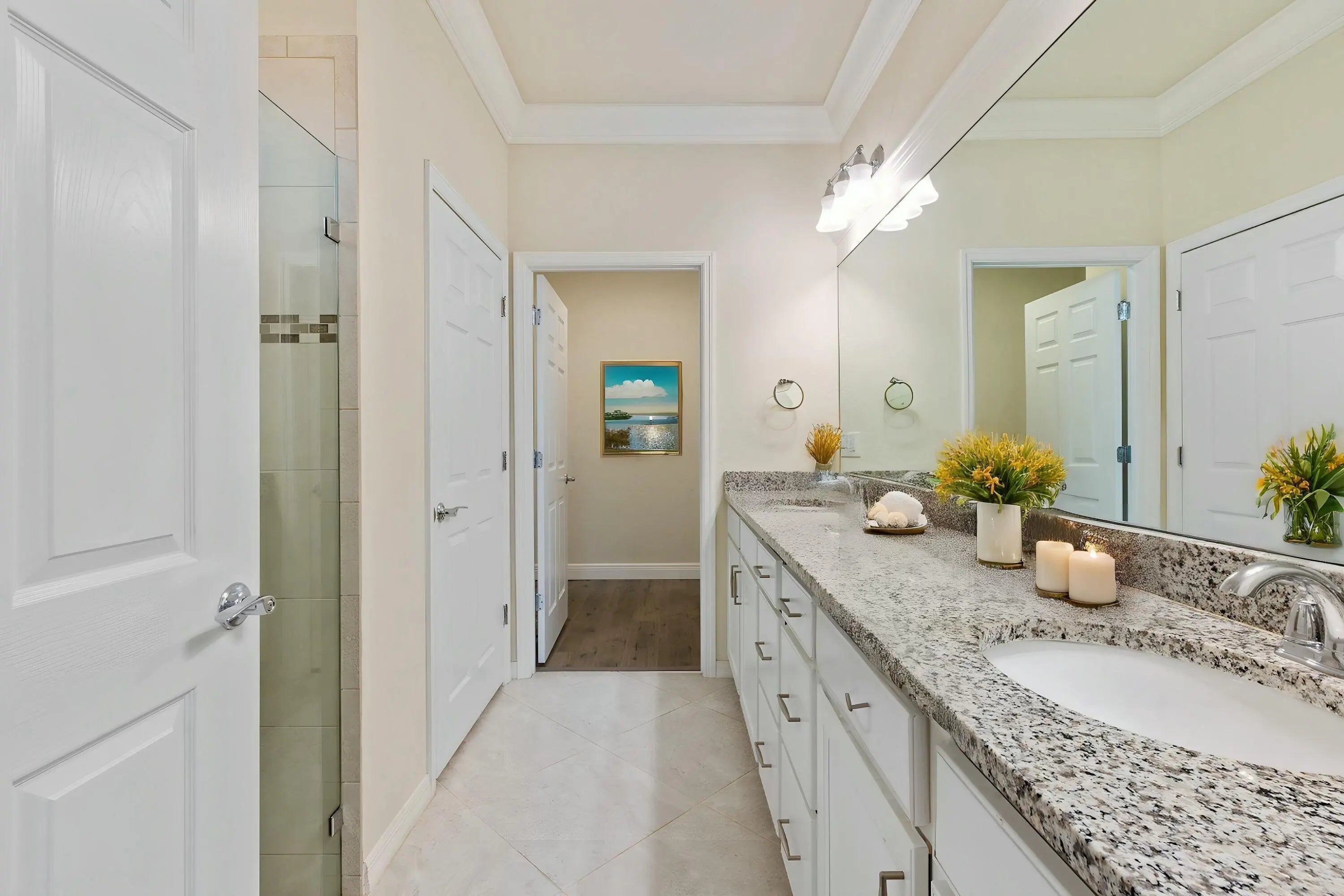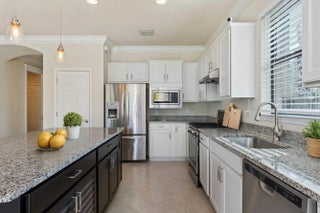 Welcome to Veranda Gardens! Discover a standout opportunity with this impeccably maintained 2-bedroom, 2-bath home plus den, perfectly positioned on an oversized 0.31-acre premium corner lot, one of the largest in the community. This home delivers the ultimate Florida lifestyle. Step outside into your own tropical retreat, where a solar-heated, saltwater pool (2021) is surrounded by travertine decking, water features, mature palm trees, and lush landscaping that lines the entire fenced yard. Inside, the home offers a refined and inviting design with custom wood archways, crown molding throughout, an executive glass door to the den, and tile flooring throughout the main living areas. The kitchen is equipped with stainless steel appliances, granite countertops, upgraded cabinetry, and natural gas for the range, water heater, and dryer. Additional features include central water filtration, accordion hurricane shutters, Cat 5e wiring, tinted windows, an integrated safe, security cameras, a quiet belt-drive garage opener, and custom storage in both the garage and walk-in closets. Residents of Veranda Gardens enjoy resort-style amenities including a clubhouse, two pools, spa, fitness center, tennis and pickleball courts, bocce ball, fire pit, and dog park, offering a lifestyle of both luxury and convenience.