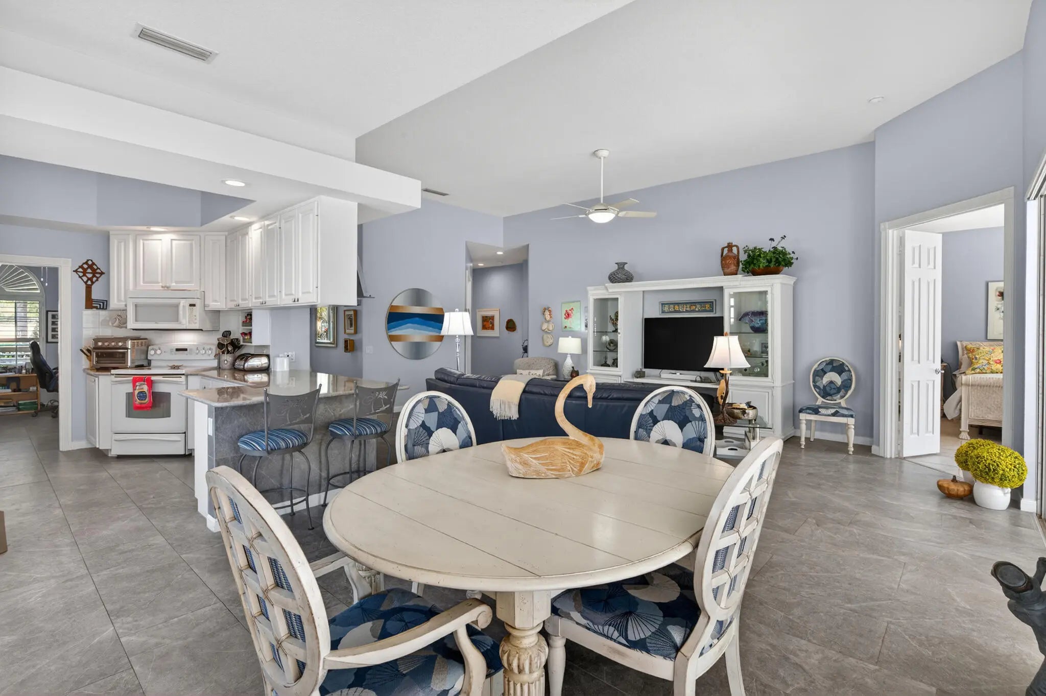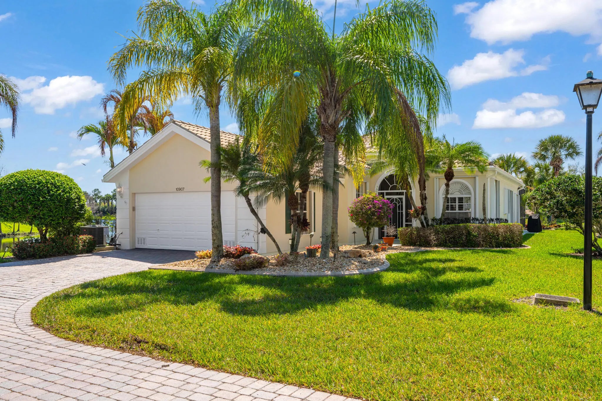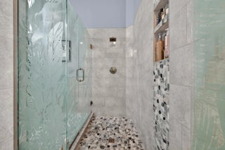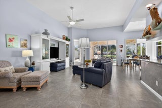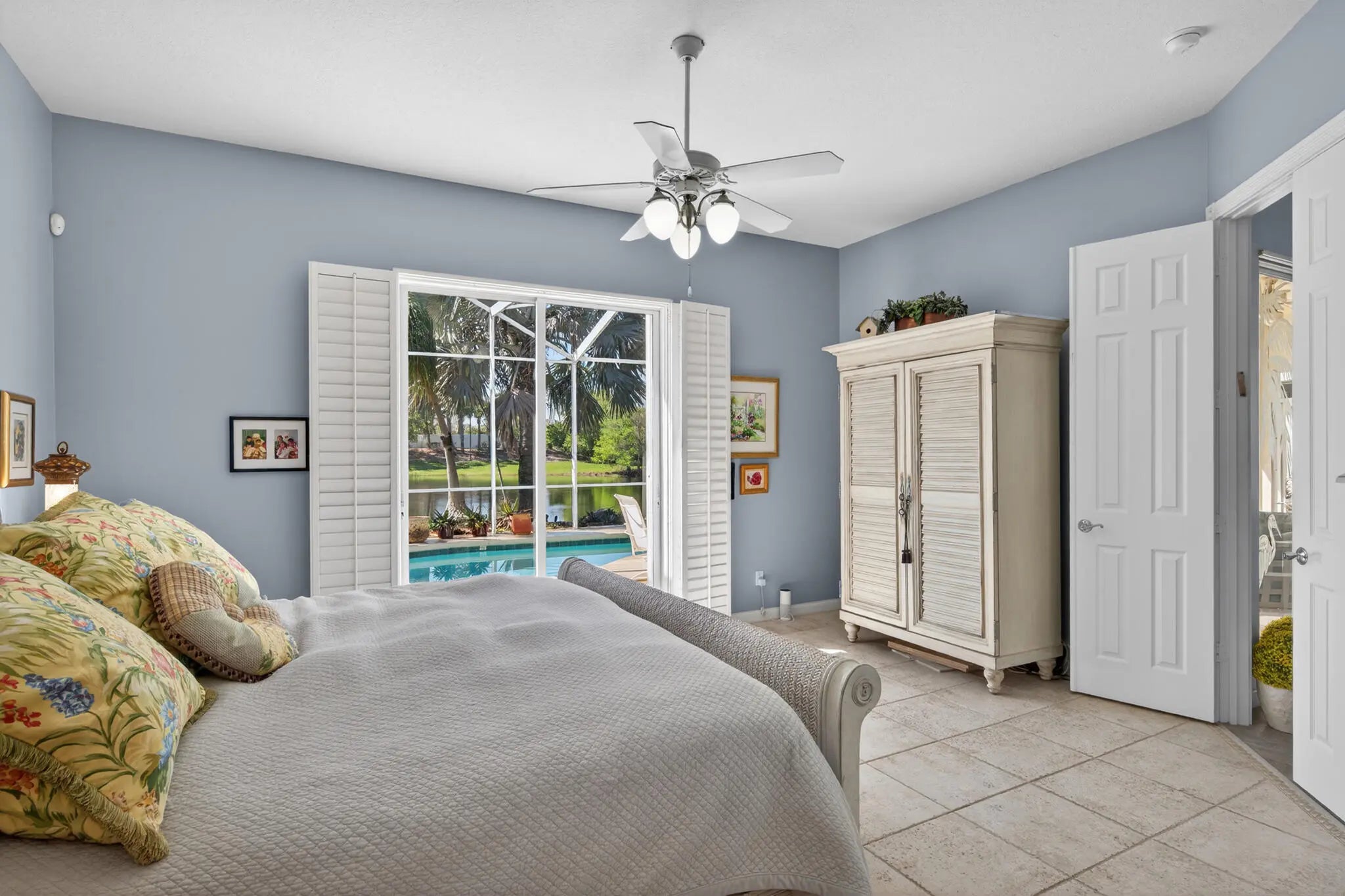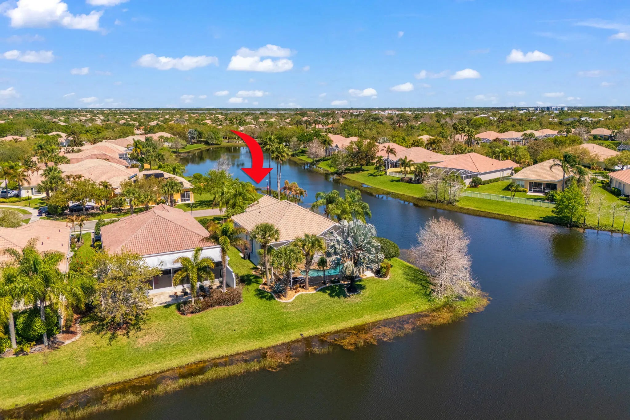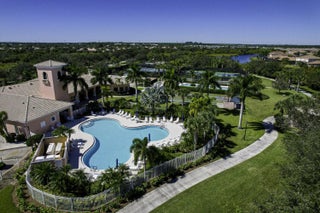 Located in a highly desirable Tradition community, this original owner home sits on a premium corner lot surrounded by water on two sides. A standout feature is the expansive L-shaped driveway, providing ample parking for family and friends. Step inside through the screened entryway and you'll immediately notice the upgraded tile flooring in the living room, kitchen, and den. The glass sliders leading to the pool feature original etched glass artwork that add a unique touch, and the den/study features custom plantation shutters. The kitchen has been updated with stone counters and convenient drawers. The spacious living areas flow seamlessly to the outdoor oasis, where you'll find a heated, screened-in pool and a freshly painted pool deck, perfect for relaxing while enjoying the stunning water views in all directions! The owner's suite offers a true retreat with fully remodeled his-and-hers bathrooms, featuring new cabinetry, tile, and etched shower glass. There is ample closet space for all your stuff! Major system updates include a brand-new 2026 air conditioning system and this home's exterior has been freshly painted in February 2026. Even the garage has been upgraded with a custom floor, reflecting the same level of care found throughout the property. The enhanced landscaping makes this home stand out in this gated neighborhood within walking distance to shopping and dining in Tradition square! HOA amenities include cable, internet, alarm, lawn care, exterior painting, 24 hour manned gate, clubhouse with social activities, gym, pickleball, tennis, 2 heated pools.