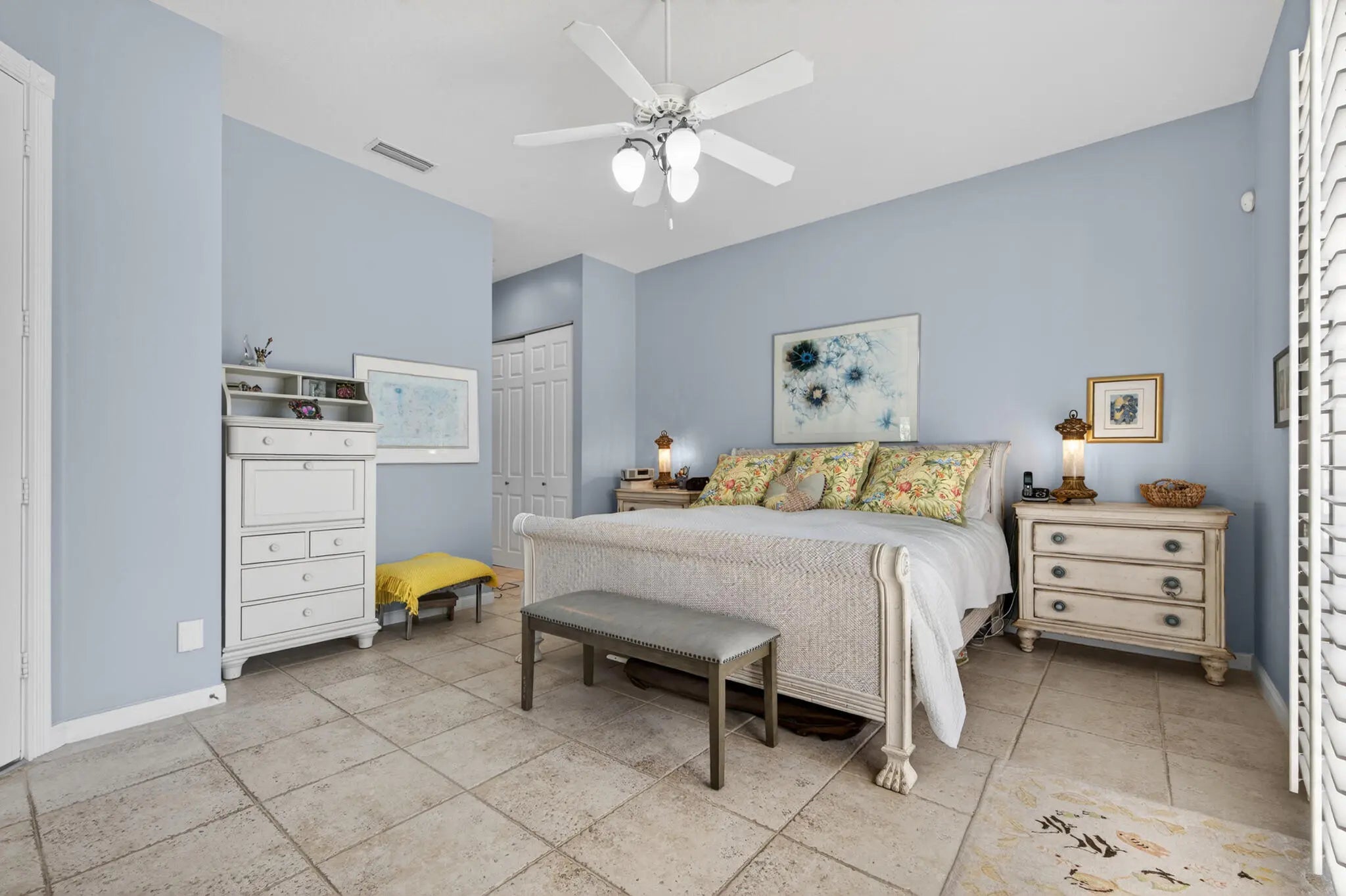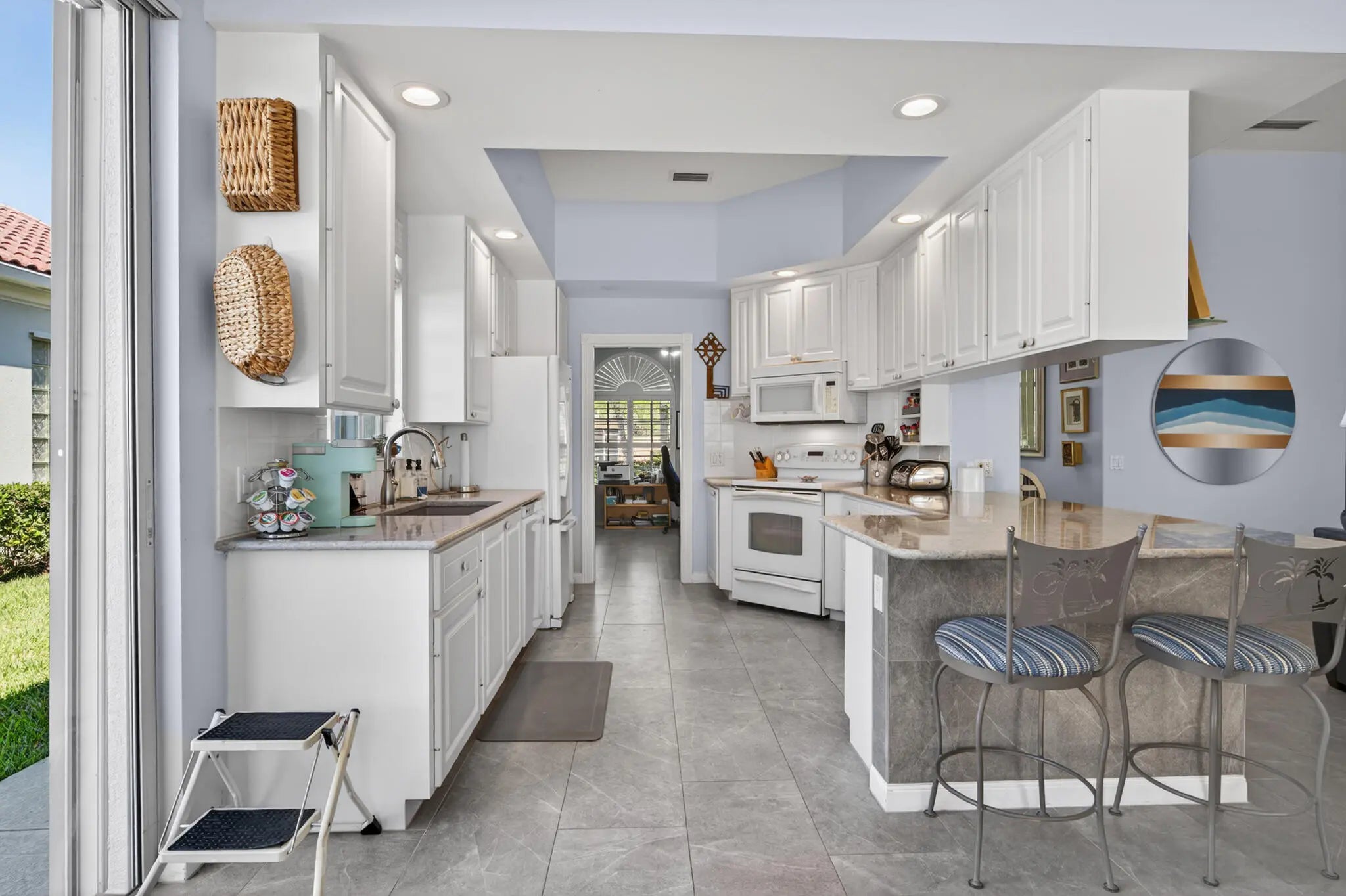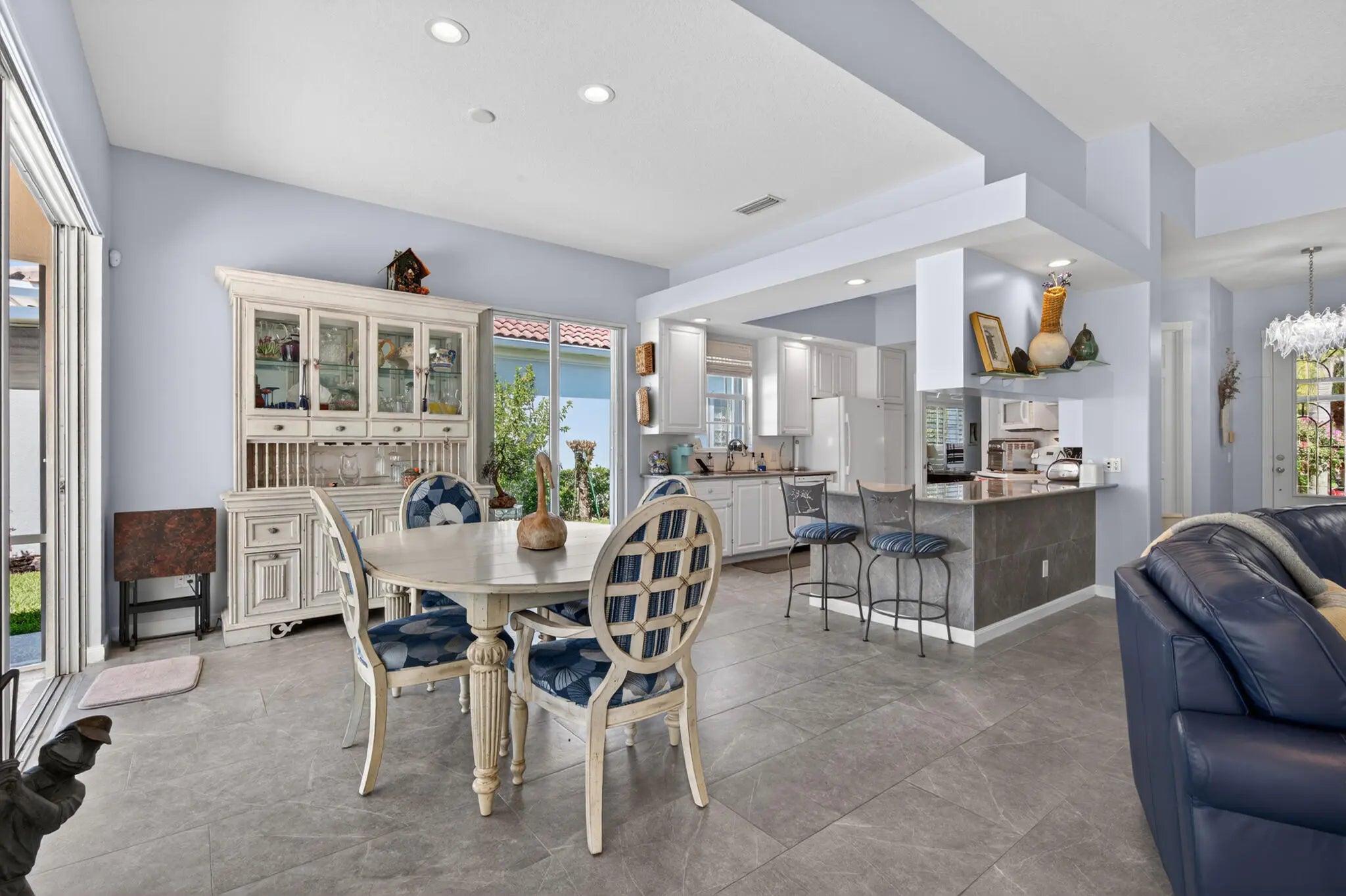 Located in a highly desirable Tradition community, this original owner home sits on a premium corner lot surrounded by water on two sides. A standout feature is the expansive L-shaped driveway, providing ample parking for family and friends. Step inside through the screened entryway and you'll immediately notice the upgraded tile flooring in the living room, kitchen, and den. The glass sliders leading to the pool feature original etched glass artwork that add a unique touch, and the den/study features custom plantation shutters. The kitchen has been updated with stone counters and convenient drawers. The spacious living areas flow seamlessly to the outdoor oasis, where you'll find a heated, screened-in pool and a freshly painted pool deck, perfect for relaxing while enjoying the stunning water views in all directions! The owner's suite offers a true retreat with fully remodeled his-and-hers bathrooms, featuring new cabinetry, tile, and etched shower glass. There is ample closet space for all your stuff! Major system updates include a brand-new 2026 air conditioning system and this home's exterior has been freshly painted in February 2026. Even the garage has been upgraded with a custom floor, reflecting the same level of care found throughout the property. The enhanced landscaping makes this home stand out in this gated neighborhood within walking distance to shopping and dining in Tradition square! HOA amenities include cable, internet, alarm, lawn care, exterior painting, 24 hour manned gate, clubhouse with social activities, gym, pickleball, tennis, 2 heated pools.