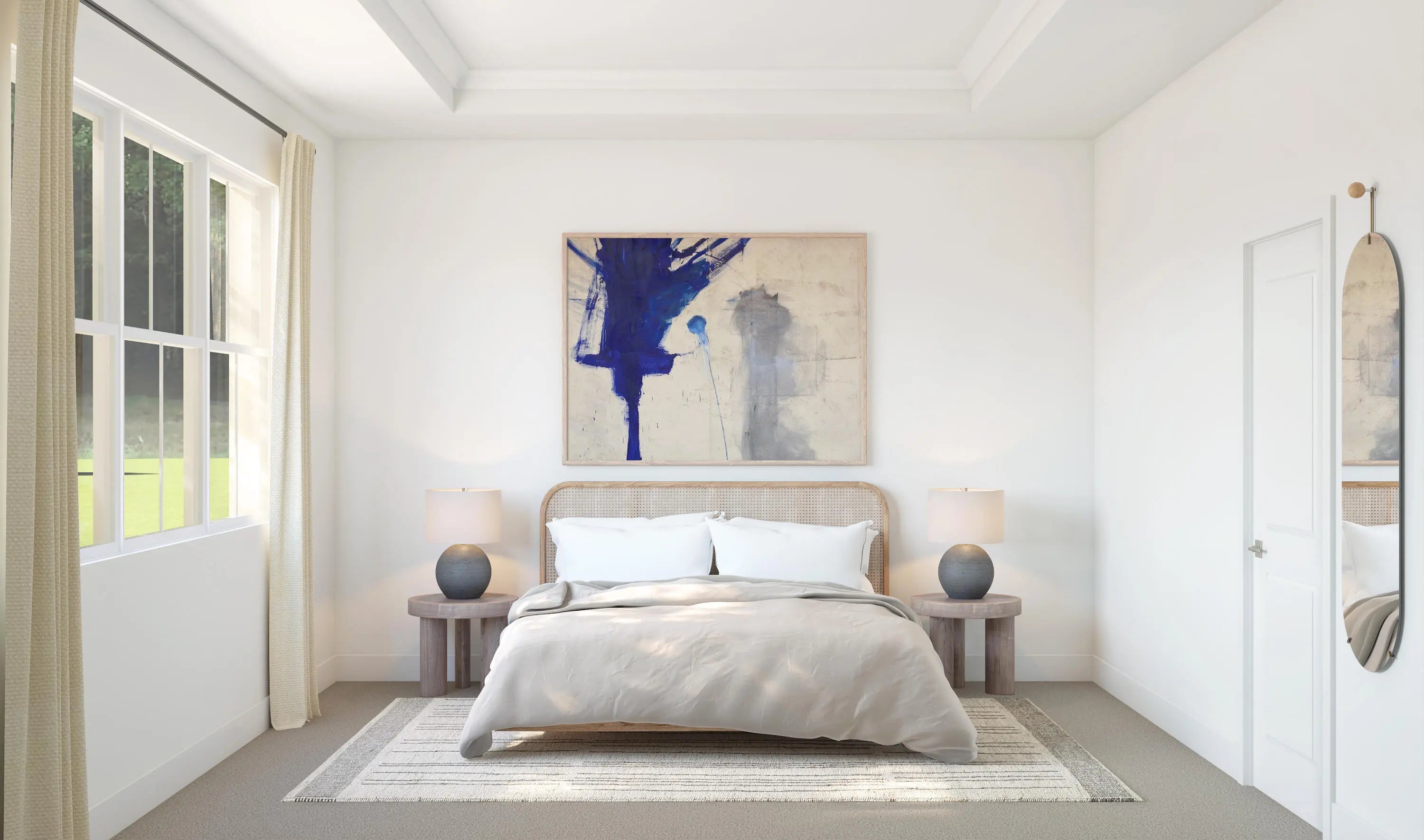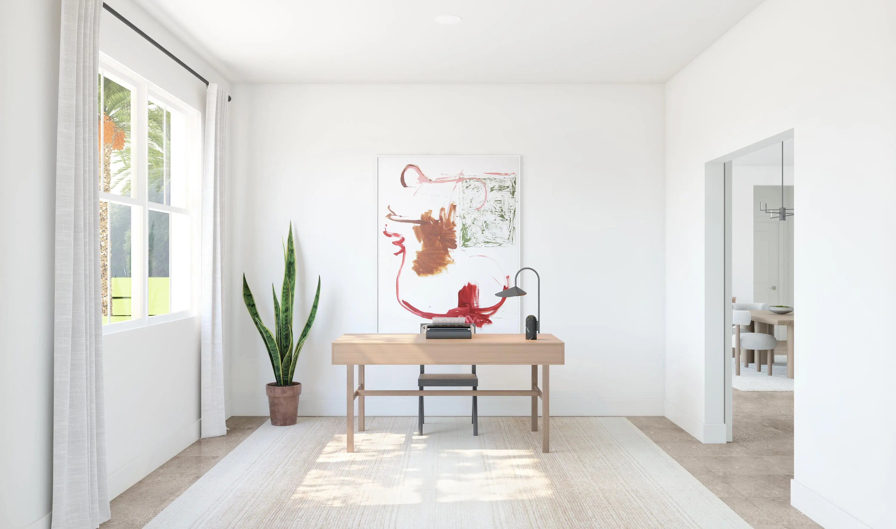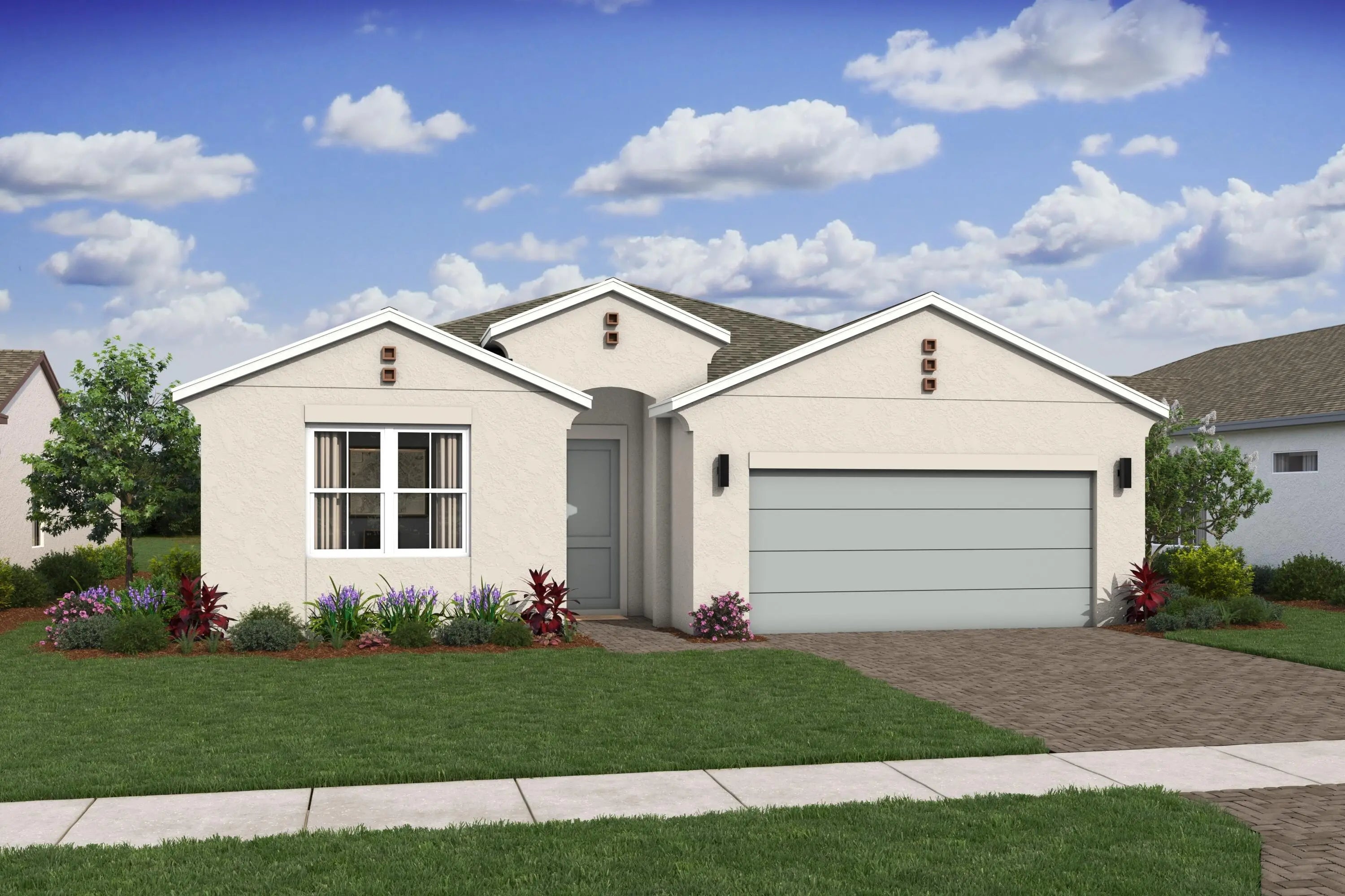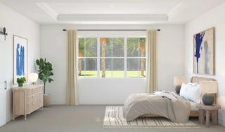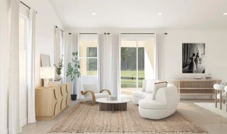 The Taylor showcases a spacious great room with soaring vaulted ceilings and serene preserve views, creating an open and inviting atmosphere. The well-appointed kitchen features designer cabinetry, a large pantry, and a center island that overlooks the main living space, making it ideal for both everyday living and entertaining. A striking vaulted ceiling seamlessly connects the dining area and great room, enhancing the home's airy feel. This thoughtfully designed split floor plan includes two bedrooms and two-and-a-half bathrooms, along with a private home office complete with stylish barn doors—perfect for remote work or quiet study. The tranquil primary suite offers elegant ceiling details, a generous walk-in closet, and a polished en-suite bath with dual vanities and a spacious shower. Additional highlights include an inviting covered patio with a 12-foot multi-slide door for effortless indoor-outdoor living, as well as an attached three-car tandem garage that provides ample parking and storage.