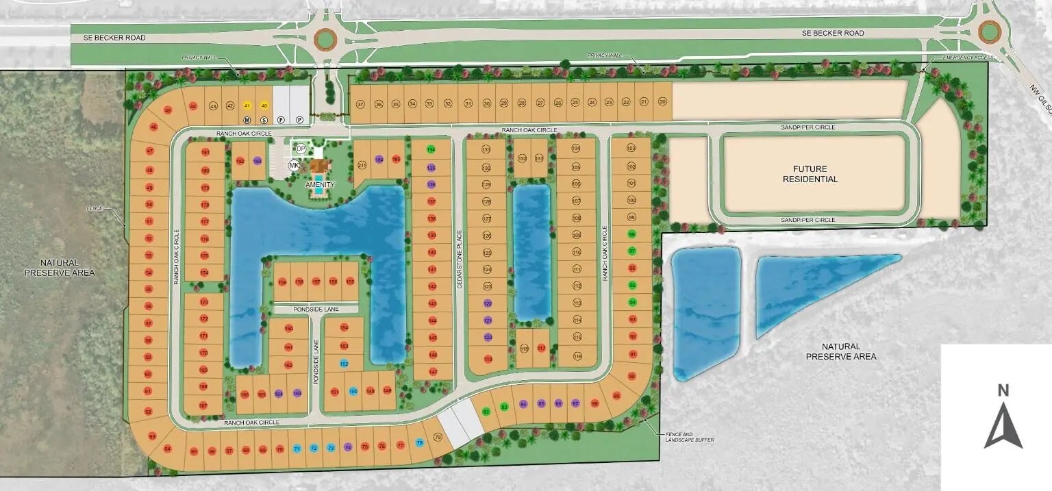 What's Special: Dedicated Study. New Construction - September Completion! Built by America's Most Trusted Home Builder. Welcome to the Grenada at 604 SE Ranch Oak Circle in Veranda Oaks! This inviting new home offers a bright central living space with luxury vinyl plank flooring flowing through the main living area and into the primary suite and walk in closet for a warm cohesive feel. The great room connects to the dining area and kitchen with quartz countertops, a large island, step in pantry and apron front sink. Sliding doors open to the lanai. The private primary suite features a tray ceiling, ensuite bath, walk in closet with laundry access, plus three additional bedrooms, two full baths, a study and impact windows. Photos are for representative purposes only. MLS#B26009830 Conveniently located near the Martin County line with easy access to the Florida Turnpike, you're close to beaches, recreation, shopping, medical facilities, and Treasure Coast attractions. This gated 56 acre community features two lakes and an amenity center with a pool, cabana, dog park, playground, and covered seating. Additional Highlights Include: Gourmet kitchen, study in place of flex, tray ceiling at primary suite, shower in place of tub at bath 3, door at primary closet to laundry, 8' interior doors, sot close doors and drawers at kitchen, and impact windows.