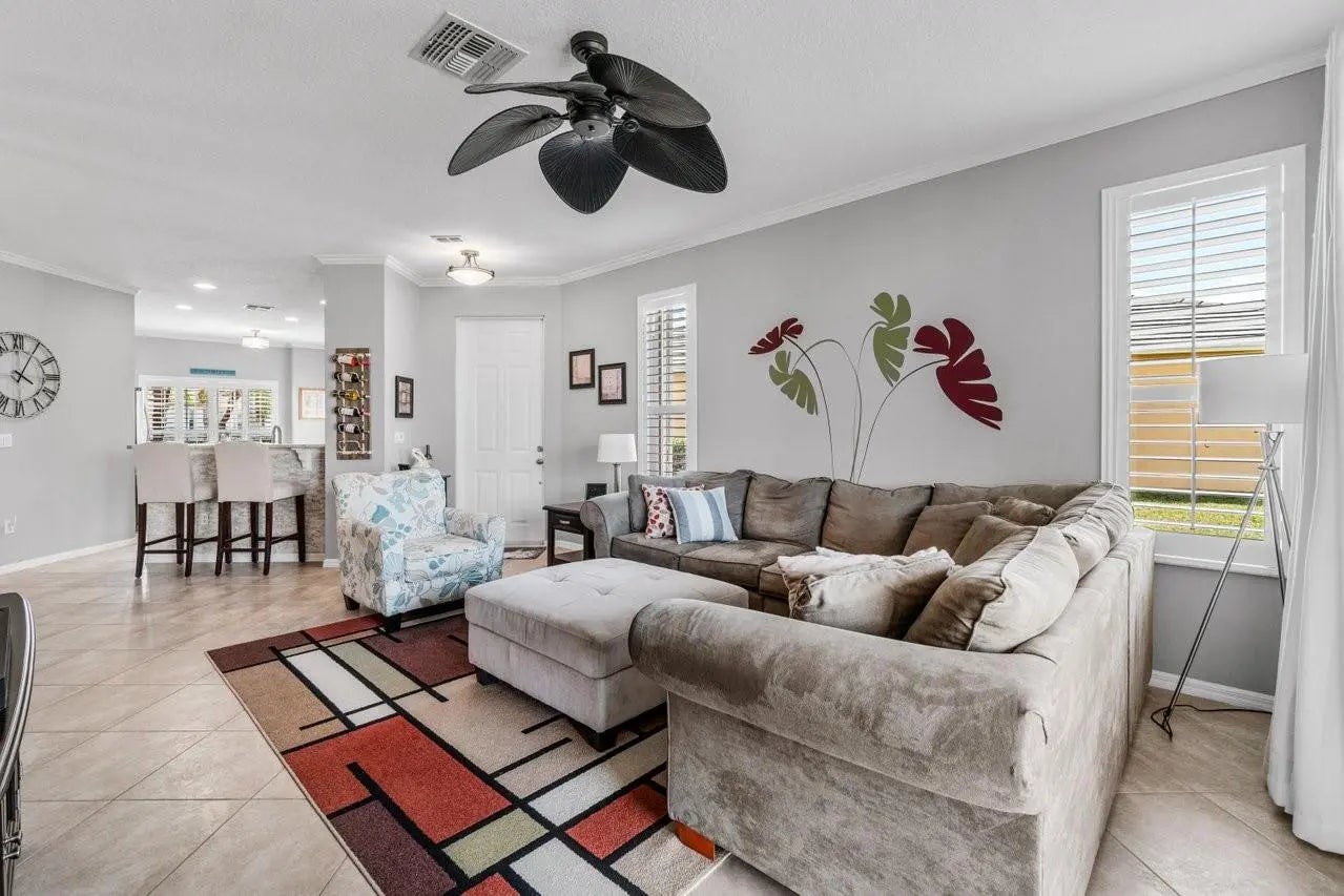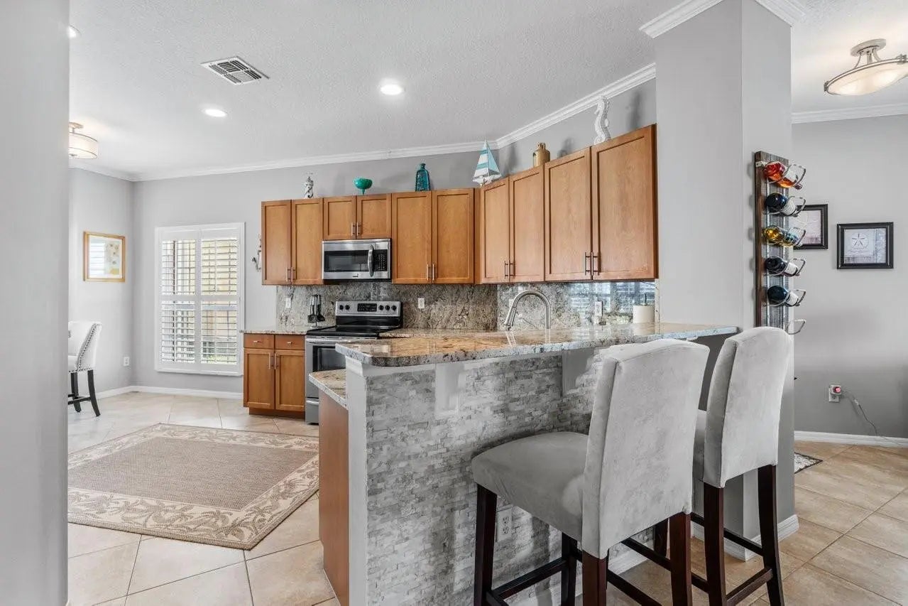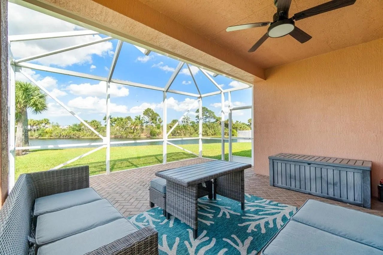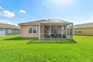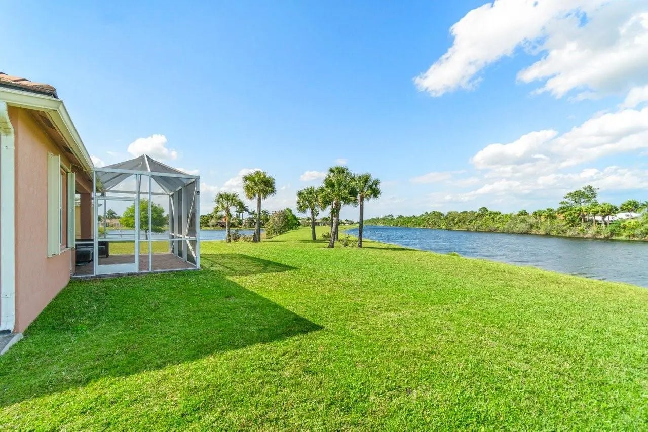 Welcome to the" Twins Waters Preserve" Heritage Oaks 3bed 2bath home nestled in the much sought after guard-gated Tradition. First floor entry leads to a spacious living room overlooking tranquil waters and unblocked preserve. With enough room for a pool the backyard can be enjoyed from the spacious screened in oversized patio. Granite counter tops and a breakfast nook complements a kitchen full of storage space and a separate laundry room. The spacious master bedroom overlooks the water and preserve has a walk-in closet and a double sink bathroom. Plantation shutters through out. Low HOA includes lawn maintenance, pest control, basic cable, high speed internet, a pool, fitness center and a fully kitchen gathering lounge completes this all ages, pet friendly community.