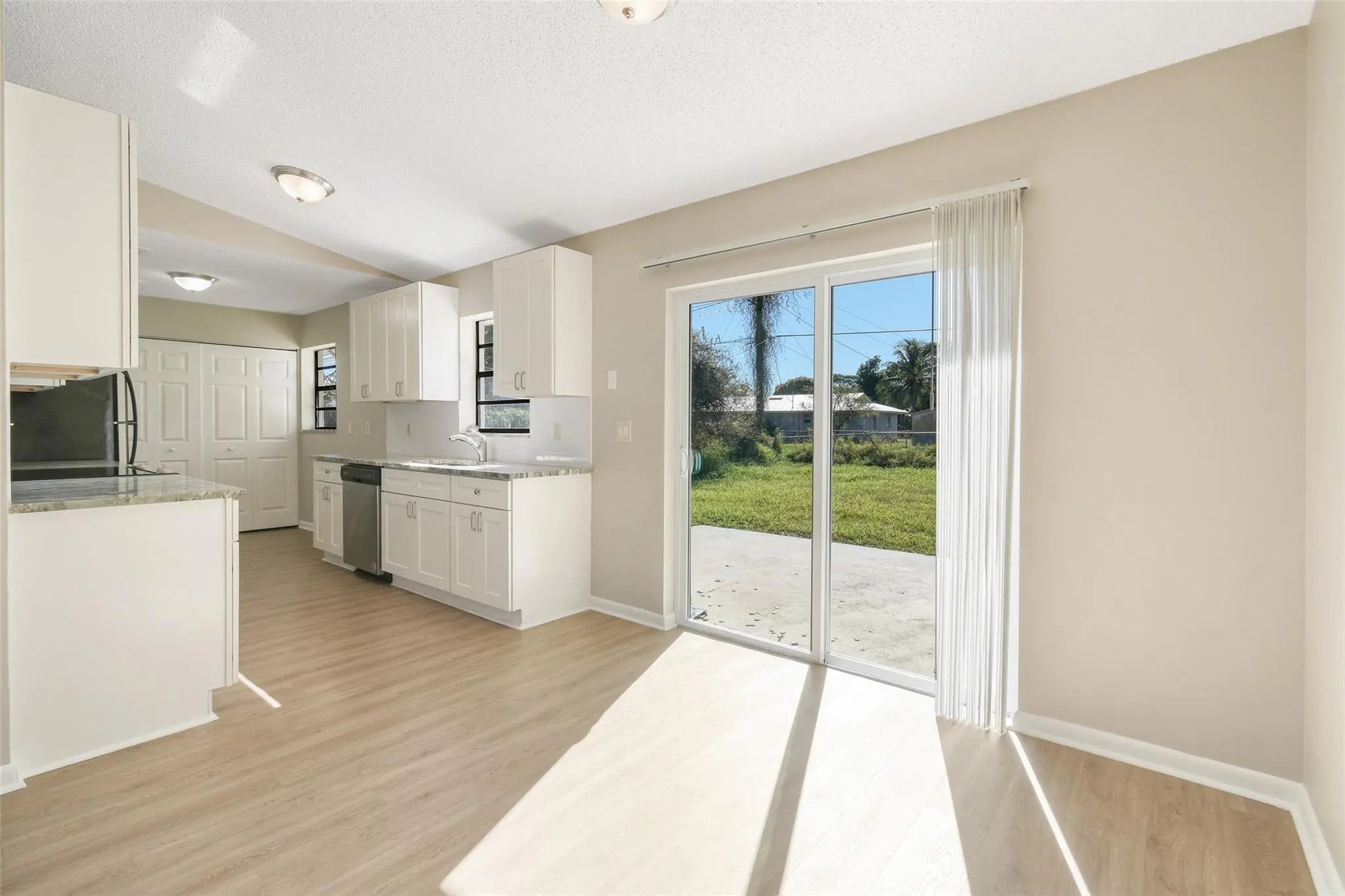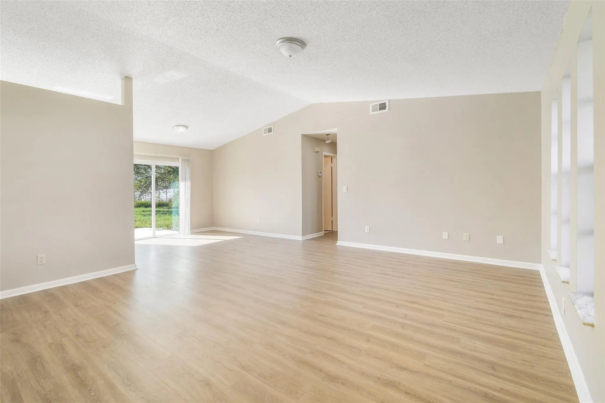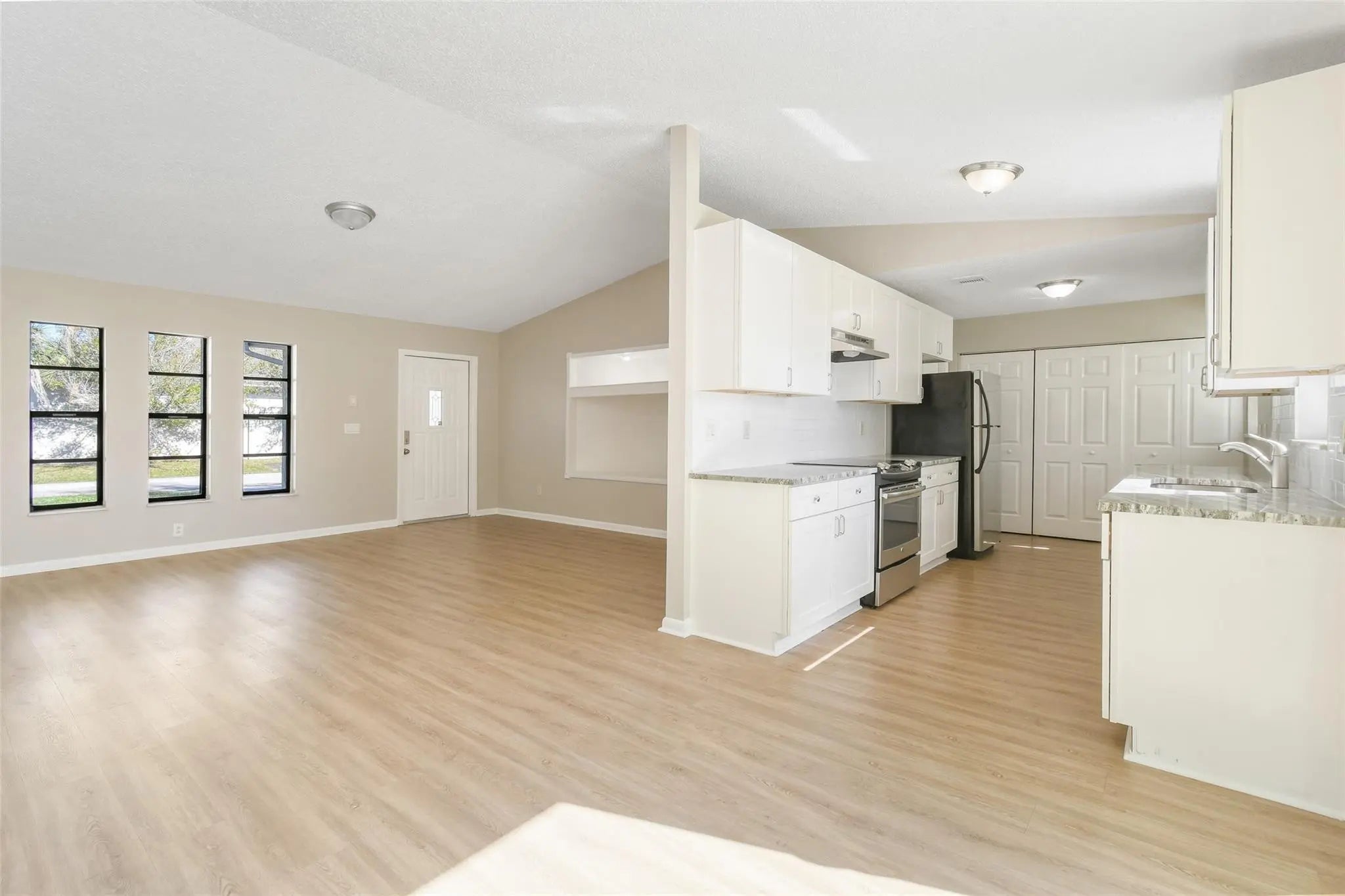 This move-in ready home features a bright, open floor plan with fresh neutral finishes throughout. The spacious living and dining areas flow seamlessly into the kitchen, which offers white cabinetry, ample counter space, and sliding glass doors that bring in abundant natural light and provide easy access to the backyard. Bedrooms are generously sized, including a large walk-in closet for added storage. The updated bathroom includes a modern vanity and fixtures. Enjoy the convenience of an indoor laundry area and an attached one-car garage. Outside, the expansive backyard offers plenty of room for entertaining, pets, or future customization. Conveniently located near shopping, dining, and major roadways. Schedule your showing today! New AC in 2024!