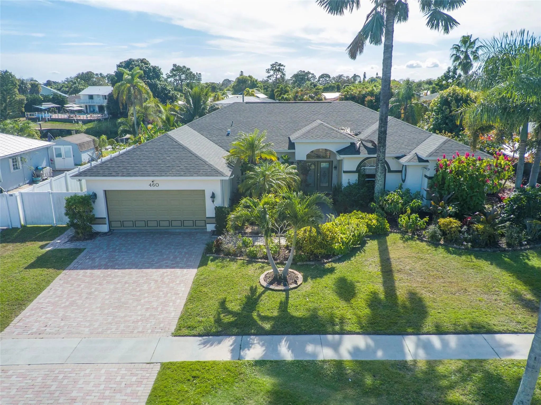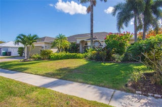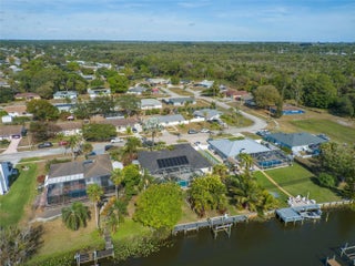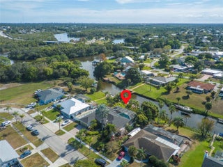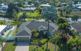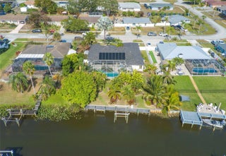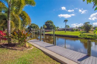 Welcome to an opportunity to own a luxurious 4-bed, 3-bath waterfront estate where refined living meets boating lifestyle. This residence delivers privacy, upgrades, and direct water access—w/out HOA restrictions. 90ft of waterfront, new poured concrete seawall and a private dock with premium composite decking. Electric boat lift accommodating vessels up to 25ft. Only one fixed bridge, easily navigable with a T-top, to enjoy access to open waterways. Inside,upgrades include a new roof and new A/C system (2024),a water filtration system and garage has an electric vehicle charging port. A screened lanai overlooks the water and a heated inground pool powered by rooftop solar panels,separate hot tub-perfect for serene evenings. Grounds has mature fruit trees,creating a tranquil, private oasis.