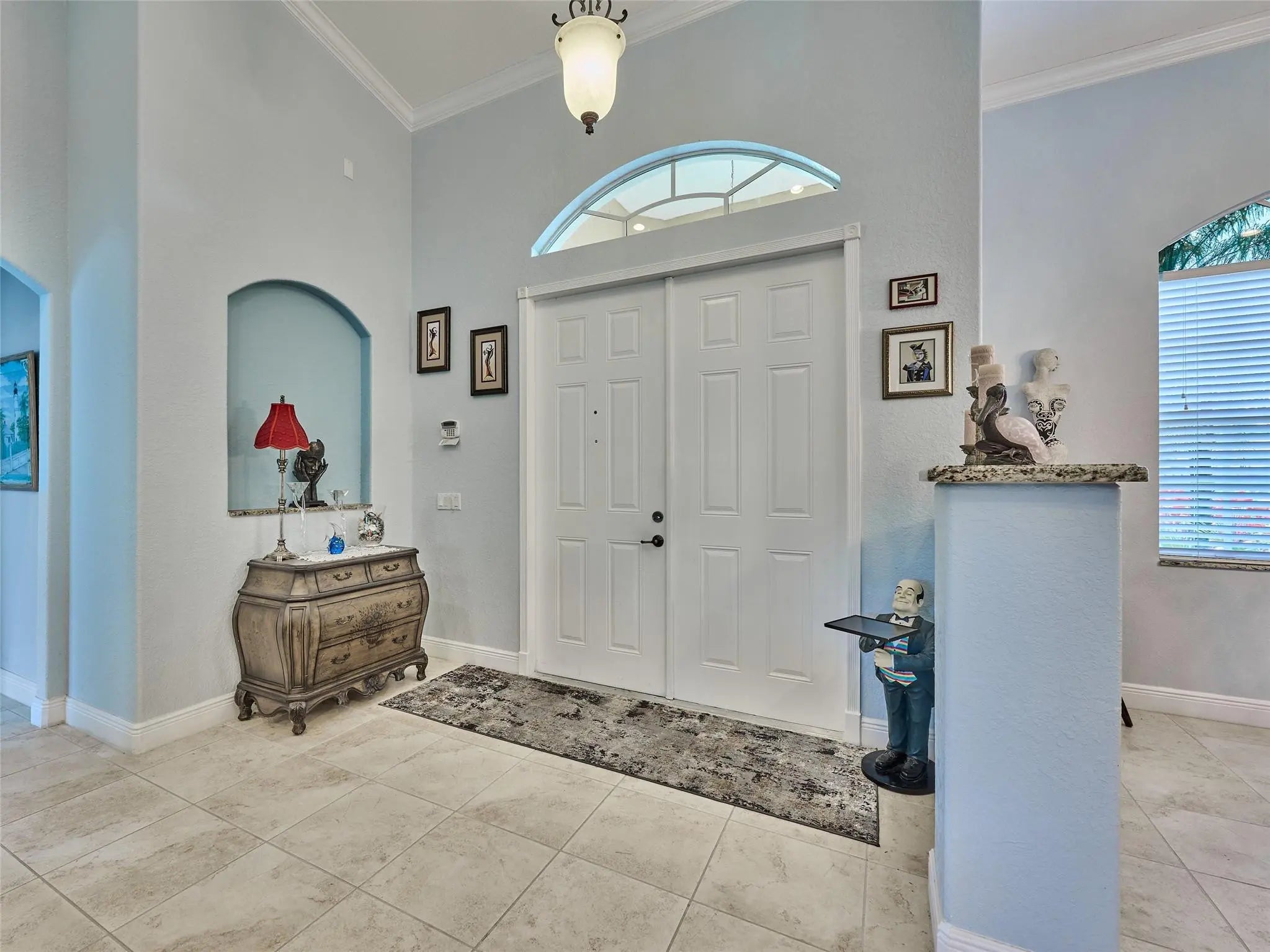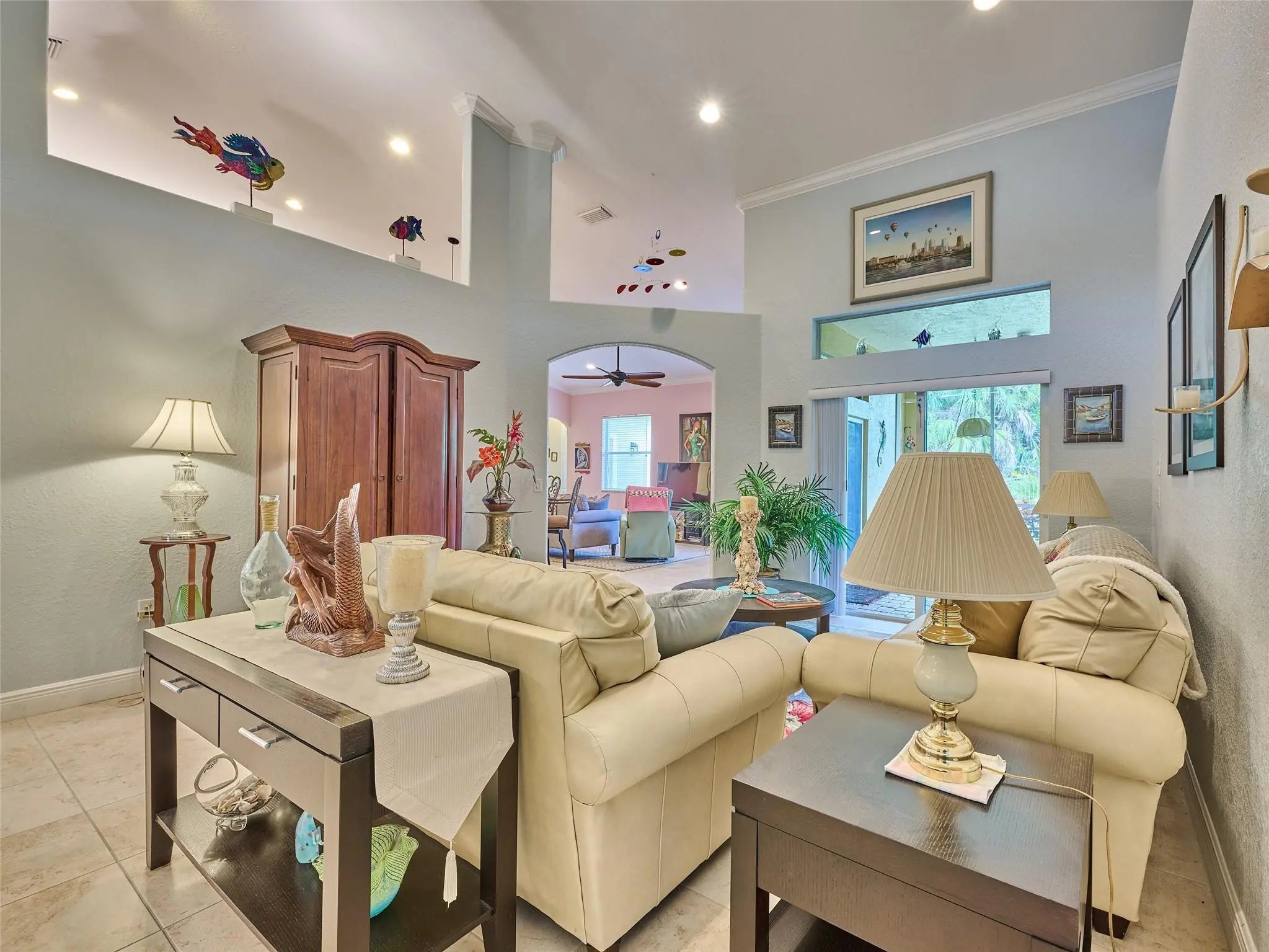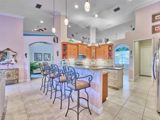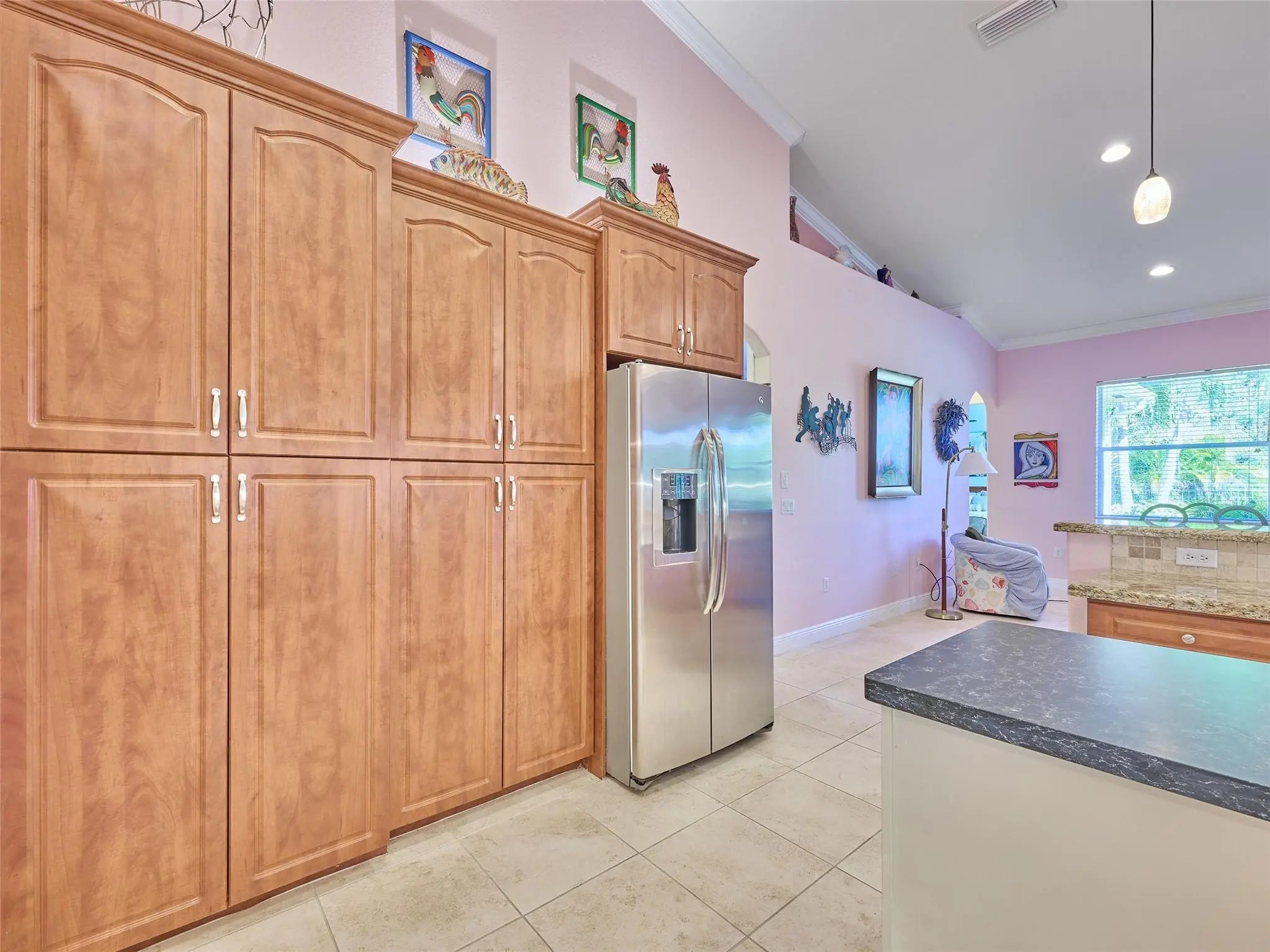 Welcome to this beautifully maintained 4 bed/3 bath residence featuring a beautiful kitchen equipped with granite countertops and stainless steel appliances, elegant crown molding, bathrooms adorned with stone tile, and tile flooring throughout. With vaulted ceilings up to 15 feet, this home feels spacious and inviting. Additional highlights include a newer AC unit (5 years), recessed lighting, and a split floor plan for added privacy. Enjoy the serene, screened-in patio and the fully enclosed fenced yard, perfect for relaxation and entertaining.
