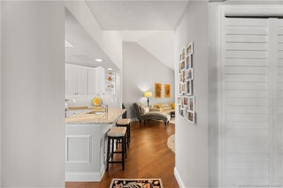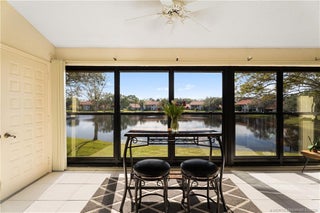 Premier 55+ community w/ lush landscaping and direct lakefront location! This immaculate second floor condo has 12ft vaulted ceilings enhancing views, no one above, quieter, open living area, remodeled kitchen w/open views from kitchen, granite counters, upgraded white cabinets, SS appliances, remodeled baths, luxury engineered wood flooring & more! Ground level courtyard w/ room for a bistro set, storage for bikes & grill. At the front door, there is an open patio inviting you for a casual outdoor break. The glassed-in patio has awesome wide lake views and is ideal for entertaining. The main bedroom has lake views, 2-walk-in closets, remodeled bath w/ huge walk-in shower. Guest suite privately located at opposite end. Recreational activities: pickleball, tennis, social events, club house, 2 pools, spa, add’l cabana, and beautiful walkways to enjoy the great outdoors. Sm. Pet & truck ok. Gated entry. Furn negotiable. (2-story bldg. does not require Milestone Report, etc.)