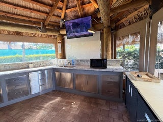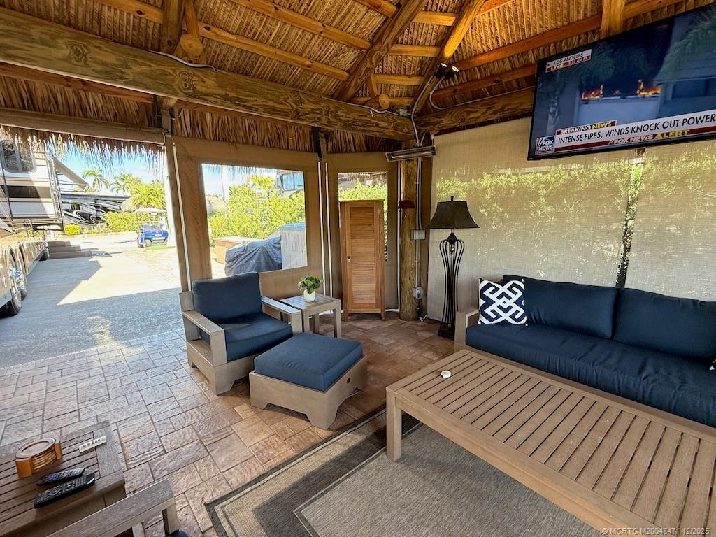 Perfectly situаted nеar thе bocсe and tennis courts, thіs lοt offers the ideal balance of convenience and seclusion, thanks to the surrounding green space and lush landscaping. Designed for relaxation and entertaining, this property truly has it all. The large tiki hut features a built-in granite-top kitchen with plenty of counter space, making it perfect for hosting large gatherings. Custom isinglass panels provide comfort on chilly days, while the stylish furnishings include a dining table and chairs, as well as two TVs—ideal for enjoying sports games or movie nights with friends and family. For your furry companions, there’s a designated area with artificial turf, offering a safe and comfortable space for pets. To top it all off, the property comes move-in ready with a golf cart included, so you can start enjoying your new lifestyle right away. Whether you're a sports enthusiast, an entertainer at heart, or someone seeking a pet-friendly oasis, this lot is a must-see.