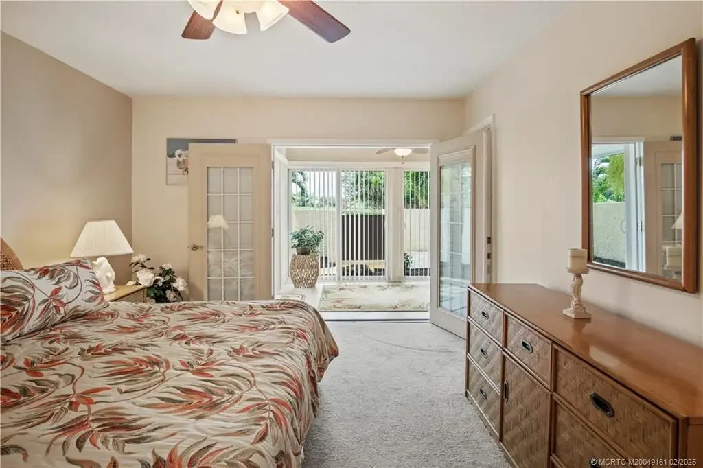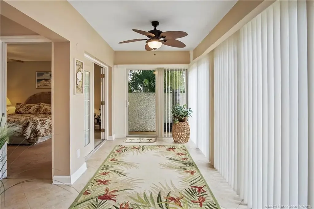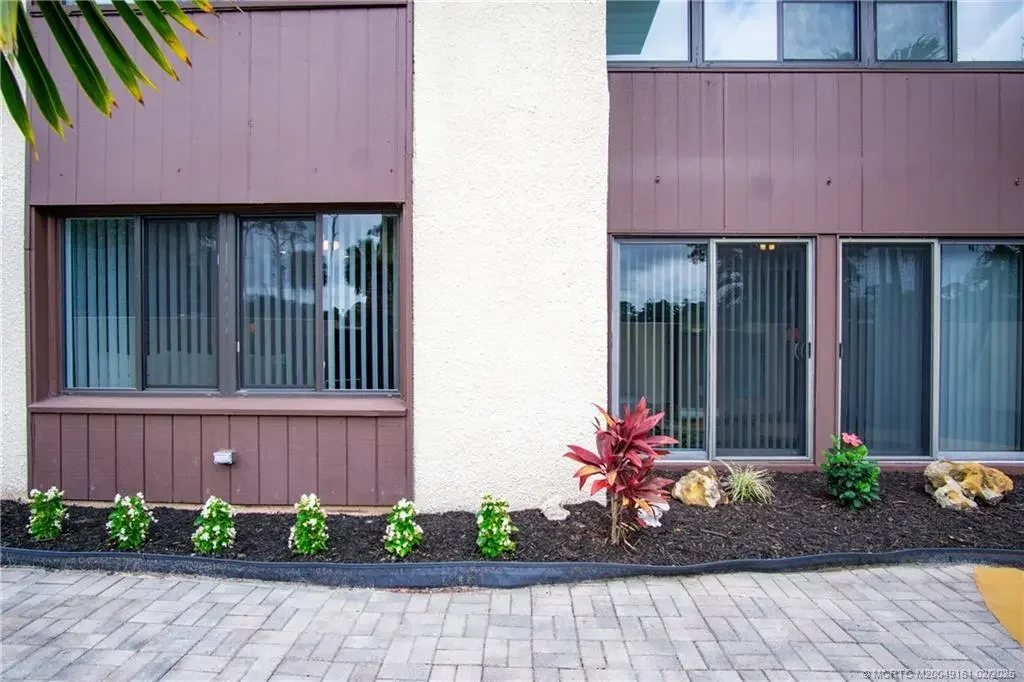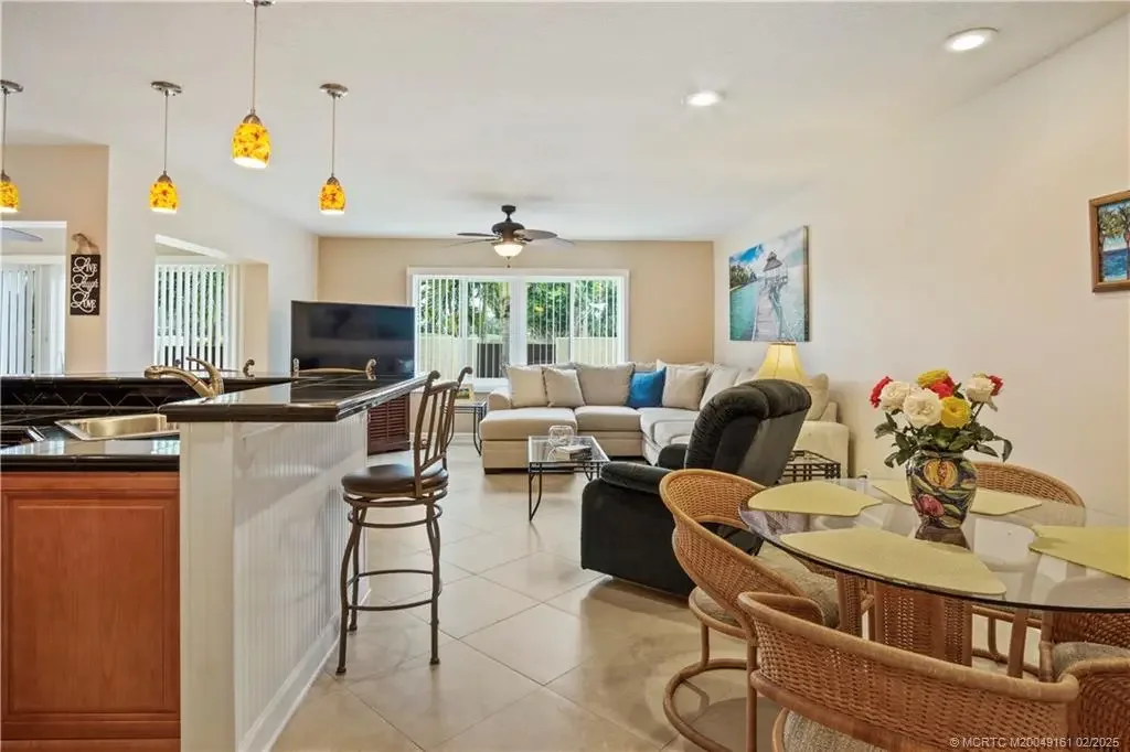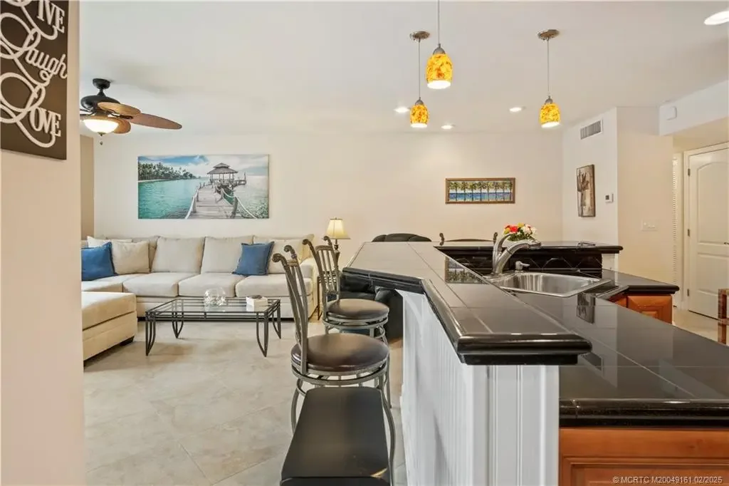 Dine Al Fresco on your large, enclosed, patio (740 sq feet) and enjoy golf course and sunset views, This is a one-of-a-kind Conquistador first floor condo. It is the only unit of 288 that has the kitchen island facing out to courtyard with the sink and dishwasher accessible. It is totally updated to the highest standard, black granite on all countertops, tiled bathrooms, ALL the windows are impact, W.D in unit, outside patio has sprinkler system that allows for carefree maintenance. There is Smart free thermostat controlled from your phone. Community has 3 pools, fishing pier, active clubhouse, gym, tennis, pickleball, dog park, game room, and is next to Martin County Golf Course. Drive 5 minutes to beaches, hospitals (no train tracks on the way) shops and restaurants.