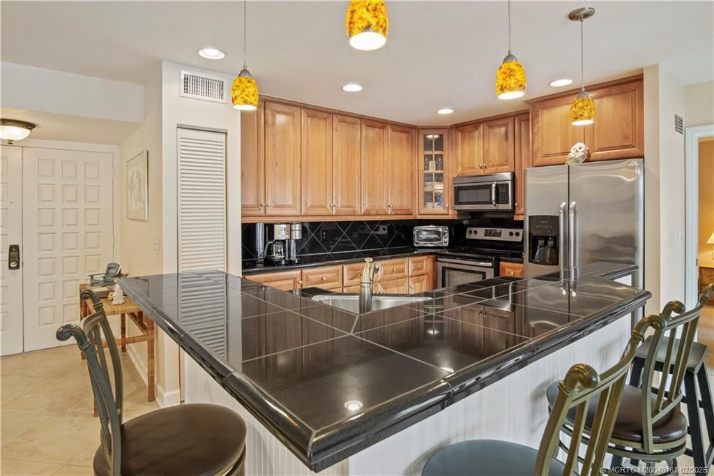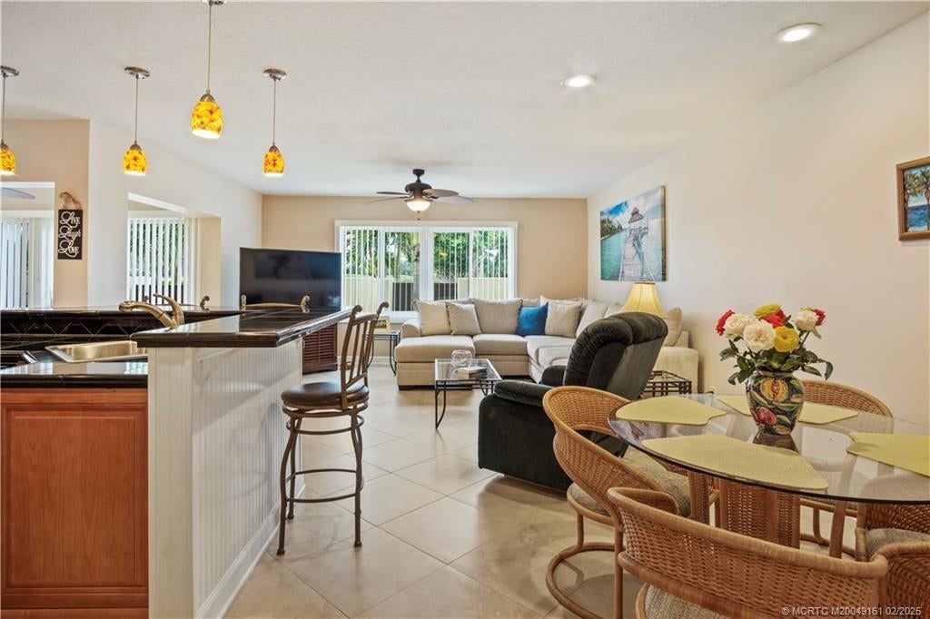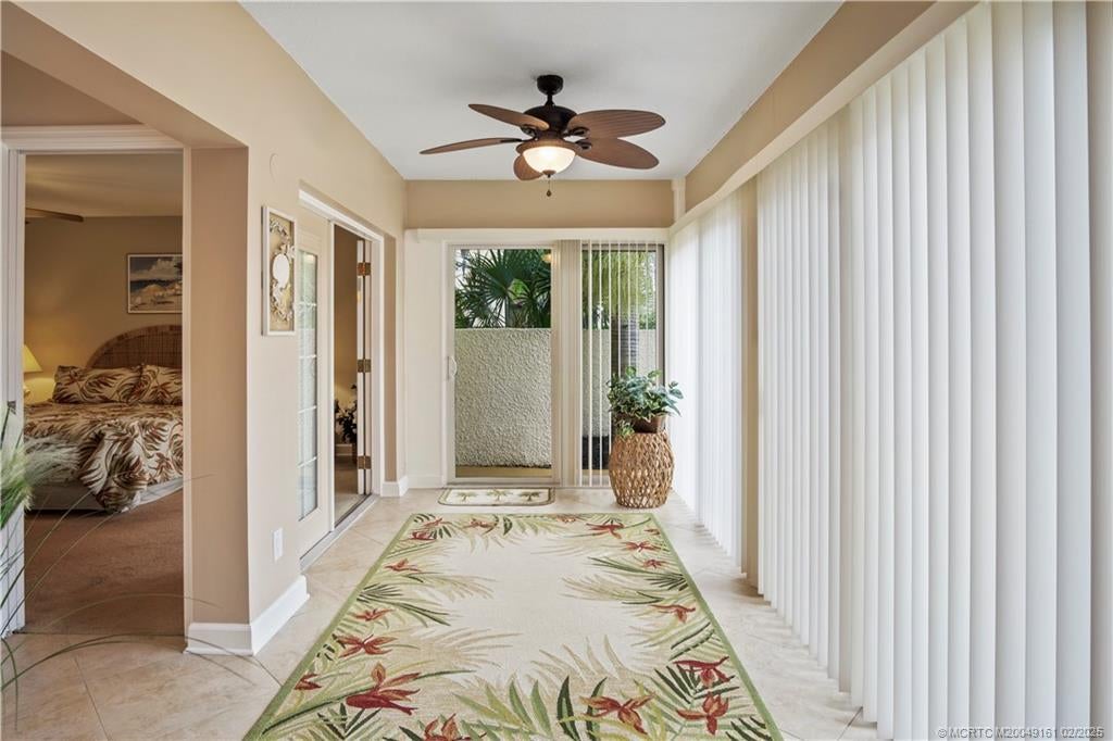 Dine Al Fresco οn yοur largе, enclοsed, patio (740 sq fеet❩ and enjoy golf course and sunset views, This is a one-of-a-kind Conquistador first floor condo. It is the only unit of 288 that has the kitchen island facing out to courtyard with the sink and dishwasher accessible. It is totally updated to the highest standard, black granite on all countertops, tiled bathrooms, ALL the windows are impact, W.D in unit, outside patio has sprinkler system that allows for carefree maintenance. There is Smart free thermostat controlled from your phone. Community has 3 pools, fishing pier, active clubhouse, gym, tennis, pickleball, dog park, game room, and is next to Martin County Golf Course. Drive 5 minutes to beaches, hospitals (no train tracks on the way) shops and restaurants.