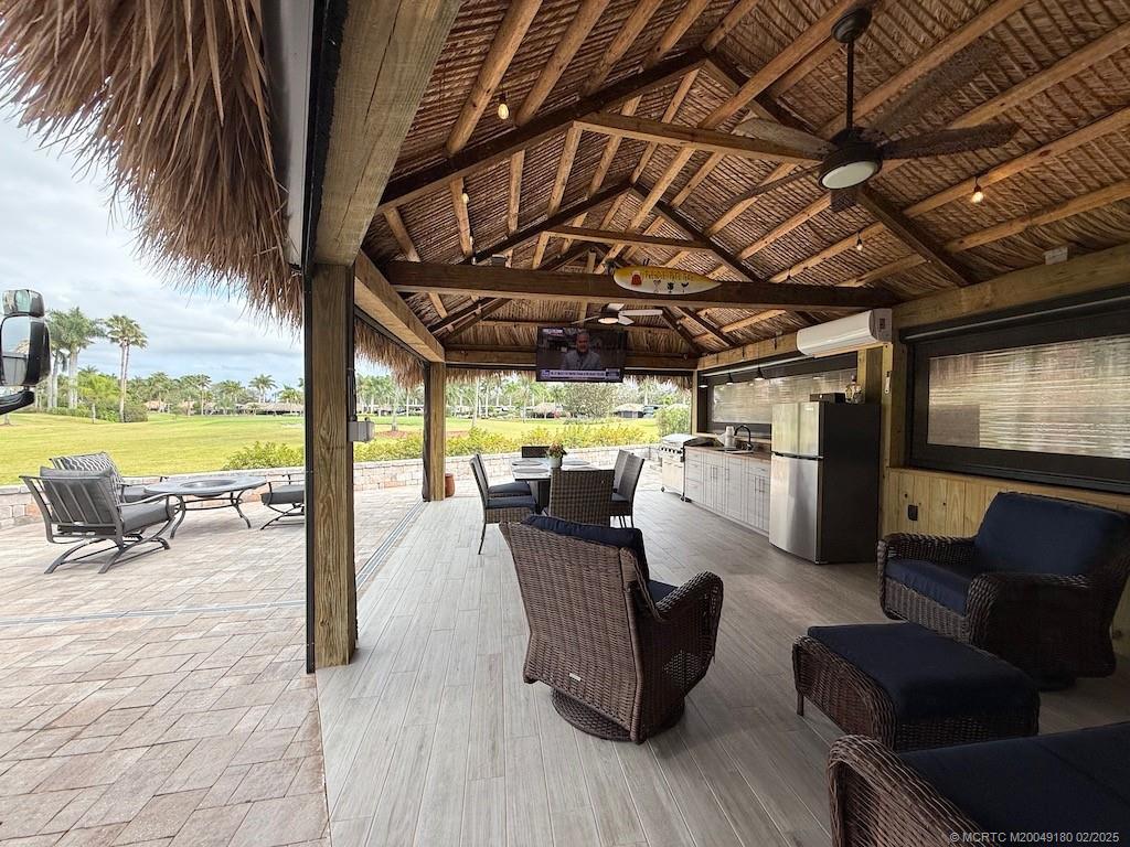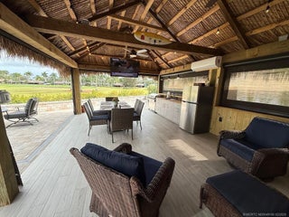 Spectacular Buildout – A True Hidden Gem! At first glance, this pull-in lot may seem like a standard tiki, but step inside, and you’ll discover a beautifully crafted post-and-beam pavilion, featuring stained structural beams that add a touch of rustic elegance. The enclosed tiki offers the perfect balance of privacy and comfort, with a combination of eisenglass and motorized screens for year-round enjoyment. Inside, a well-appointed built-in kitchen, tile flooring, and a partial wall create a warm, inviting atmosphere that feels like home. Positioned facing the golf course, this lot provides breathtaking views while maintaining privacy with a spacious, fully pavered patio—ideal for relaxing or entertaining. Move-in ready and thoughtfully designed, this one-of-a-kind lot has everything you need to start enjoying the luxury RV lifestyle today!