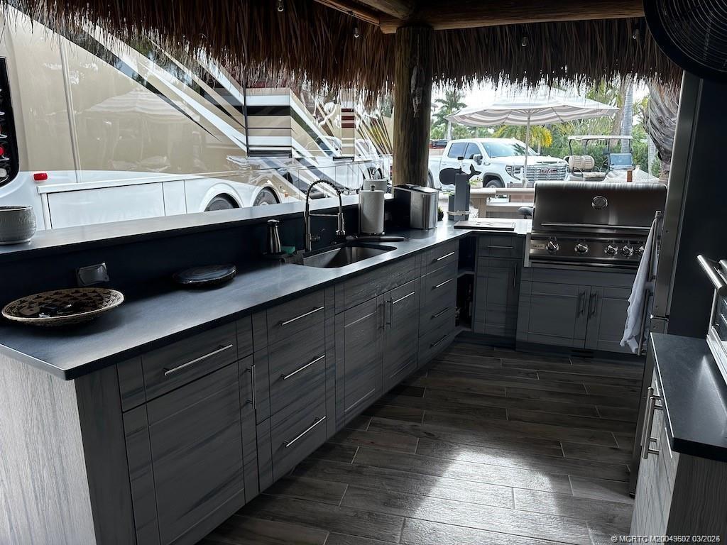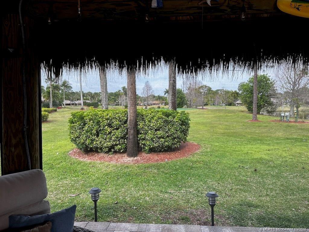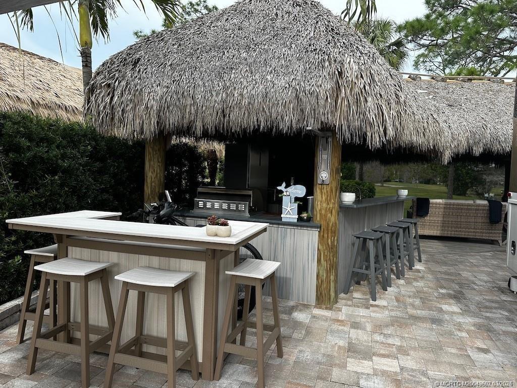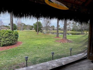 This expansive 3403 sq ft lot is a gem nestled directly across from the main clubhouse, with convenient access to sports facilities and more. Step into a realm of modern elegance, where a newly constructed, generously sized tiki and contemporary-style patio pavers spanning the entire lot create an inviting atmosphere of sophistication. Indulge in the art of entertaining with a custom-designed kitchen featuring marine-grade cabinets, ensuring both functionality and style. Bask in views of the lush rolling greens of the golf course and the expansive lake adorned with illuminated fountains, transforming your outdoor space into a sprawling 2-acre backyard retreat. Enhanced by mature landscaping, privacy abounds, allowing you to fully immerse yourself in serenity and tranquility. Experience the epitome of luxury living in this unparalleled setting, where every detail is meticulously crafted to elevate your lifestyle.
