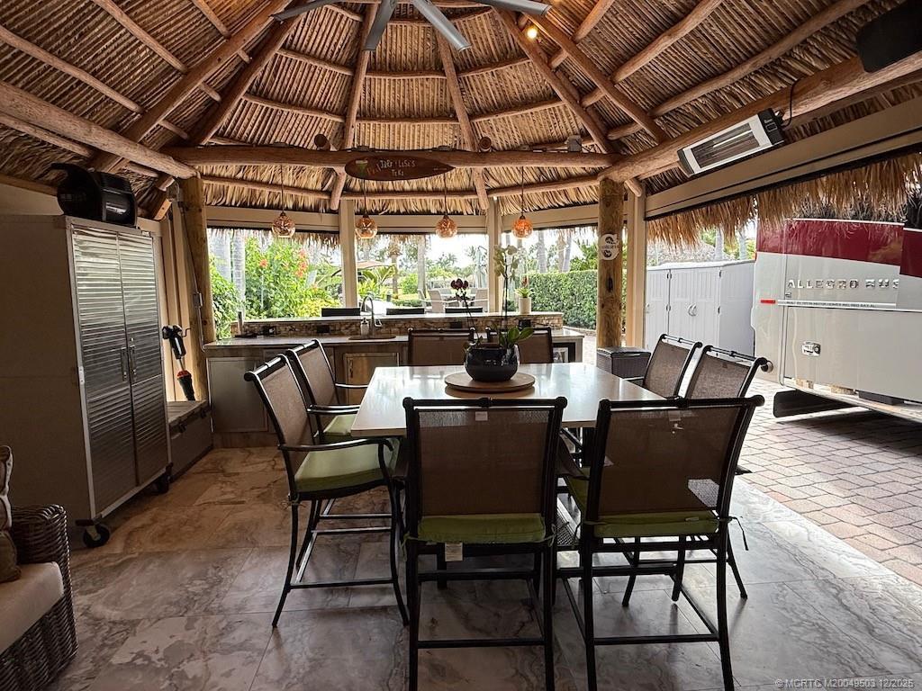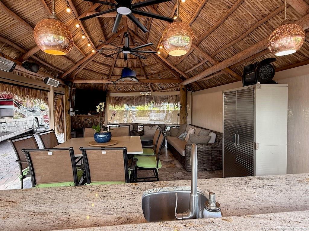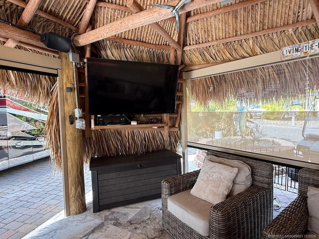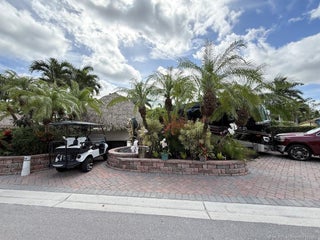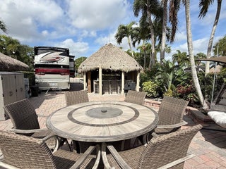 Welcome to one οf the mοst bеautiful lοts in the resort! Thiѕ ovеrsized 3,757 sq ft corner lot is perfectly positioned along the golf course, offering peaceful views of the lake and fountain, all framed by mature landscaping for added privacy. The large tiki with its soaring roofline creates a cozy, shaded living space, ideal for relaxing or entertaining, with plenty of room to spread out. The custom kitchen features granite countertops, a refrigerator, wine chiller, ice maker, and dishwasher—all beautifully finished with rustic barn board-style porcelain tile for a warm, inviting look. Outside, you'll find a raised circular seating area with a fire pit table—just one of the many private spots to unwind or host friends while still enjoying the tranquil golf course backdrop. With multiple areas for entertaining and plenty of space to make your own, this lot comes fully furnished, including grill and storage units. Park your coach, kick back and start enjoying the good life!