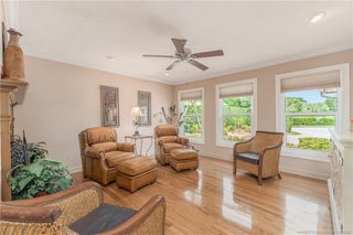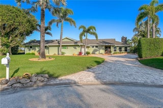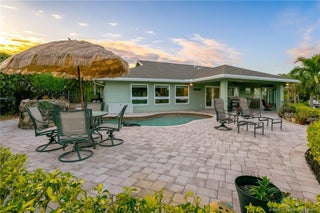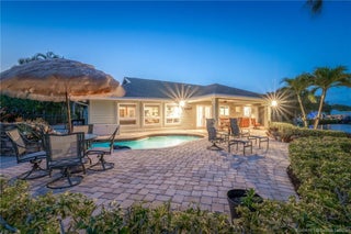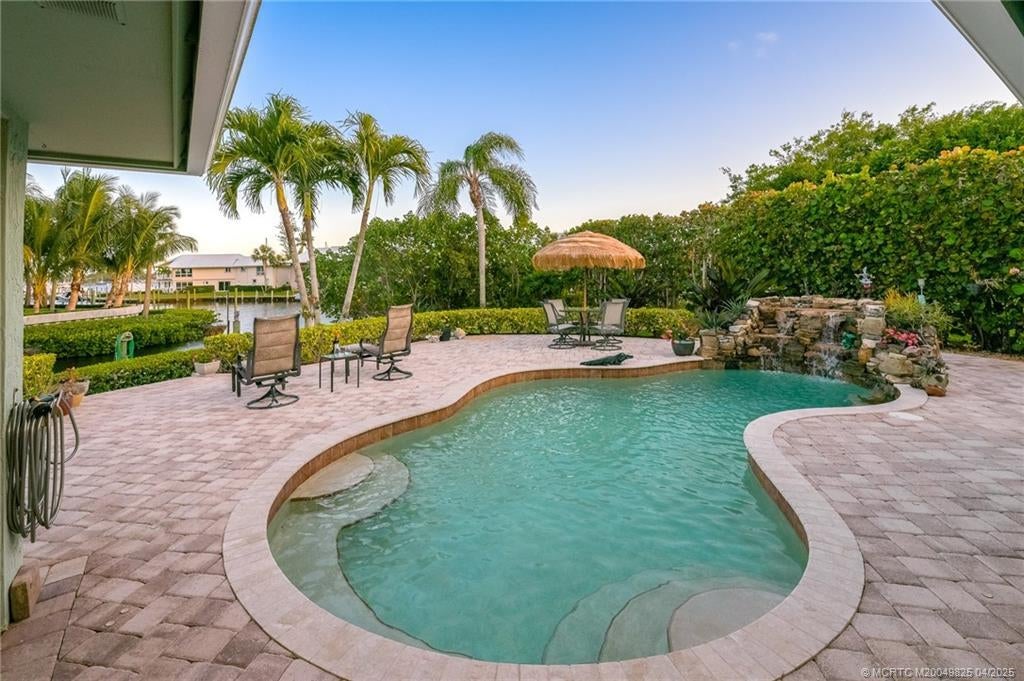 Fully Furnished & Turnkey, Beautiful Waterfront Pool Home, hardwood floors, lush landscaping. Very gently lived in by Snowbirds since 2006 w/approximately 147' water frontage on over .5-acre lot with views of Manatee Pocket. 40' dock w/a Hi-Tide 12,000 lb lift with TEC Remote Control & 4 new pilings added in 2014. Brazilian Ipe’ wood Dock equipped w/water, electricity, oversized mounted dock box, attached cleaning table. Easy, quick access to Manatee Pocket, no bridges to St Lucie Inlet. Have lunch by boat at a waterfront restaurant in the Pocket, then head to the Sandbar for all day fun in the sun, only 10-15 minutes via boat from the house. Covered Paver Patio, Summer Kitchen, heated saltwater pool w/natural rock waterfall on the waterfront & Impact Glass windows & sliders added by this owner. Also added, separate building w/flex space for a "man cave", guest suite or home office. Guard-gated waterfront community, Clubhouse, 2 Pools, Pickleball, 52-slip Marina w/gas, pump out, & ice.