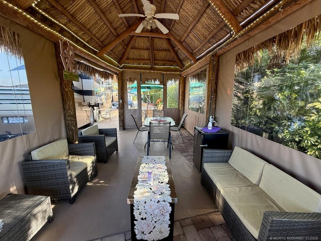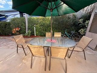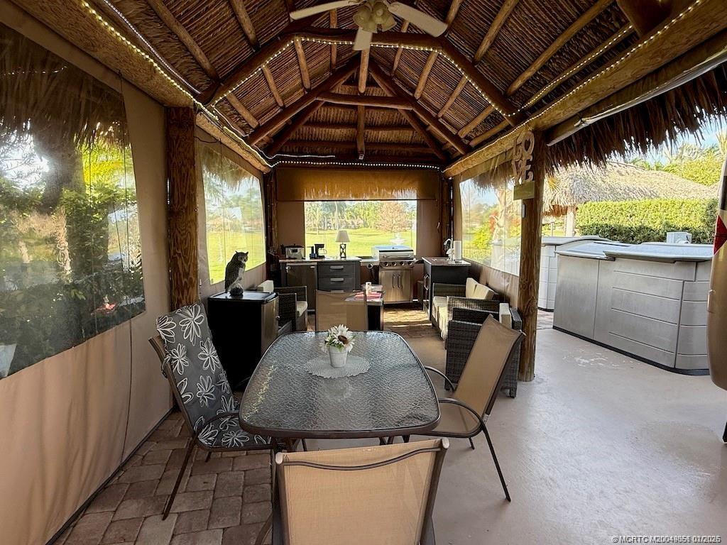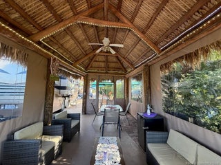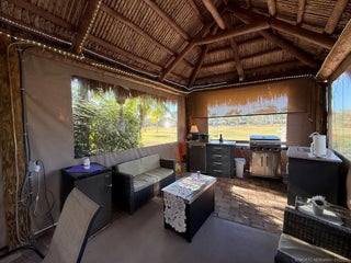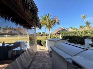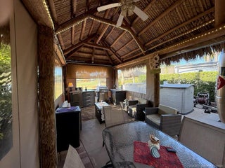 Make an offer! Discover the epitome of convenience and luxury in this exceptional listing, perfectly positioned between the serene north and east pools and the bustling central clubhouse. Enjoy the best of both worlds with a coveted north-facing orientation and breathtaking golf views from the rear. Step into the thoughtfully designed tiki, entirely enclosed with eisenglass curtains, creating a tranquil retreat for relaxation and entertainment alike. Indulge in the generous seating arrangement while the charming dining table for six sets the stage for memorable al fresco meals. The kitchen area is nicely equipped with a built-in refrigerator, grill, and sink with hot and cold water, ensuring seamless outdoor culinary experiences. Additional dining and seating areas out front provide versatility and space for gathering with loved ones. Don't miss out on the opportunity to experience luxury living at its finest. Schedule your viewing today and make this extraordinary property your own.