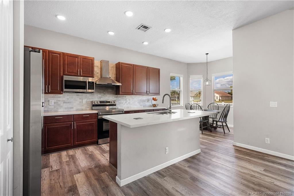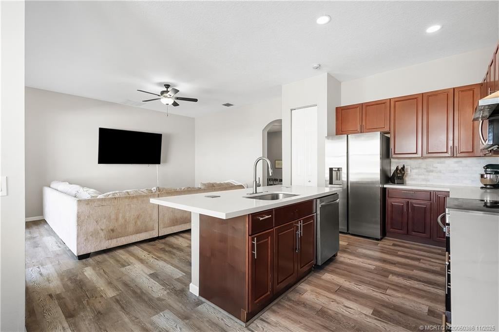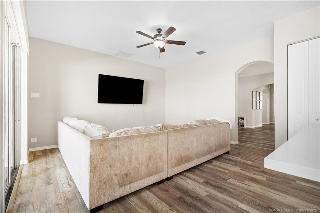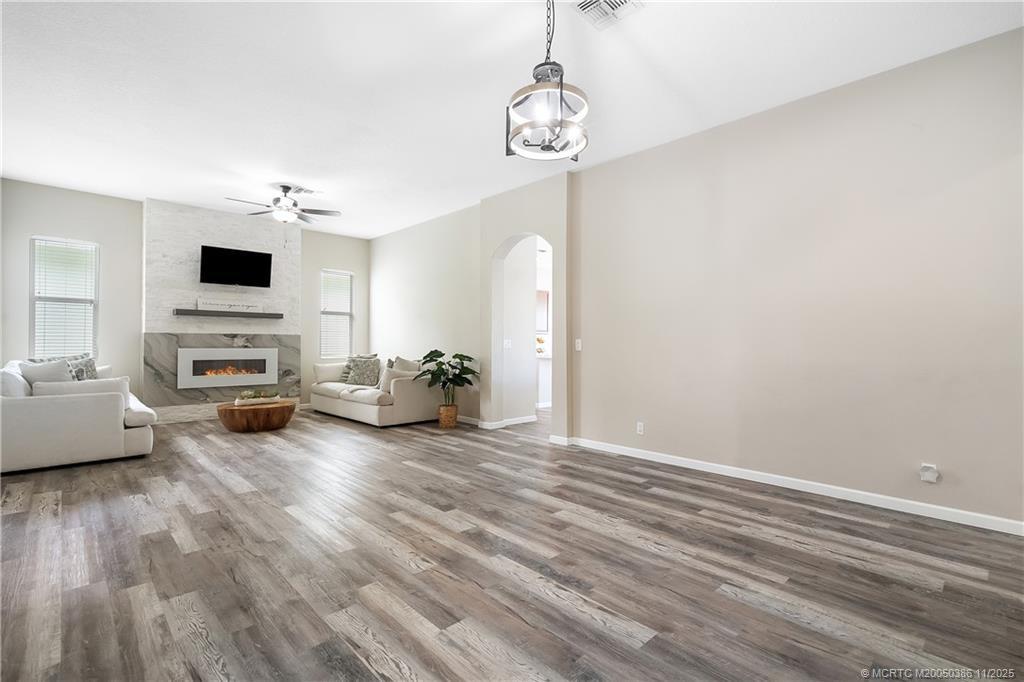 Beautiful 4-bedroοm, 3-bаthroοm lakefrοnt home in Magnolia Ꮮakеs, one of Port St. Lucie’s most sought-after gated communities. This spacious single-family home sits on a premium lakefront lot and features a desirable three-way split floor plan, perfect for privacy, multi-generational living, or a home office setup. Inside, you’ll find a bright open-concept layout with vaulted ceilings, luxury vinyl plank flooring, and large windows that fill the space with natural light. The updated kitchen stands out with Calacatta quartz countertops, modern white cabinetry, stainless steel appliances, and an oversized bar seating area—ideal for everyday living and entertaining. The inviting family room showcases a quartzite stone fireplace with LED accent lighting, adding warmth and style. Step outside to your screened-in patio and fully fenced backyard, where you can enjoy peaceful lake views and the Florida lifestyle year-round. Living in Magnolia Lakes means access to resort-style amenities!