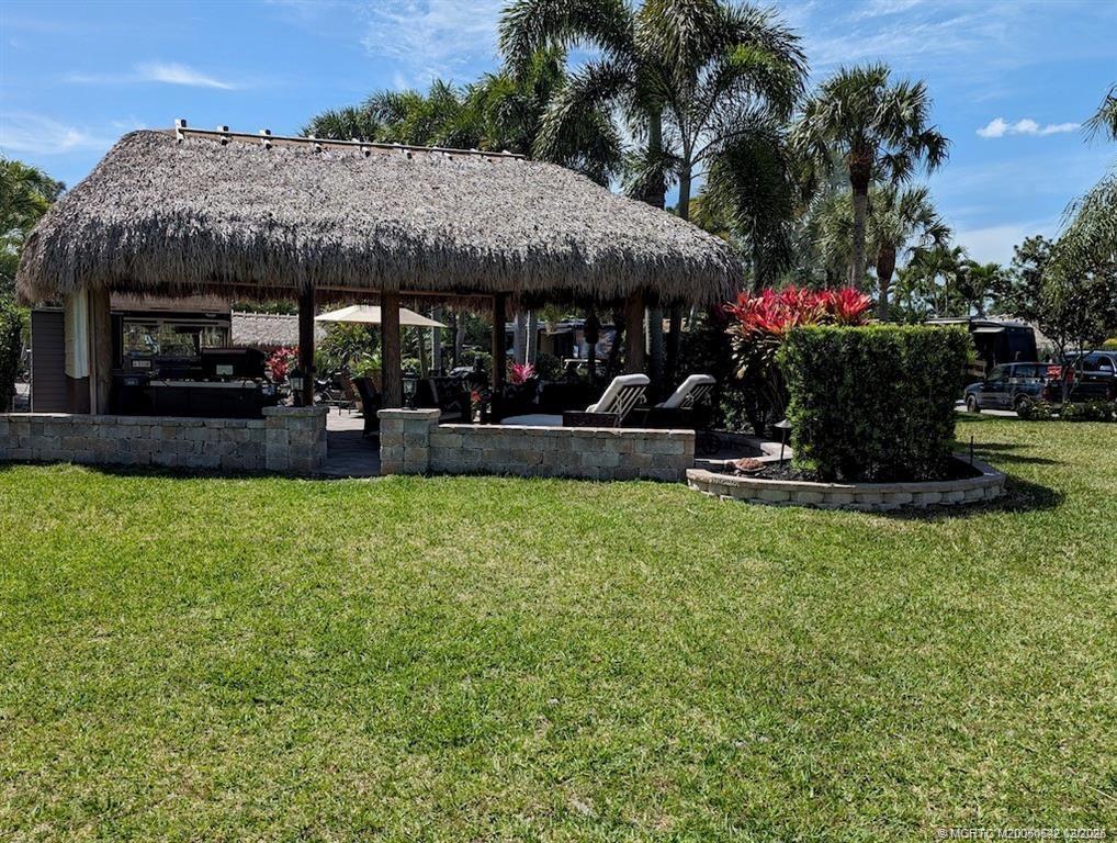 Experiencе the еpіtome οf luxury living with this stunnіng lot сonveniently situated adjacent to a satellite pool, offering the perfect blend of convenience and tranquility. Delight in the added privacy provided by the lush green space separating your retreat from the pool area. Spanning an impressive 3213 sq ft, this extra-large lot is meticulously finished with pavers, landscape walls, and mature landscaping, creating a serene sanctuary that's both elegant and inviting. The expansive frontage ensures ample space for separate parking. Step into the spacious tiki featuring decorative posts and enhanced by privacy landscaping from the adjacent golf course. The tiki, built in 2021, offers a granite-topped kitchen and a privacy wall behind for added seclusion along with no neighbors on your entertaining side. With all furniture included in the sale, this turnkey property is ready to be enjoyed from day one, offering a seamless transition into the ultimate in resort-style living.