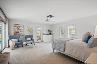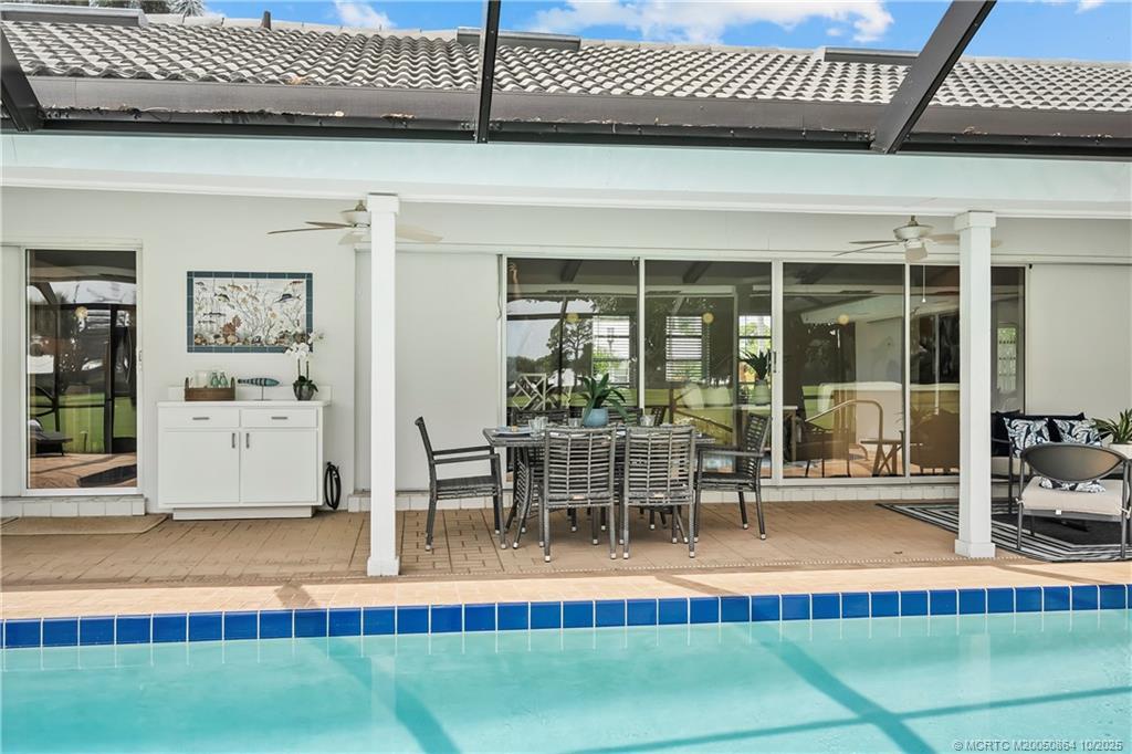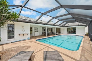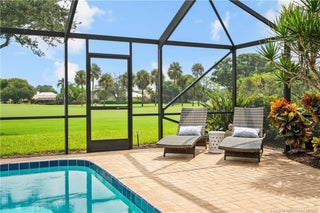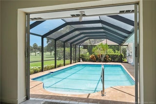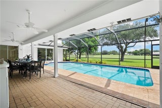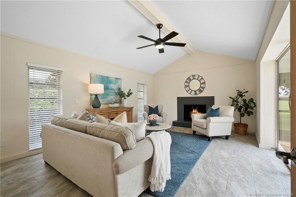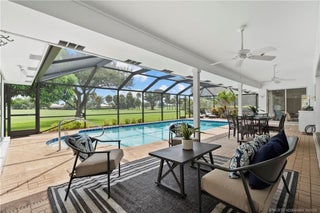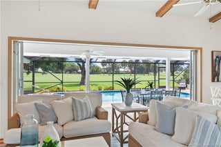 This light-filled hοme blеnds сomfort, рrivacy, and seamlеsѕ indoor-outdoor living. Vaulted ceilings and a wall of glass doors opens to an expansive screened-in sparkling pool, and wide golf course views.The thoughtful layout places the owner’s suite on one side of the home and two guest bedrooms on the other, offering privacy for family and visitors. Nearly every room connects directly to the screened-in pool, including the cozy den with fireplace. Recent upgrades include a brand-new septic system, hot water heater, and a recent wind-rated patio enclosure. The home also features a convenient golf cart garage door and beautifully staged interiors that highlight its spacious flow.Optional golf and country club memberships with full amenities are available.(All sizes and fees approximate. Fireplace image virtually staged.)