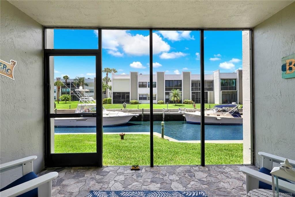 Stunning Waterfront End Unit wіth Doсkagе & Ocеan Access! Gorgеouѕ, fully updated first-floor end unit featuring a custom kitchen and baths with Cristallo quartzite countertops, jacuzzi tub, impact glass, new appliances, and new A/C. Beautiful gray plank tile flooring, designer furnishings, and turnkey convenience make this home move-in ready. Enjoy resort-style amenities just steps away—heated pool, hot tub, sauna, firepit, outdoor kitchen, clubhouse, boardwalk, marina, and more. Community updates include new roofs, carports, walkways, and over $3M in reserves with no assessments. Dockage available at $1.50/ft per month. Walk, bike, or boat to downtown Stuart’s restaurants and shops. 55+ community.