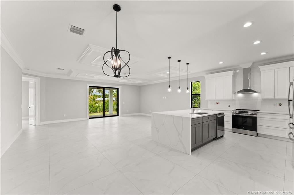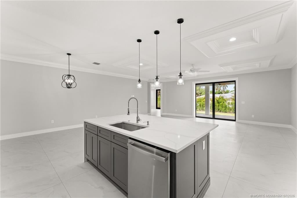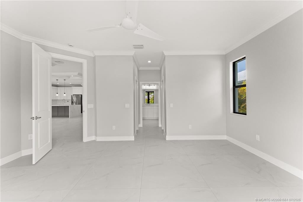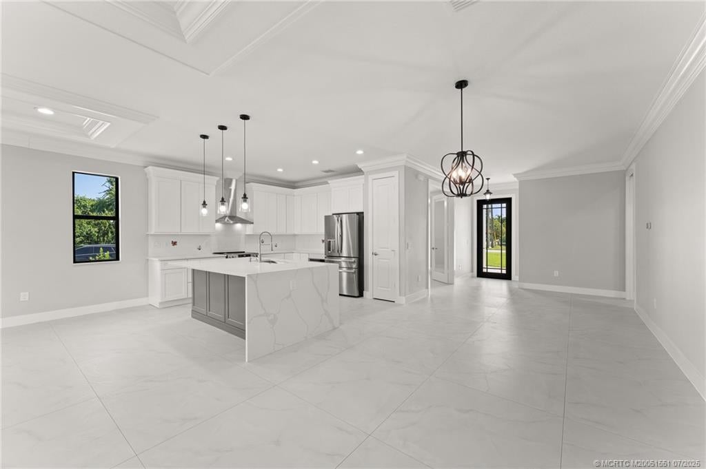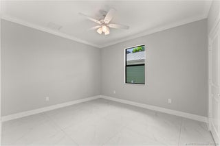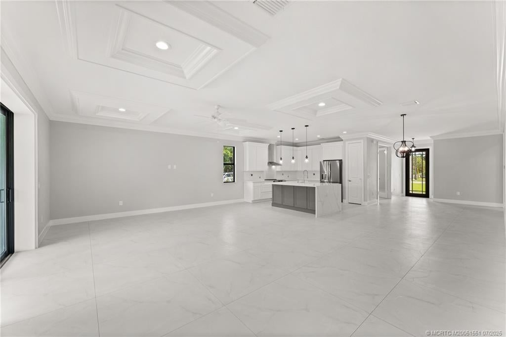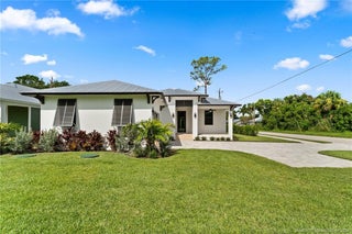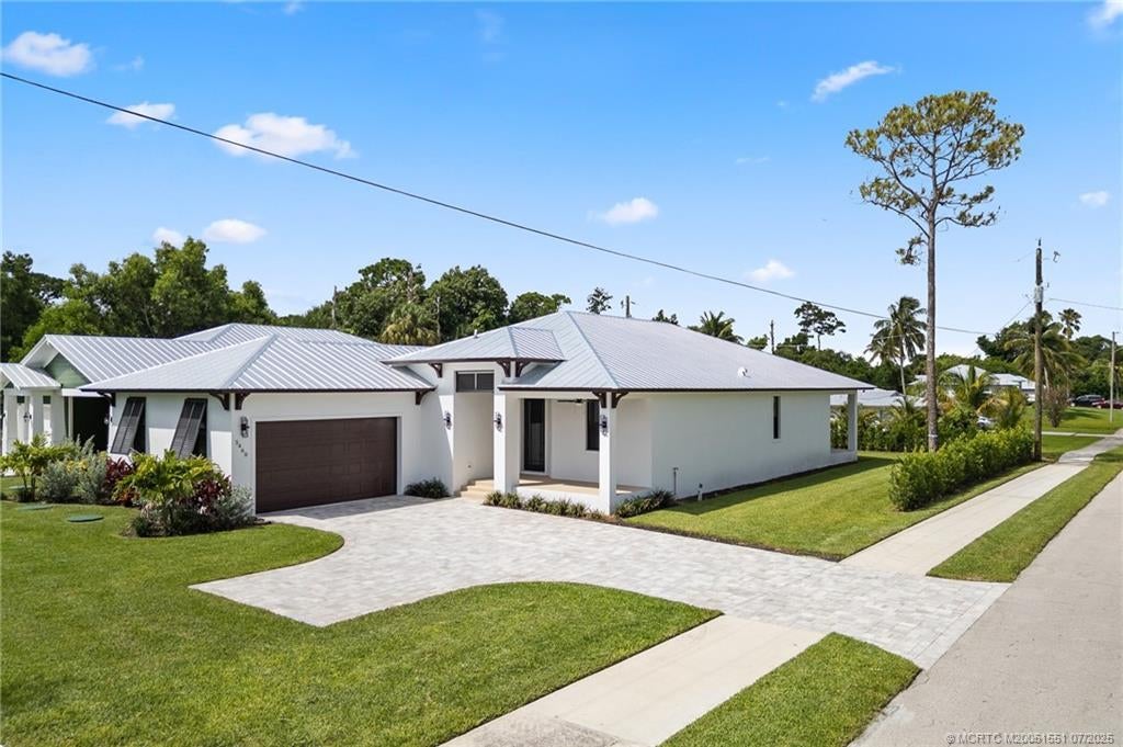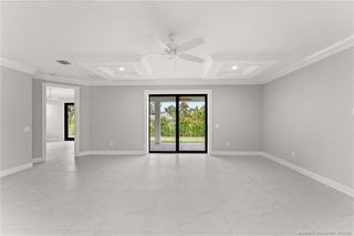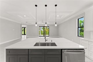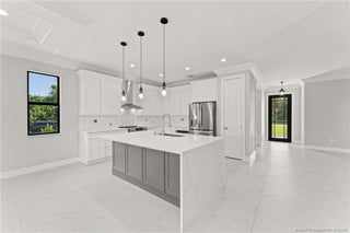Custom New Construction – This thoughtfully designed 3 bedroom + den, 2.5 bath estate blends charm, quality, and convenience in one beautiful new build. Located just minutes from public boat ramps, Sandsprit Park, and Port Salerno’s waterfront dining, this home is the perfect blend of lifestyle and location. Inside, enjoy an open-concept design with quartz countertops, a waterfall eat-in island, wood cabinetry and luxury porcelain tile throughout. Tray ceilings, crown molding, recessed lighting, and ceiling fans add elegance and comfort. Built for peace of mind and longevity with impact windows and doors, a metal roof, and stucco exterior. Relax on the elevated front or back patio with fresh coastal breezes. The oversized 10' garage door and large lot offer space for your boat, RV, or future pool.