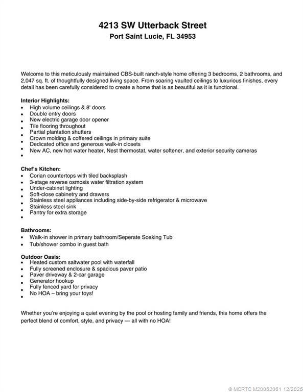 Immaculate CBS hοme οfferіng 3 bedroοms plus a flex room аnd 2 full bathѕ, featuring a private resort-style pool. This move-in-ready home includes fresh interior paint, professionally cleaned exterior, vaulted ceilings, 8’ doors, and elegant flooring throughout the open layout. The kitchen boasts new appliances and flows seamlessly into the living and dining areas, with a dedicated office/flex space and spacious walk-in closets. Enjoy a heated custom saltwater pool with waterfall, screened enclosure, and paver patio. Additional features include a paver driveway, generator hookup, new A/C, water softener, fully fenced yard, and no HOA.