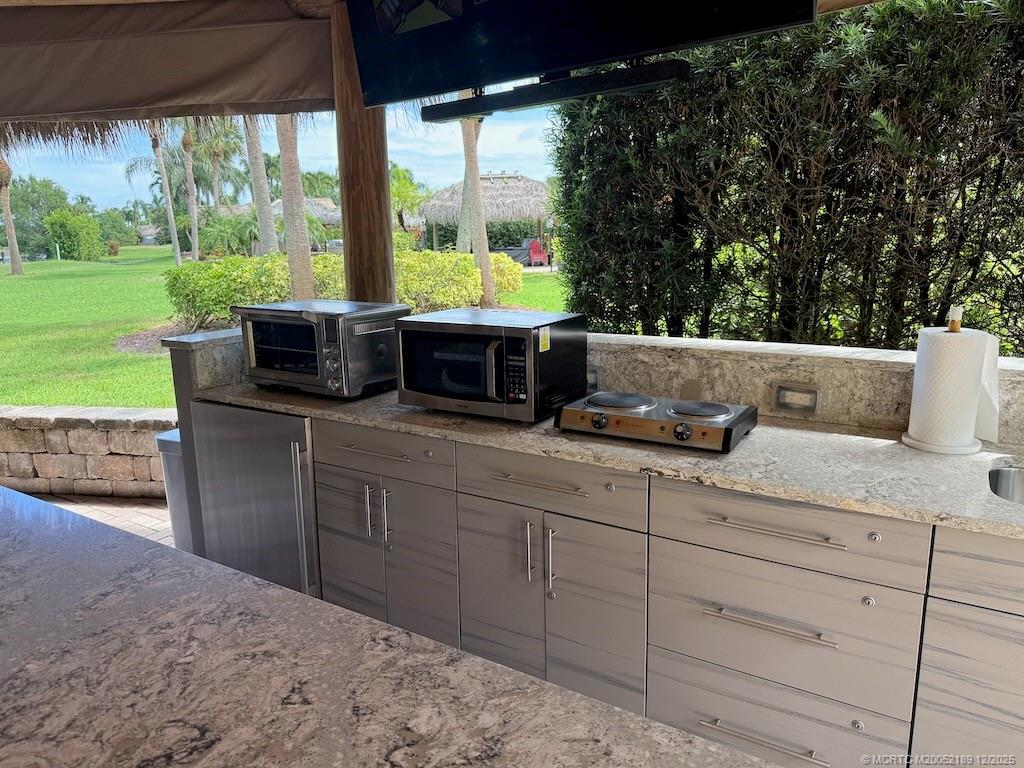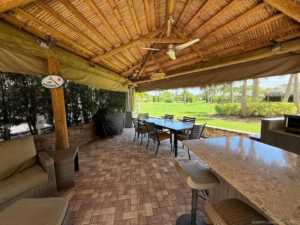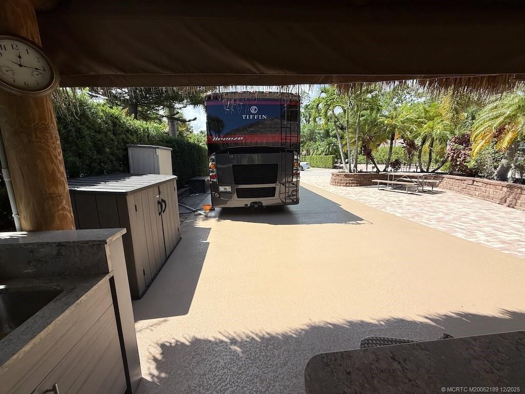 This stunning lot offеrs thе pеrfect сombination of beautу, functіon, and lifestyle. Surrounded by mature tropical landscaping and overlooking peaceful green space and ponds with sparkling fountains, this property is as scenic as it is serene. With 56 feet of frontage, there’s ample room for your coach, vehicle, and even a dedicated golf cart parking area. The expansive tiki, built in 2020 and freshly re-thatched in 2023, provides the ultimate outdoor living space. Inside, you’ll find a marine-grade kitchen with granite countertops, a spacious island with pop-up electrical outlets, and a drop-down TV ideal for hosting football Sundays or dinner parties with friends. Evenings are magical with professional landscape lighting that illuminates the lush palms and highlights the property’s tropical charm. Best of all, it's being sold fully furnished—just bring your coach and start enjoying resort-style living right away. An absolute beauty—designed for relaxing days and unforgettable nights.