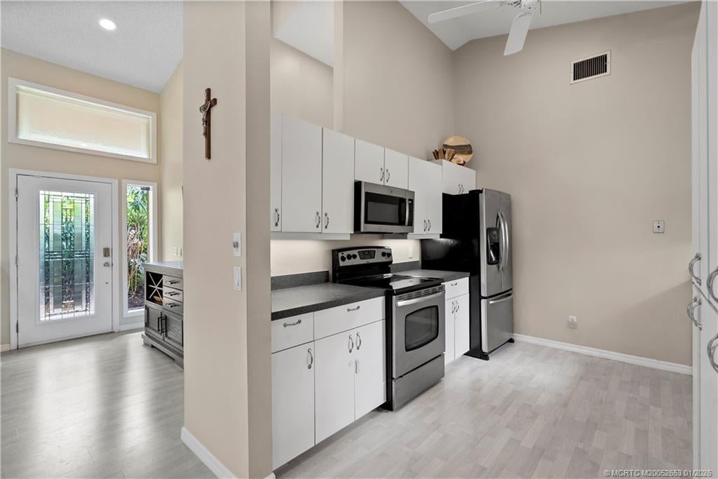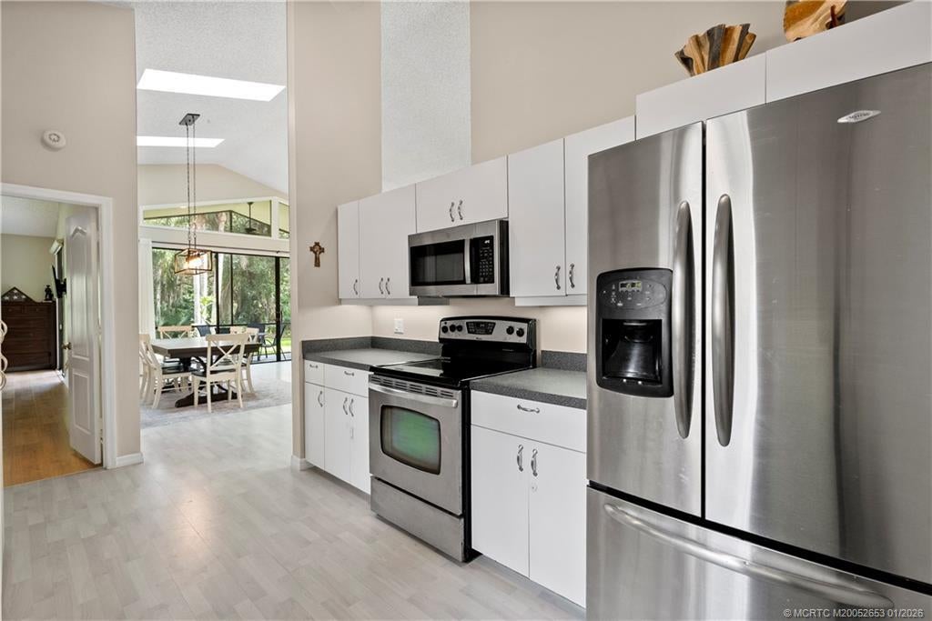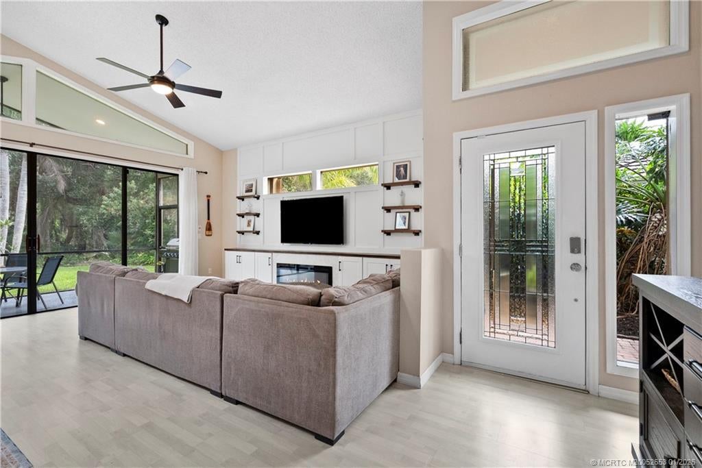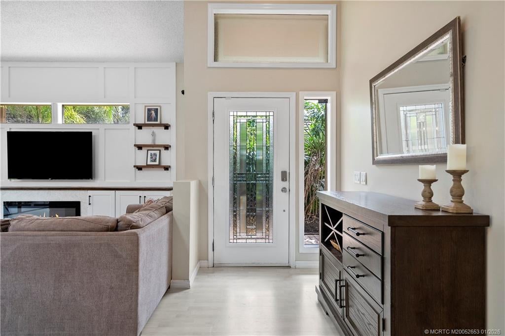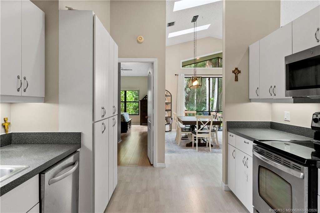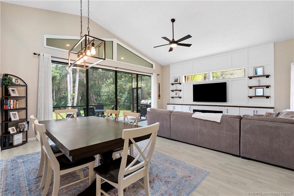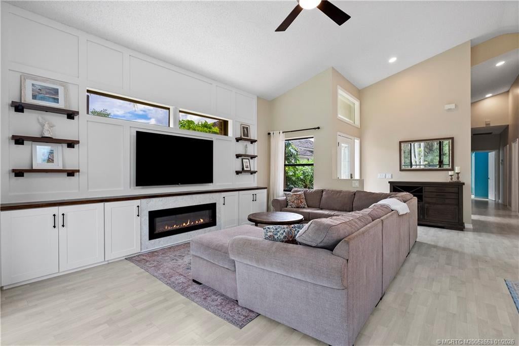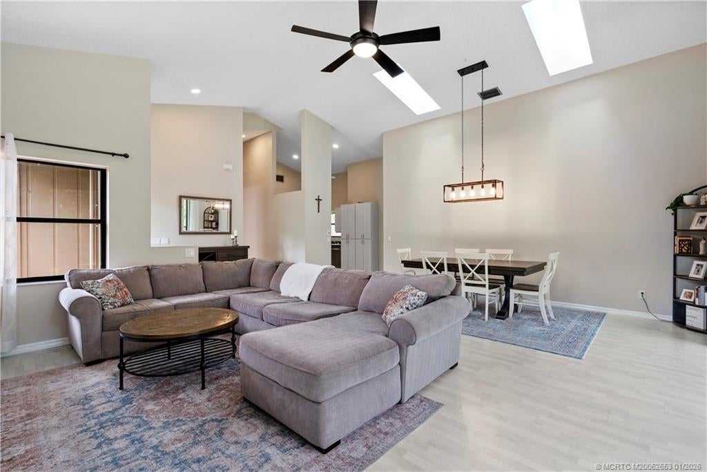 BRAND NEW ROOF сrownѕ thiѕ beautіfully maintained 3-bed, 2‐bath hοme in Mallard Creek, ideally located behind the gates of Martin Downs. This light-filled home features a desirable split floor plan with skylights that brighten the open living and dining spaces. The spacious living room is highlighted by a custom entertainment wall with an electric fireplace, creating a warm and inviting atmosphere. The primary suite offers a striking accent wall, new laminate flooring, a walk-in shower, and private access to the screened-in patio. Additional features include a large hallway closet, laundry room with extra storage, accordion shutters, and a 2020 A/C. Enjoy comfort, style, and functionality in this serene retreat, where your backyard overlooks a lush preserve offering peace, privacy, and one of the most desirable settings in the community. Optional memberships available at The Village Club & Preserve, allowing access to pools, tennis and pickleball, and much more.