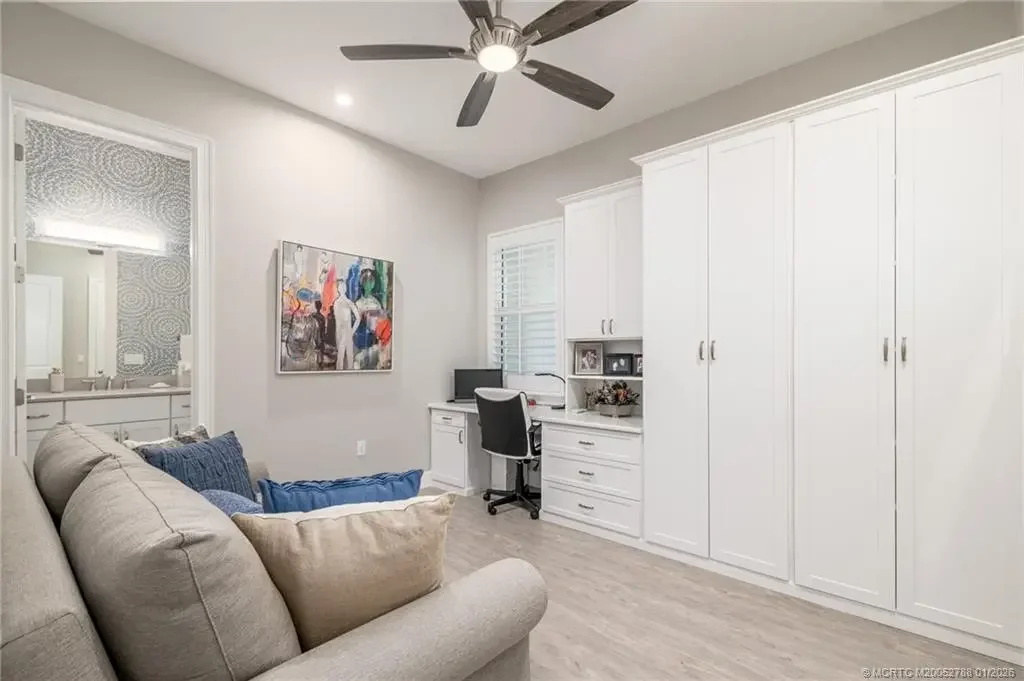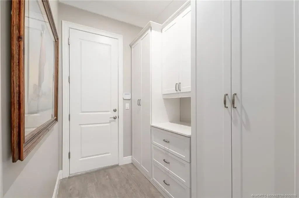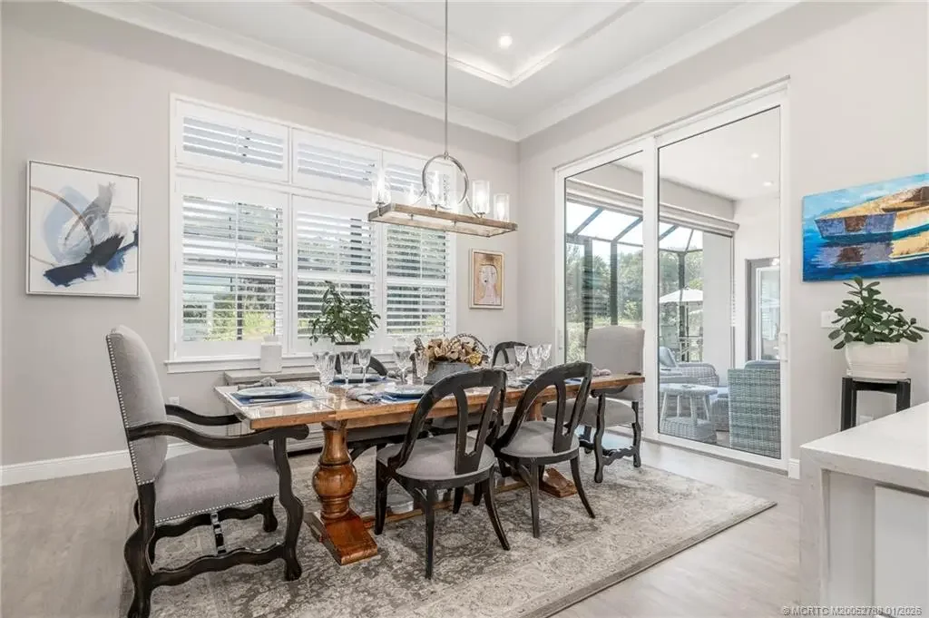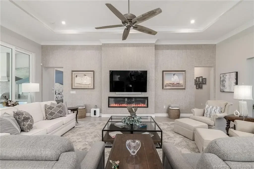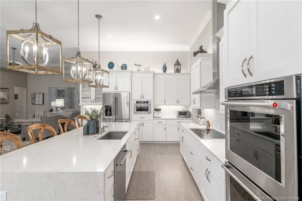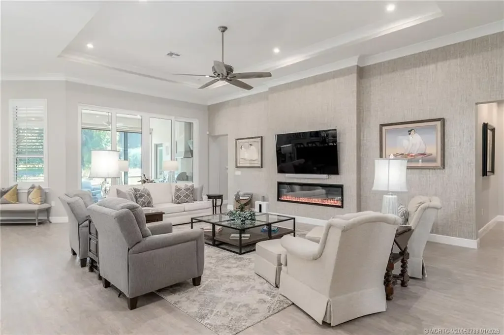 Welcome to Langford Landing, an exclusive gated enclave offering luxury living & direct boating access. This home includes a 30’ boat slip at the on-site marina. The open-concept layout creates a seamless flow through the main living areas, highlighted by coffered ceilings, a modern electric fireplace, & elegant designer finishes. The chef’s kitchen stands out w/ a large waterfall island, premium SS appliances, double wall oven, a butler’s pantry, & stylish pendant lighting–perfect for entertaining. The primary suite offers a stunning freestanding soaking tub, oversized walk-in shower w/ dual shower heads & a massive custom-built closet. Outdoor living impresses w/ a covered lanai, modern summer kitchen, & heated pool w/ water feature, all oriented toward the tranquil backyard preserve. Additional highlights include bold designer powder rooms, a versatile guest room w/ custom built-ins & desk, climate-controlled garage, & a well-appointed laundry room w/ sink & storage.
