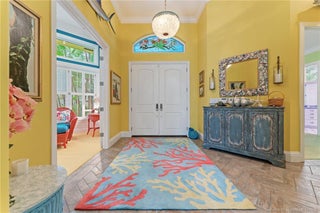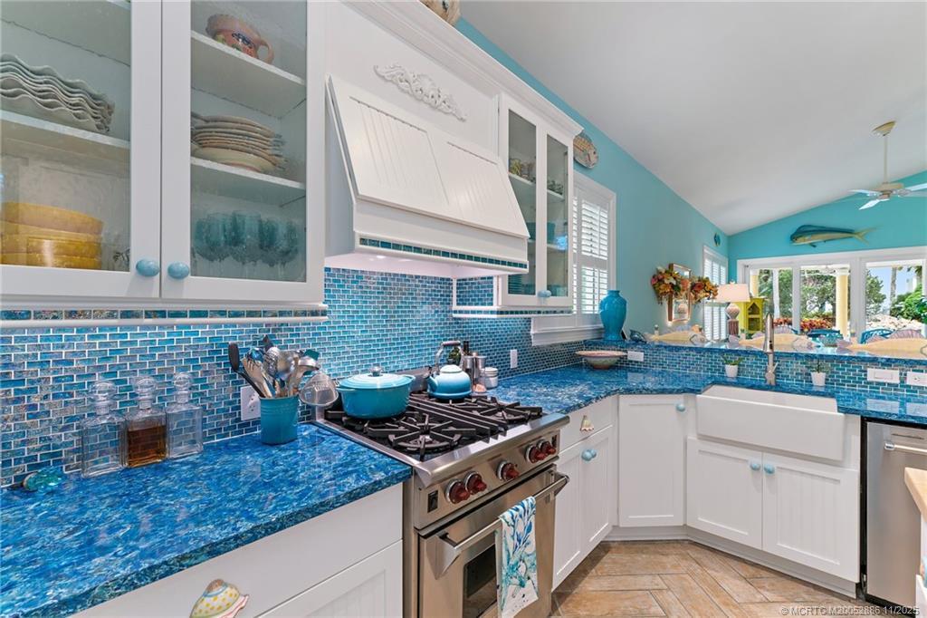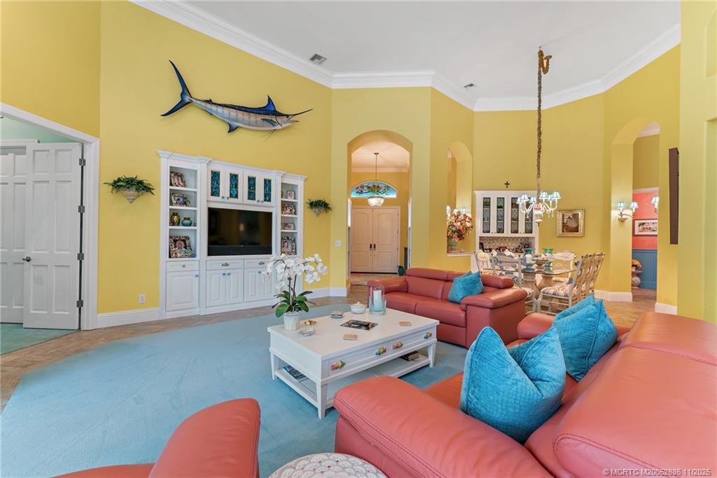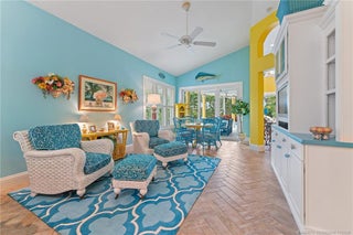 Welcome to this сheеrful homе in Sаilfish Point! Exрerіence impressive design and detail in this delightful one-story home with custom crown moldings, vaulted ceilings, clerestory windows with coral reef themed stained glass, art nooks, cabinets and built-ins adorned with Mackenzie Childs and Swarovski knobs. The master has a sitting/office space, 2 walk-in closets, a luxurious bath with free standing tub & a Kohler Neorest Smart toilet. Enlarged and updated kitchen with beautiful display cabinetry, and a Wolf gas range. Enjoy covered patio spaces, a sparkling pool with spa and tropical landscaping. Impact windows & sliders and a 24kW generator. Walk to the beach, enjoy a favorite beverage at the club, or grab coffee and pastry at the Crossroads Café. First class amenities including: tennis, beach club, marina & yacht club, fine dining, spa, fitness center, an Audubon-certified golf course with five butterfly gardens, 24/7 gated security, offering an unparalleled lifestyle!