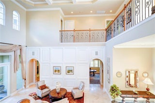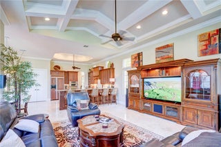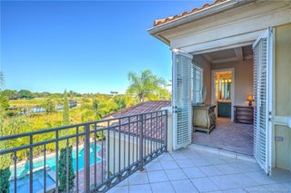 Welcome to this stunning Tuscan-inspired estate featuring an intricate wrought-iron curved staircase that sets the tone for timeless elegance. The first floor offers luxurious primary suite with French door opening to pool and spa, office w/adjoining theater rm, a breakfast nook, formal dining with butlers pantry and wine chiller, and spacious family room flowing to covered patio and outdoor kitchen. Possible 5th BR suite currently serves as office w/theater rm boasting tiered leather seating and surround sound for ultimate viewing experience. The Great rm showcases travertine tile, coffered ceiling and view of the grand staircase. Upstairs includes 3 additional Ensuite BRs with generous closets—one with private patio perfect for sunrise overlooking pool, preserve and water—plus a loft or flex space with access to a sunset-view balcony. Three-car split garage. Optional Social or Golf membership at Tesoro Club includes golf, tennis, pickleball, bocce, fitness, dining, and more.