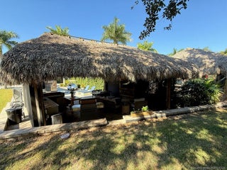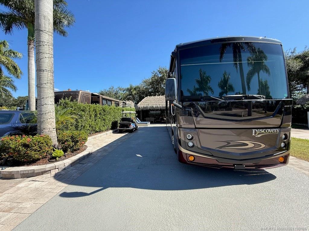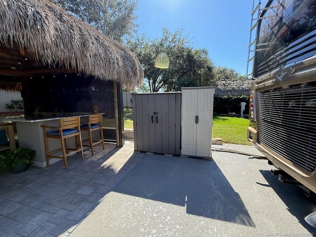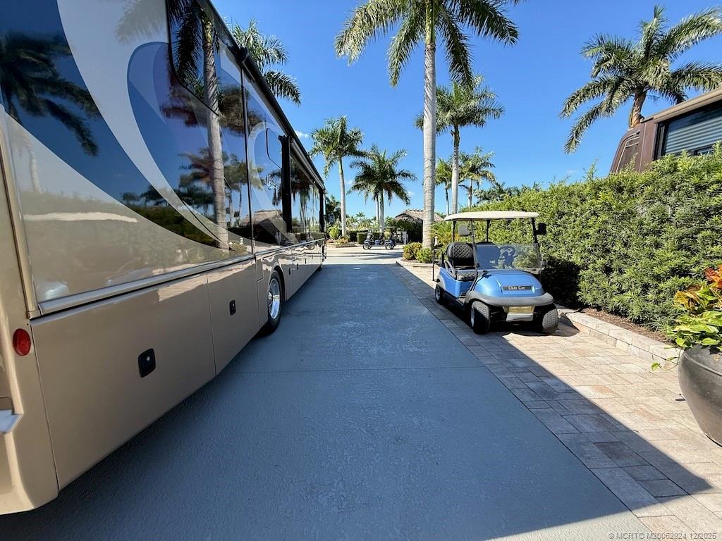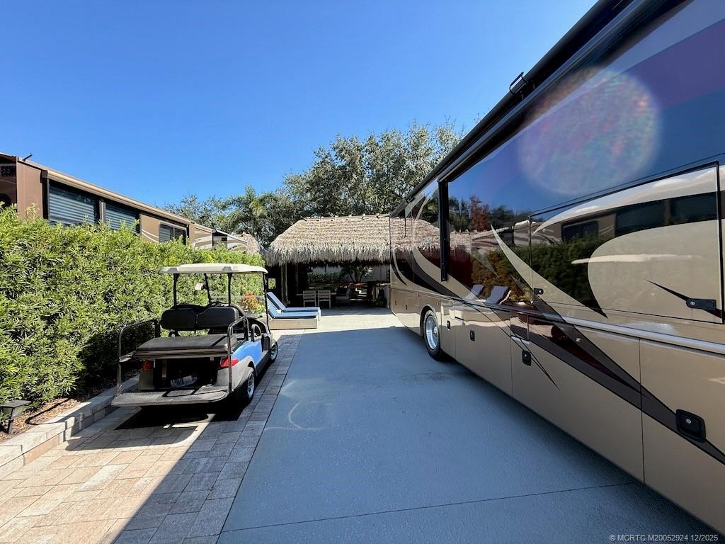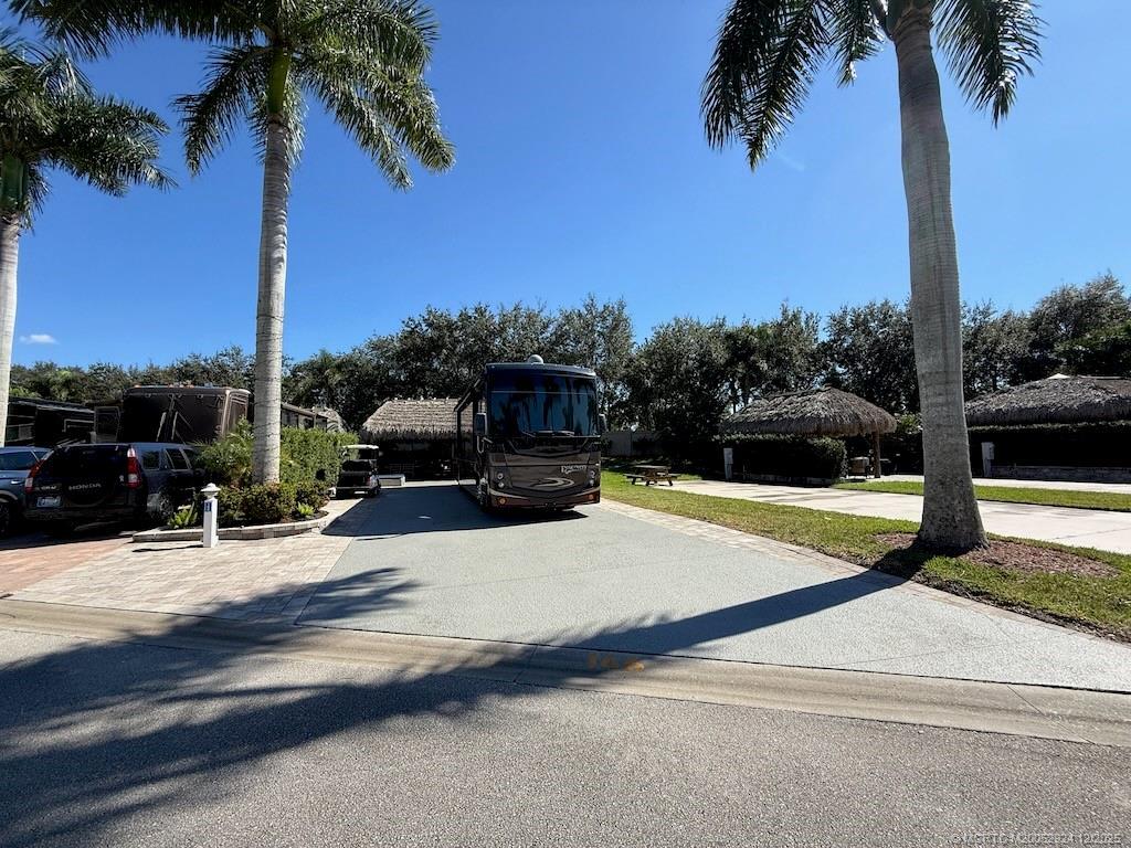Luxury RV Lot with Eхpаnsіve Tіki and Designer Upgradеs! Εxperience resort-style living at its finest on this spacious 2,868 sq. ft. lot surrounded by lush, mature landscaping and enhanced with upgraded landscape lighting that beautifully highlights your outdoor oasis. The expansive tiki hut is designed for both relaxation and entertaining, featuring a granite-topped kitchen, refrigerator, grill, water heater, and a custom maple island for added style and functionality. Inside the tiki, enjoy a dedicated entertainment wall with a flat-screen TV, comfortable sofa and chairs with ottomans, and a spacious dining area—perfect for gatherings or quiet evenings. Motorized screens allow you to enjoy the outdoors in comfort, while storage sheds provide convenient space for all your extras. Beautifully landscaped, move-in ready, and meticulously maintained, this property captures the essence of luxury motorcoach living—the perfect blend of comfort, style, and Florida charm! New thatch Dec 2025.