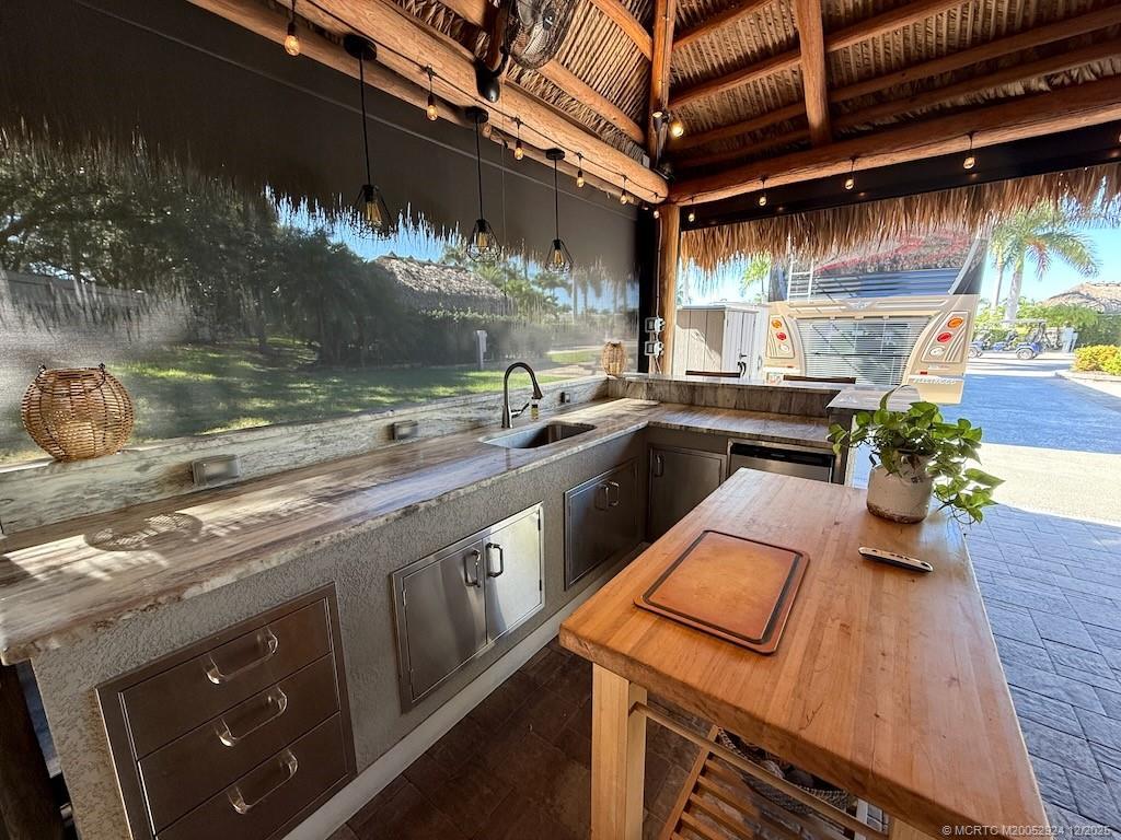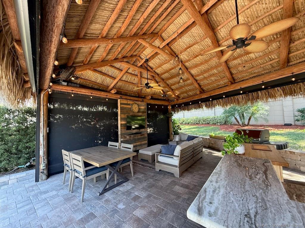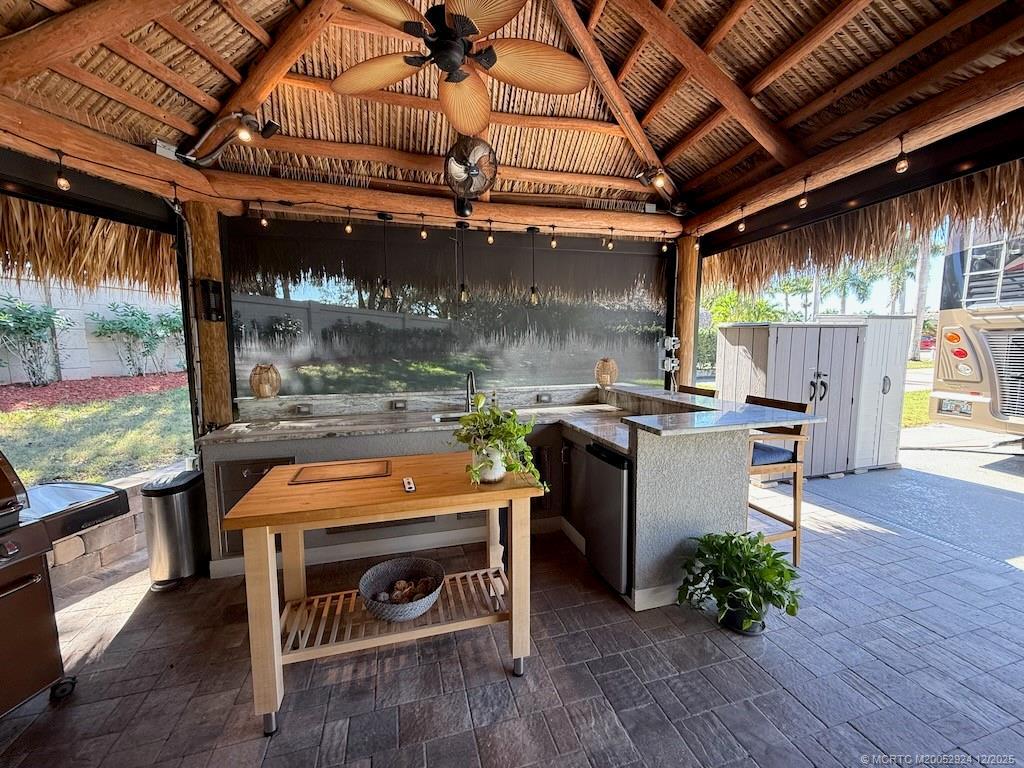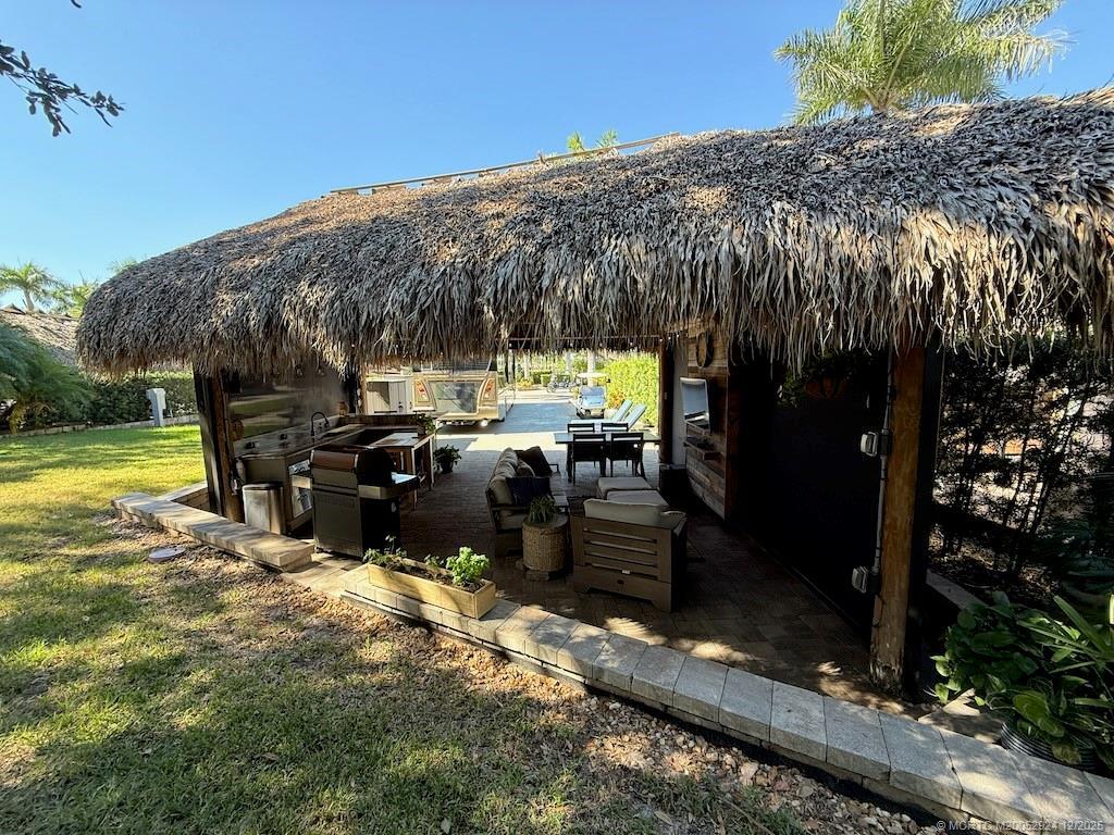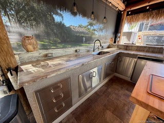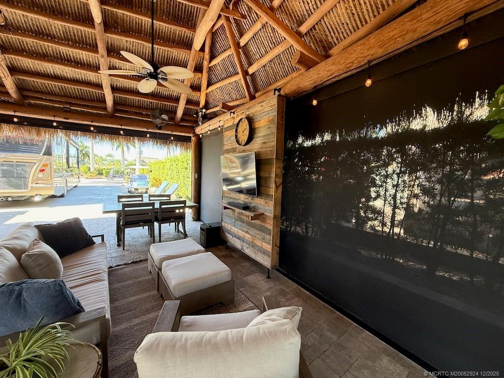 Luxury RV Lot with Eхpаnsіve Tіki and Designer Upgradеs! Εxperience resort-style living at its finest on this spacious 2,868 sq. ft. lot surrounded by lush, mature landscaping and enhanced with upgraded landscape lighting that beautifully highlights your outdoor oasis. The expansive tiki hut is designed for both relaxation and entertaining, featuring a granite-topped kitchen, refrigerator, grill, water heater, and a custom maple island for added style and functionality. Inside the tiki, enjoy a dedicated entertainment wall with a flat-screen TV, comfortable sofa and chairs with ottomans, and a spacious dining area—perfect for gatherings or quiet evenings. Motorized screens allow you to enjoy the outdoors in comfort, while storage sheds provide convenient space for all your extras. Beautifully landscaped, move-in ready, and meticulously maintained, this property captures the essence of luxury motorcoach living—the perfect blend of comfort, style, and Florida charm! New thatch Dec 2025.