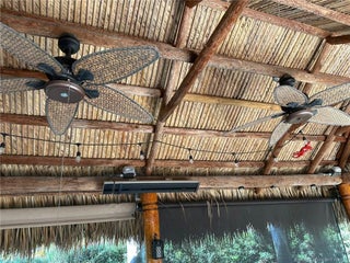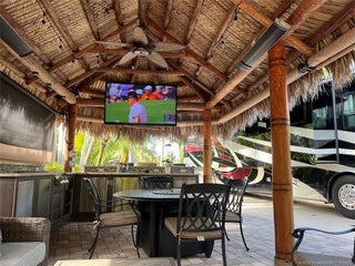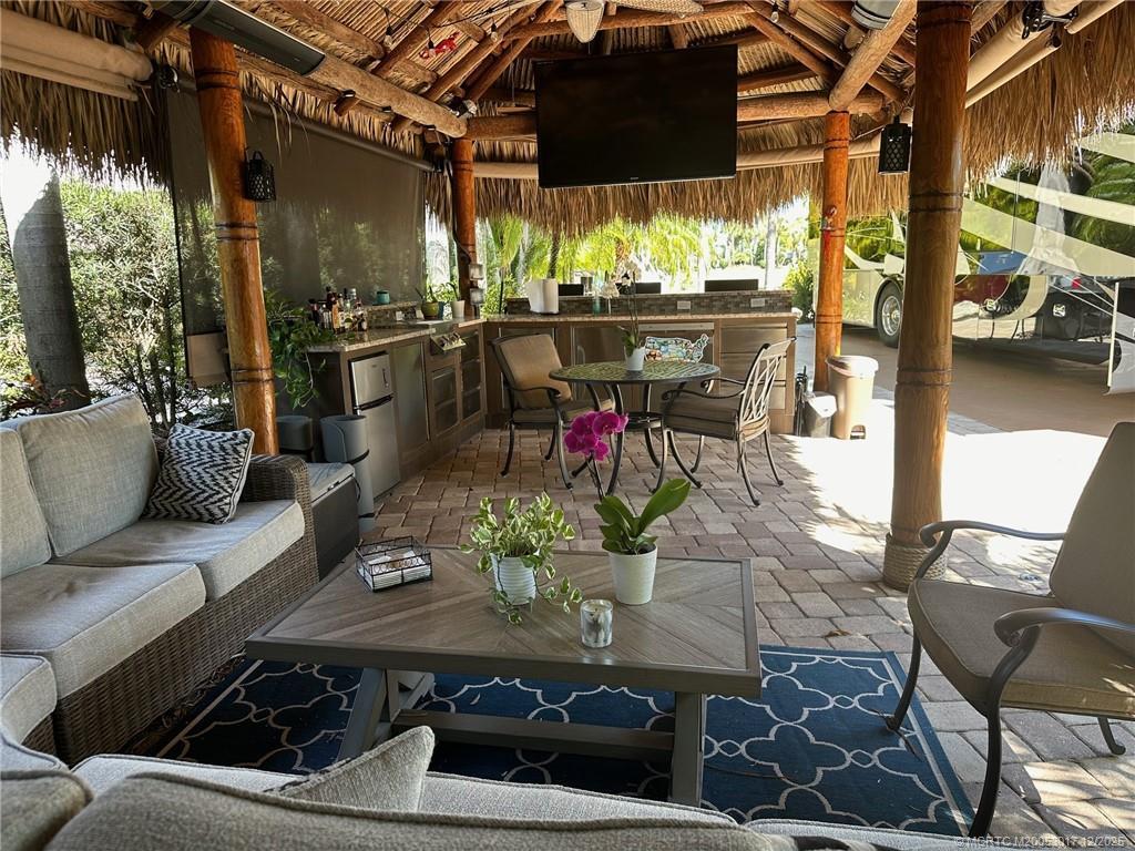 GREAT PRICE on this lush, turnkey corner lot overlooking the 12th hole! Perfectly situated at Chipshot and Boundary, this expansive 4,000+ sq. ft. lot offers plenty of space for entertaining. The large tiki features a full kitchen with 2-burner propane stove, LG dishwasher, sink, mini fridge (2024), and a 70” TV (2025). Enjoy seating for 6 on the L-shaped sofa, bar seating for 3, and a dining/game table for 4. Roll-down screens, heaters, and ceiling fans ensure year-round comfort. The lot boasts fresh paint on the RV pad, extensive irrigated landscaping with over 20 palms, and gorgeous pavers throughout. Outdoor entertaining areas include a 6-seat wrought-iron fire table with umbrella, large Napoleon grill, and a peaceful rear lounging area overlooking the golf course and fountains, a perfect place to lounge and read a book in privacy. The expansive frontage provides a separate parking space accommodating 2 cars and a golf cart. Conveniently close to the north pool—this one has it all!
