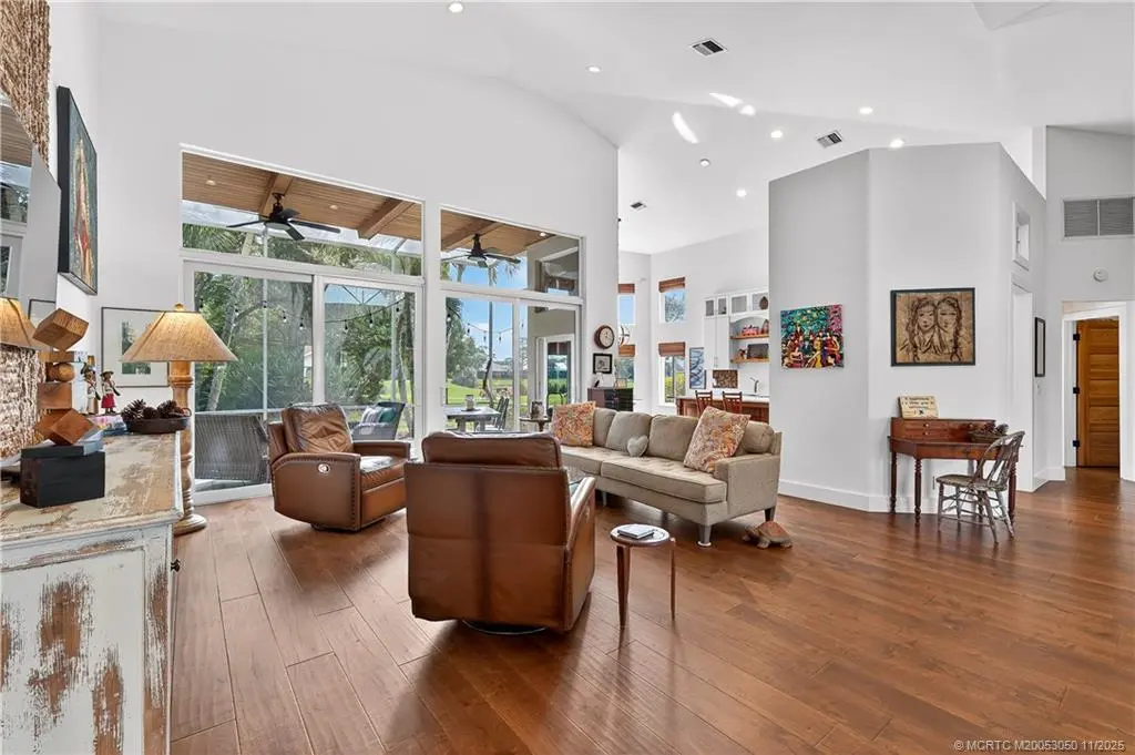 LOCATION! Closest home to the Clubhouse—steps from private walking trail along the St. Lucie River. Enjoy long golf and lake views with an east-facing backyard. Friendly, Laurel Oak Village with monthly happy hours, annual golf tourney & upgraded village pool area with fire pit. Renovated 2019, Portofino model owned by same family since 1988. Features wood floors, 2006 roof, expanded lanai, 2 dishwashers, wine cooler, ice maker, office/3rd BR, steam shower, dual vanities, central vac, new washer & dryer, and custom designer touches. Harbour Ridge-private, mandatory membership, two 18-hole championship golf courses, 9 Har-Tru tennis courts, pickle-ball courts, fitness facility w/ pool, waterfront clubhouse w/ 3 dining rooms, 2-mile riverfront walking path, biking, yacht club, and marina with boat slips available for additional fee. $125,000 Equity ($1,000 Refundable) due at closing. Monthly HOA Fee includes Club Dues, Trail Fees, POA, Village HOA, Capital Funds Fees & appropriate taxes.