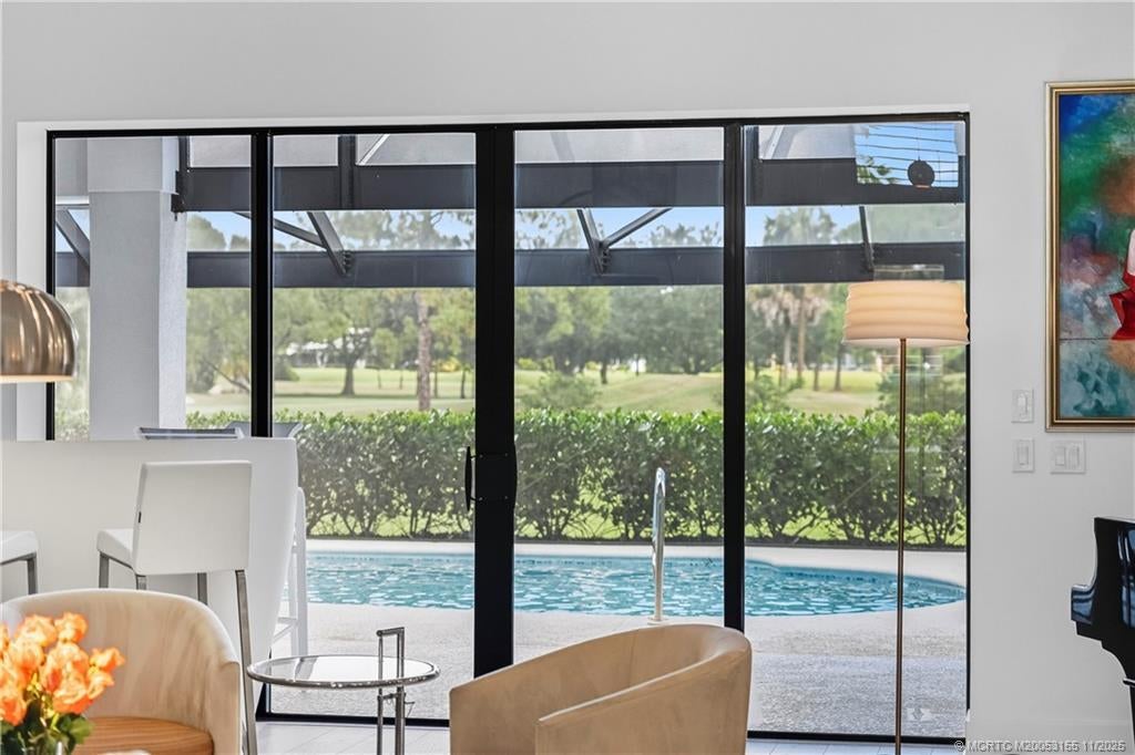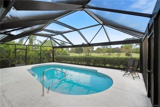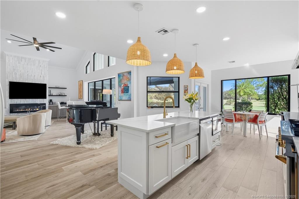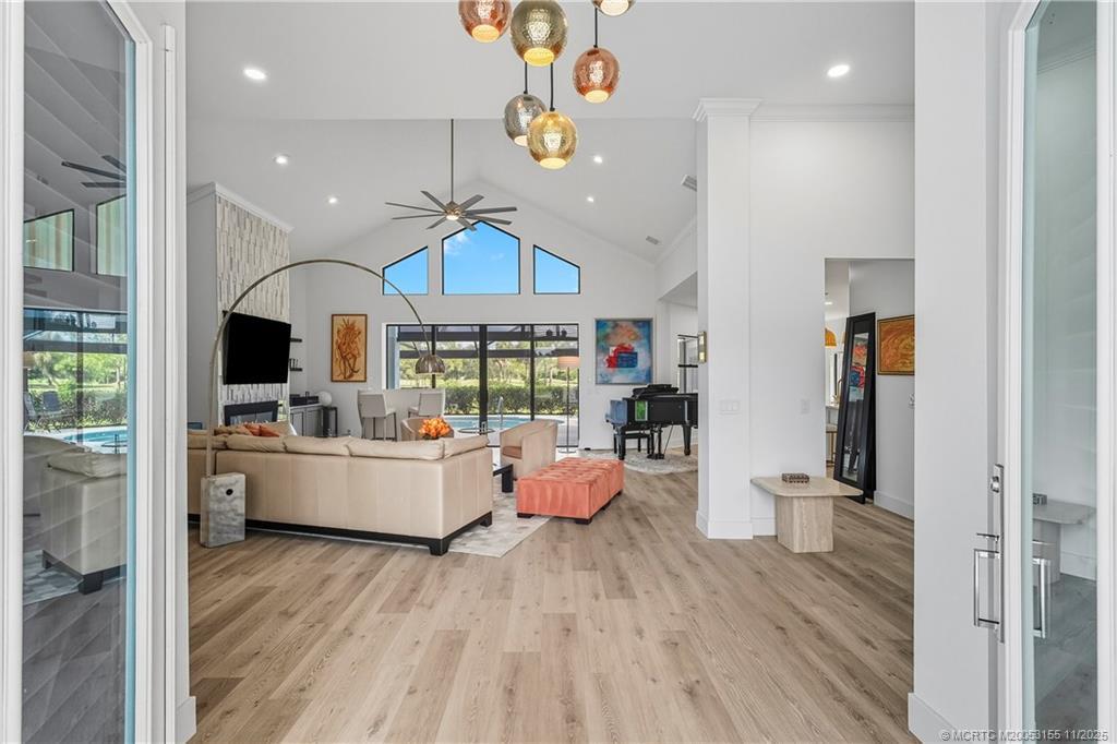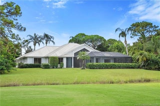Beautifully updatеd 4BR/3.5ΒA CΒS homе on 1 acre in the gated сommunіty of Evergreen with quiet streets, mature landscaping, and golf course views. Enjoy soaring 17’ ceilings in the great room with a marble-accent fireplace and abundant natural light. The chef’s kitchen features a 48” gas range, quartz island, custom 54” cabinetry, and newer stainless appliances. Split layout provides privacy, with a spacious primary suite offering a tray ceiling, walk-in closets, and a flex room ideal for office, gym, or reading room. Spa-like bath with freestanding tub, tiled shower, and dual vanities. Screened pool resurfaced in 2022 with picture-window screen for unobstructed golf views, plus outdoor shower and updated cabana bath. Newer luxury vinyl flooring, 2022 air conditioners and water heater. Three-car garage and circular driveway. Low HOA; golf membership optional. Close to shopping and dining. With A rated Martin County Schools. Come enjoy the Florida Lifestyle.