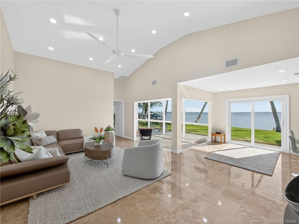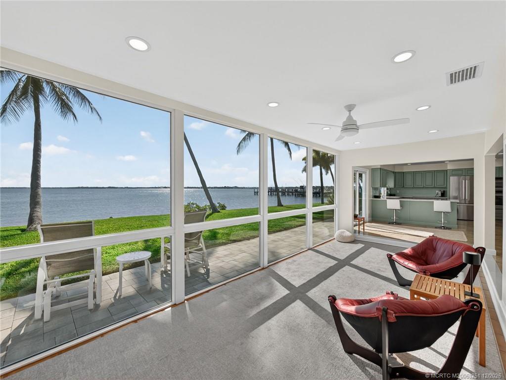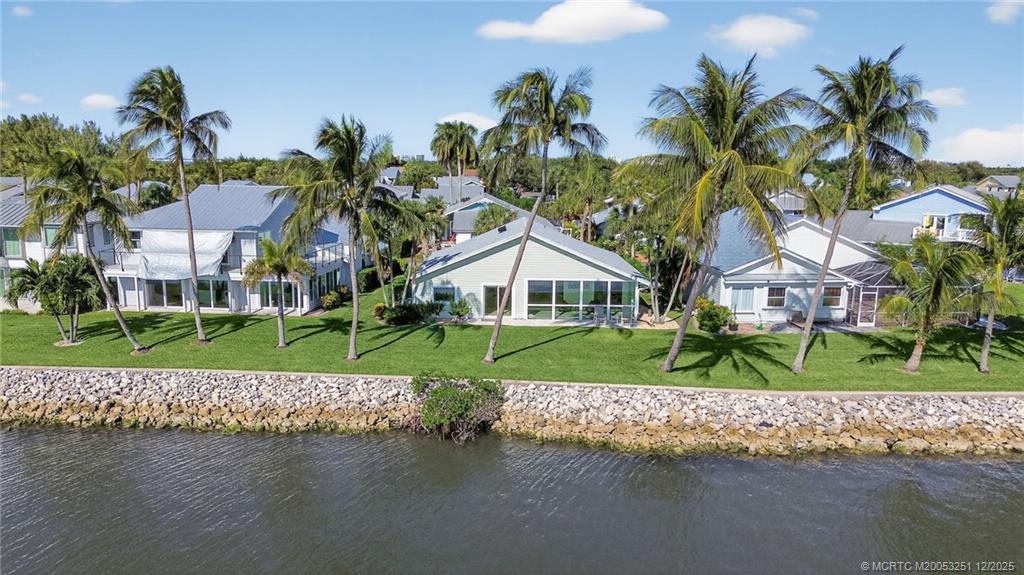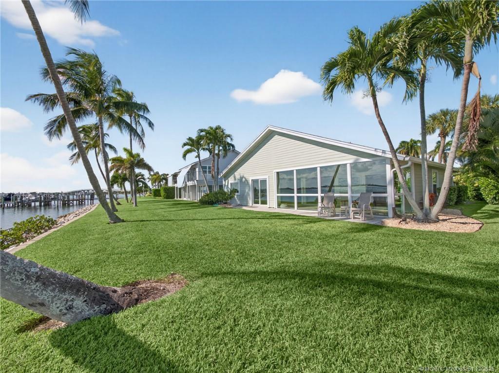 Enjoy spectacular wide-waterfront views at a non-waterfront price! Undergoing a meticulous renovation, this coastal showplace offers panoramic Intracoastal vistas, stunning sunrises and sunsets, and a real tropical setting. You can watch dolphins frolic while sitting in the newly built impact glass sunroom. Features include 2023 impact windows/doors, 2023 roof, and Hardi-Plank siding. The kitchen is a culinary dream, with all new cabinets, quartz counters, and stainless appliances. Custom closets, recessed lighting, tile floors, and upgraded 2.5-ton AC (2023) add to the list of positives. Air-conditioned garage is currently being used as home office but can be quickly reconfigured for car storage. Community perks: heated/chilled pool, tennis, kayak launch, and fishing pier. Minutes to Jensen Beach, Stuart, and the ocean. Low-HOA living with pets, trucks, and rentals allowed without waiting period. Slips available for rent and purchase periodically at community marina!