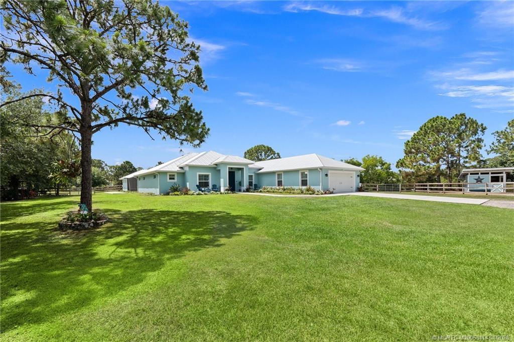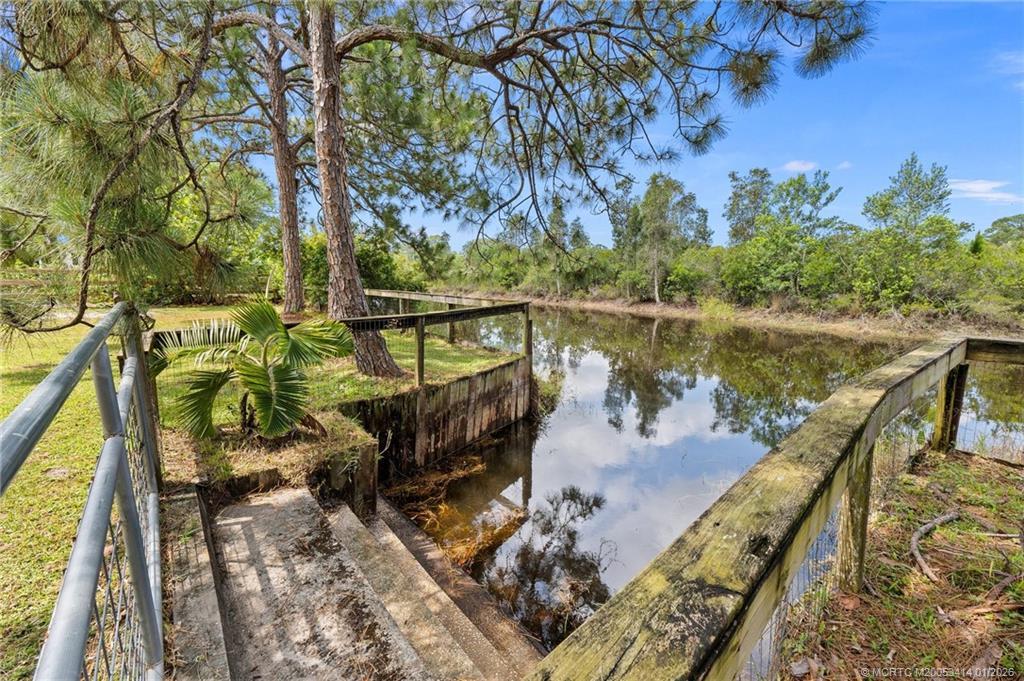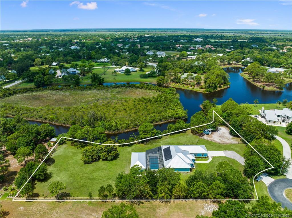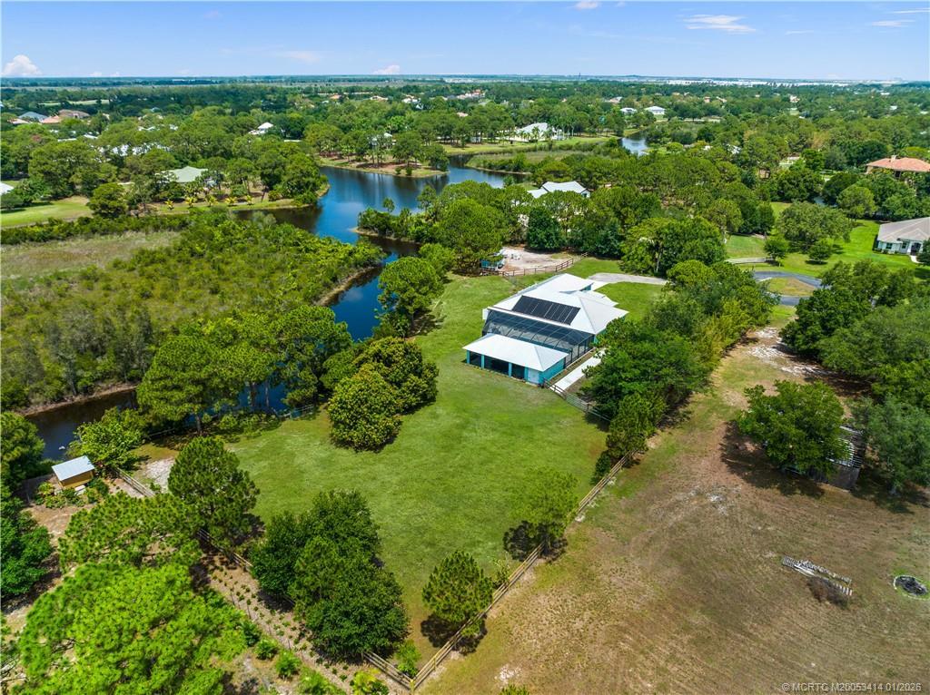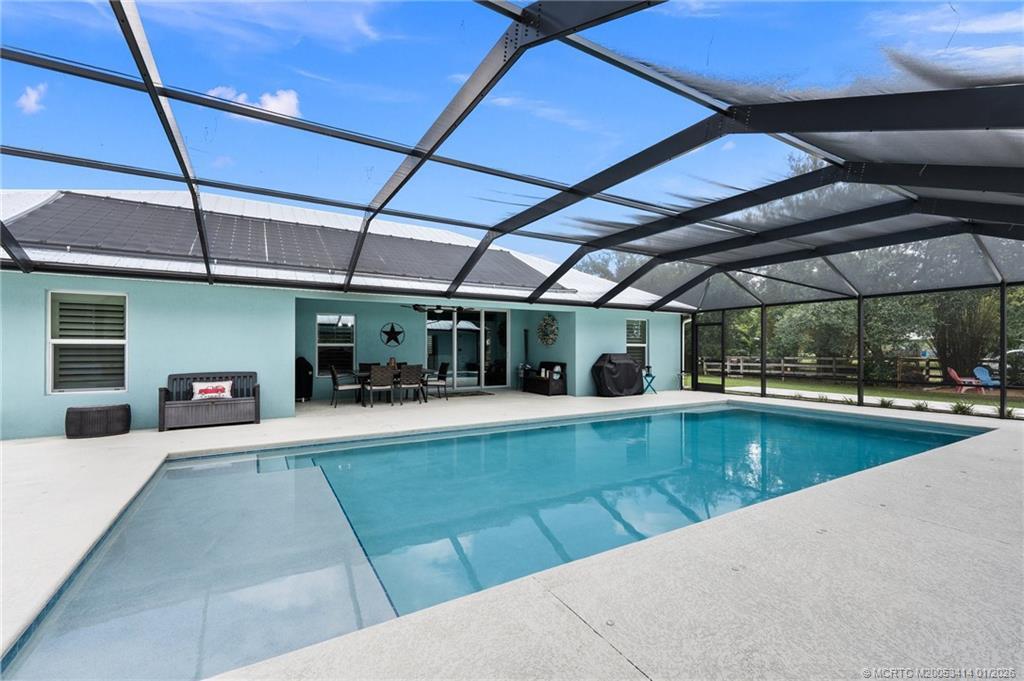 Every day is a vacation in this custom CBS 4 bedroom, 4.5 bath open concept home that has it all! Split bedroom plan, a center island kitchen with wood cabinets & marble which opens to the dining and living areas, and a large bonus room perfect for a playroom, home office/school, gym, or can easily be converted to a 5th bedroom. The primary suite features two walk-in closets, a bath with a large walk-in shower, and a double vanity. The pocket slider opens to where vacation begins on the covered lanai perfect for outdoor dining with a saltwater pool, 20 x 40 outdoor "living room" with a half bath & golf cart garage all screened for year-round enjoyment. Other features include tile throughout the home, impact windows & doors, and an oversized two-car garage. The yard is fenced and gated with 1 paddock and 12x12 barn, irrigation system, boat launch (electric or man-powered), fruit trees & sweeping open water views. Located in a gated community close to shopping, schools, & highways.