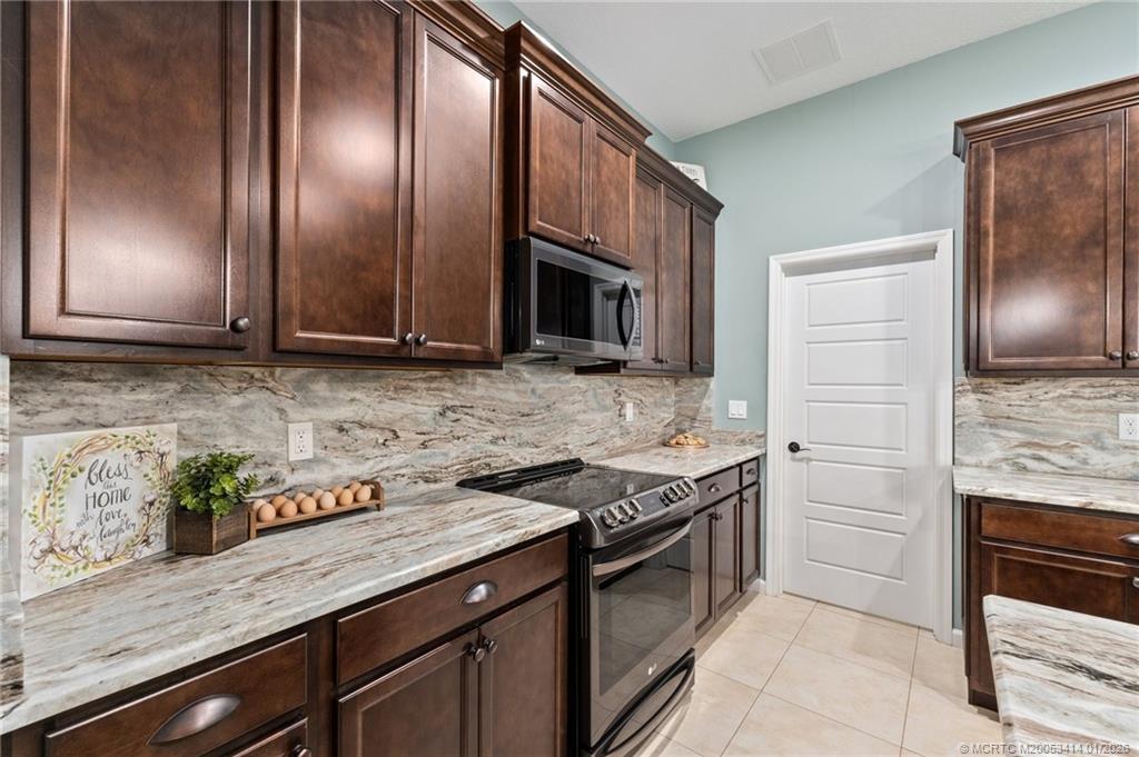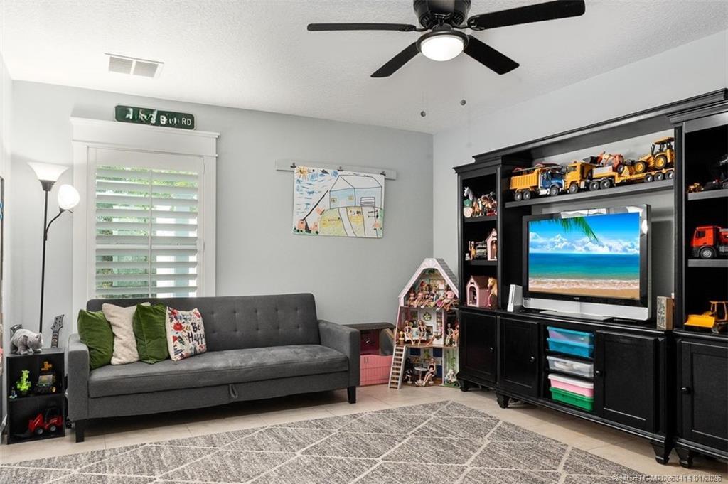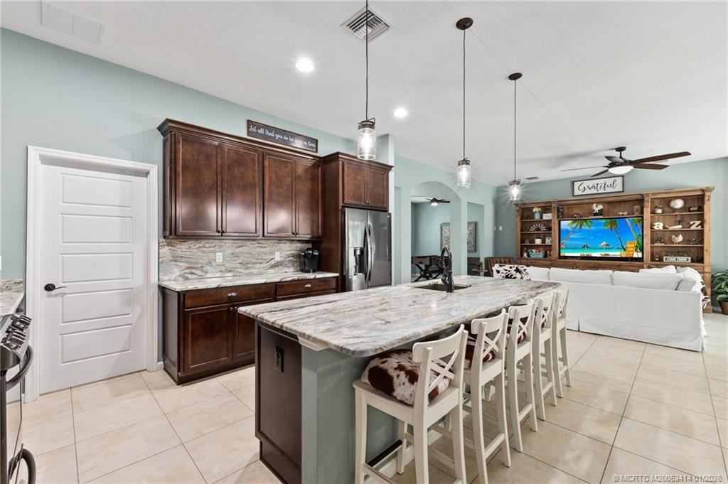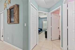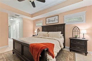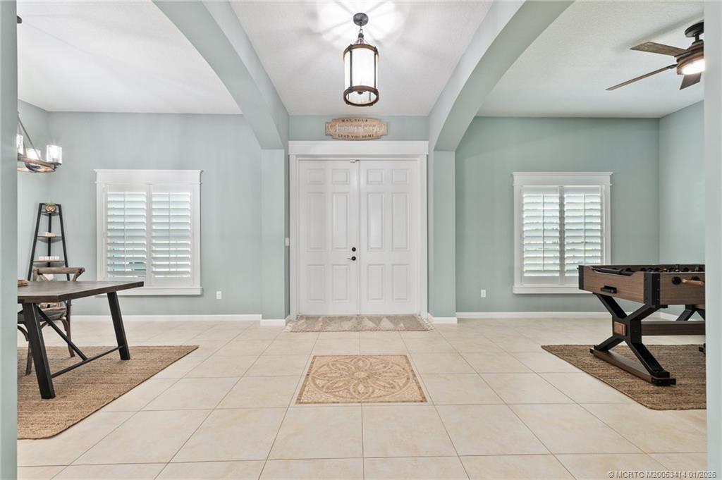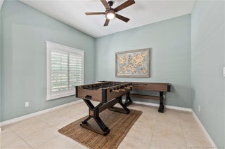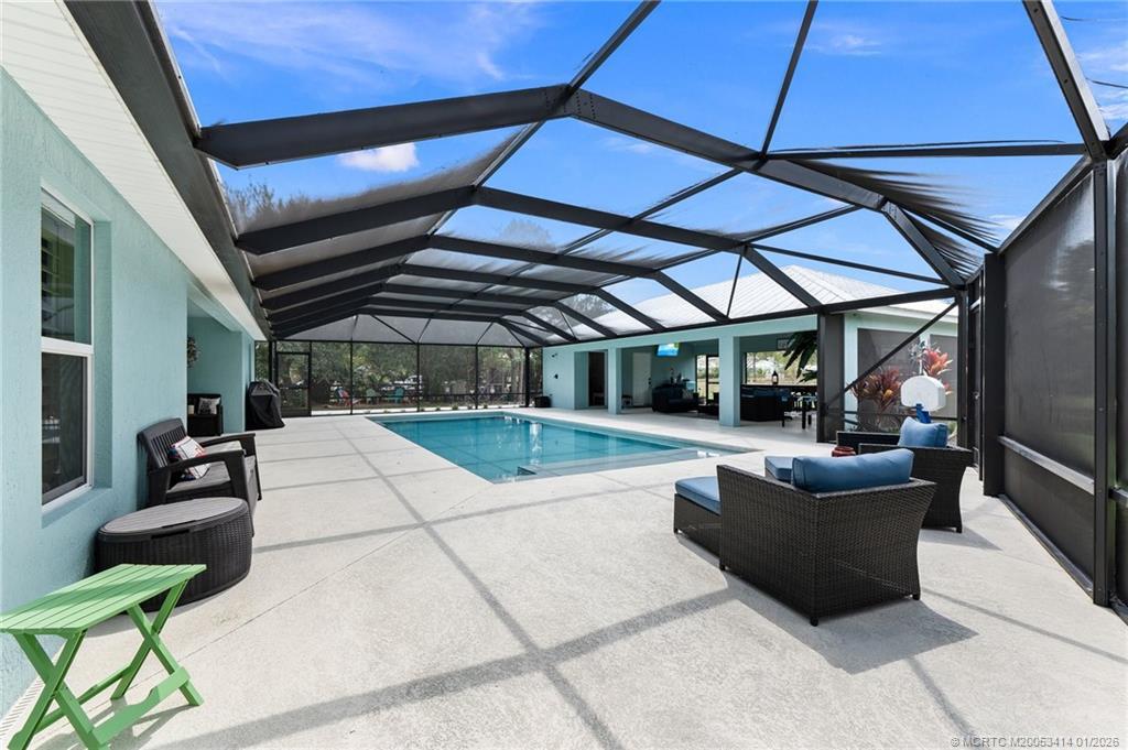 Every day is a vacation in this custom CBS 4 bedroom, 4.5 bath open concept home that has it all! Split bedroom plan, a center island kitchen with wood cabinets & marble which opens to the dining and living areas, and a large bonus room perfect for a playroom, home office/school, gym, or can easily be converted to a 5th bedroom. The primary suite features two walk-in closets, a bath with a large walk-in shower, and a double vanity. The pocket slider opens to where vacation begins on the covered lanai perfect for outdoor dining with a saltwater pool, 20 x 40 outdoor "living room" with a half bath & golf cart garage all screened for year-round enjoyment. Other features include tile throughout the home, impact windows & doors, and an oversized two-car garage. The yard is fenced and gated with 1 paddock and 12x12 barn, irrigation system, boat launch (electric or man-powered), fruit trees & sweeping open water views. Located in a gated community close to shopping, schools, & highways.