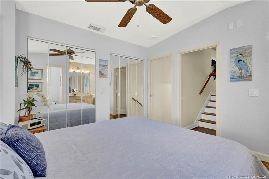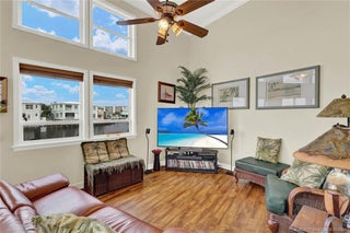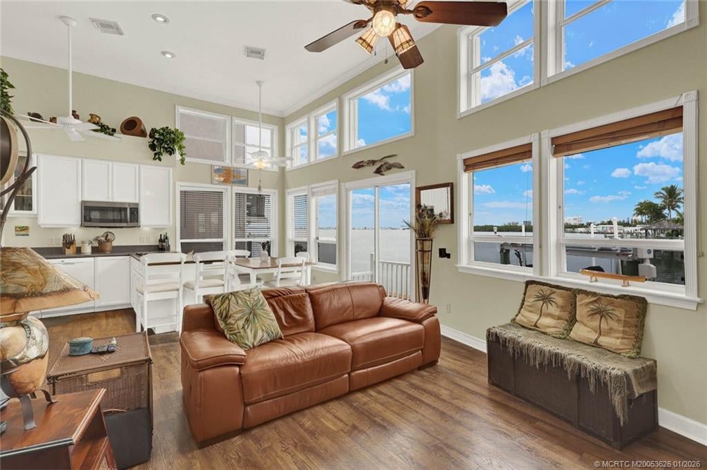 Treasure Coast living at its finest in this beautifully maintained waterfront home on S. Hutchinson Island, located in a gated community. This 2-bed 2-bath with a loft is offered furnished & designed to maximize comfort, storage, & stunning water views...The first-floor living & dining area features cathedral ceilings & expansive windows that showcase full waterfront views, creating a light-filled open area. The downstairs bedroom includes a Murphy bed, while the primary suite boasts a beautifully remodeled master bath. 6x10 air-conditioned Workshop. Upgrades: 2023 new roof, 2025 water heater, 2019 A/C, 2022 9,000-lb boat lift, 28' boat, 2000 a 40' long seawall put in,...Resort style with private oceanside access via a walking tunnel to the beach, plus community amenities that include a marina, storage for boats and trailers, a woodworking shop, billiards, pickleball, and more. This waterfront gem offers the best of island living.