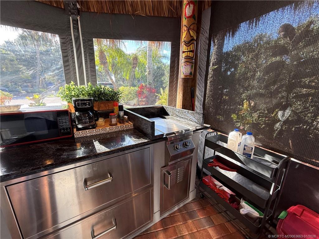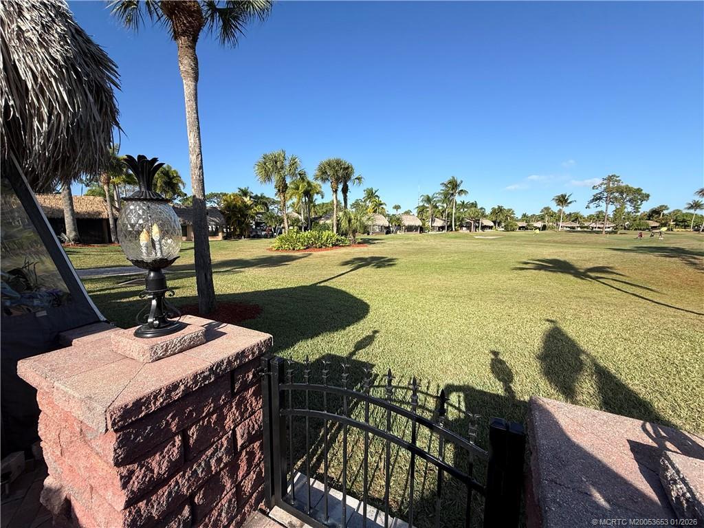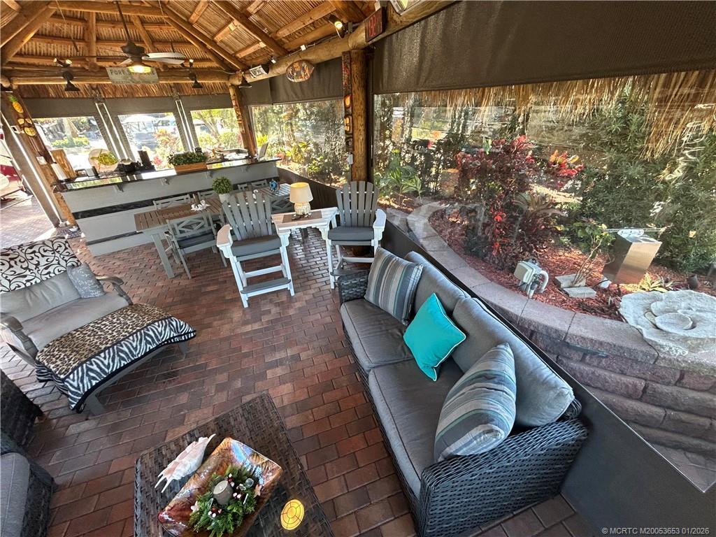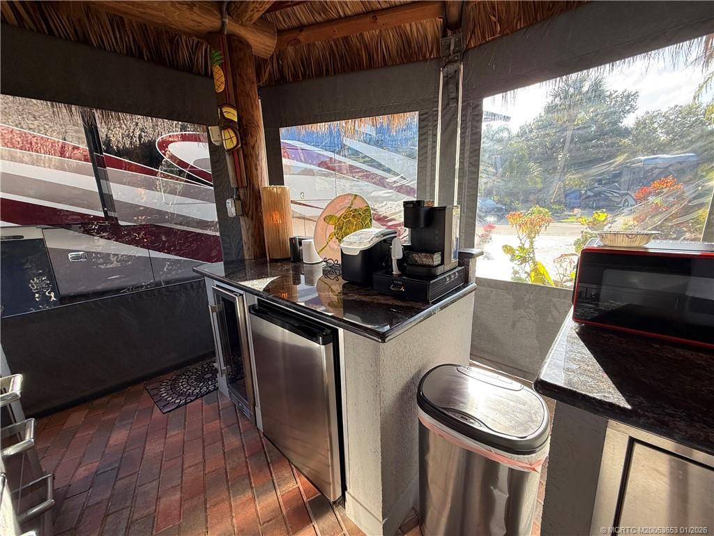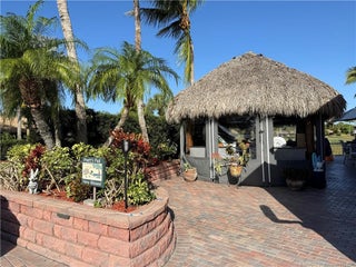 Welcome to this tropical sanctuary, where luxury and attention to detail come together to create the perfect retreat. This meticulously designed, move-in-ready lot features professionally installed 4x7 brick pavers in a classic herringbone pattern, offering both elegance and durability. The spacious tiki is a true showpiece, thoughtfully designed for comfort and functionality. It boasts a fully equipped kitchen with granite countertops, a cooktop, sink, wine chiller, beverage refrigerator, and bar area—perfect for entertaining. Custom eisenglass curtains, built-in heaters, mounted fans, accent lighting, and upgraded furnishings ensure year-round enjoyment. Situated with breathtaking views of the golf course and lake, this lot offers a front-row seat to the beauty of the lighted fountains. Whether you’re relaxing or entertaining, this exceptional property provides the ultimate resort lifestyle. Conveniently located to a satellite pool. Just bring your coach and start enjoying paradise!