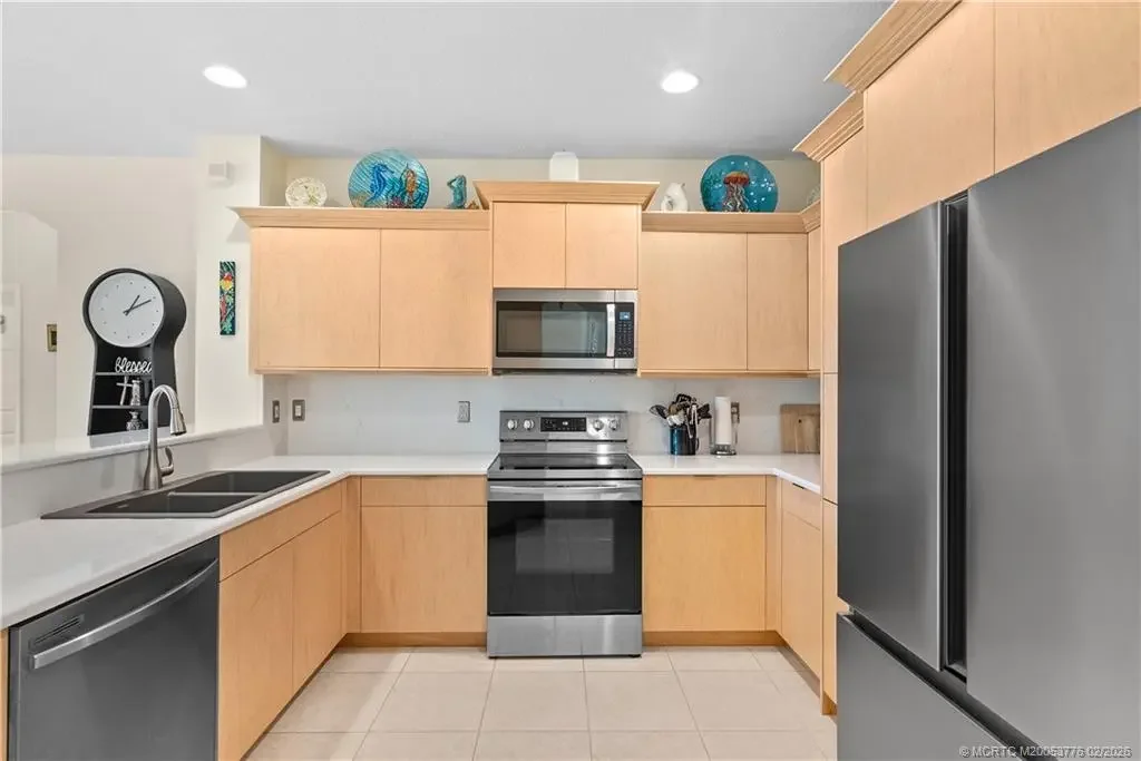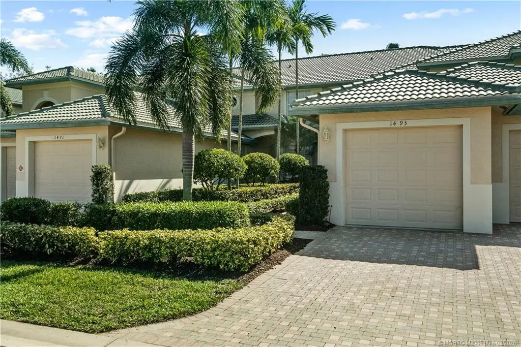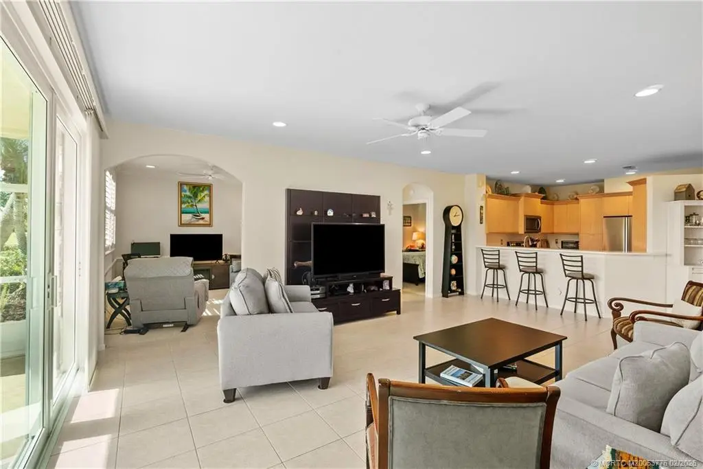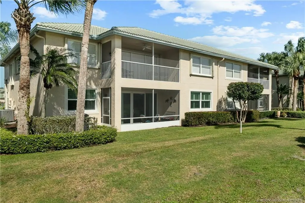 This beautifully renovated 1st-floor villa with golf course views from its screened lanai. Upgrades include impact windows & doors, fresh interior paint, custom kitchen pull-outs, soft-close cabinetry, pantry, quartz countertops, remote-controlled lighting, stainless appliances, & two appliance garages. The sunlit open floorplan features a split-bedroom layout for privacy, plus a versatile den that can serve as a 3rd bedroom. The coastal-inspired primary bath offers a walk-in shower & jetted tub. The primary suite includes new tile flooring and two walk-in closets. Deep garage accomodates a car & golf cart. Santa Lucia River Club membership is optional, offering golf, tennis, heated pool, fitness center, clubhouse, marina, & fine dining. Convenient to shopping, restaurants & beaches.