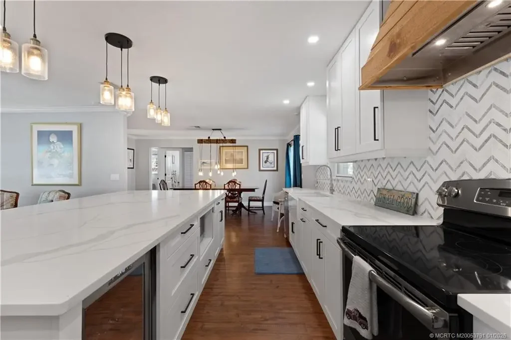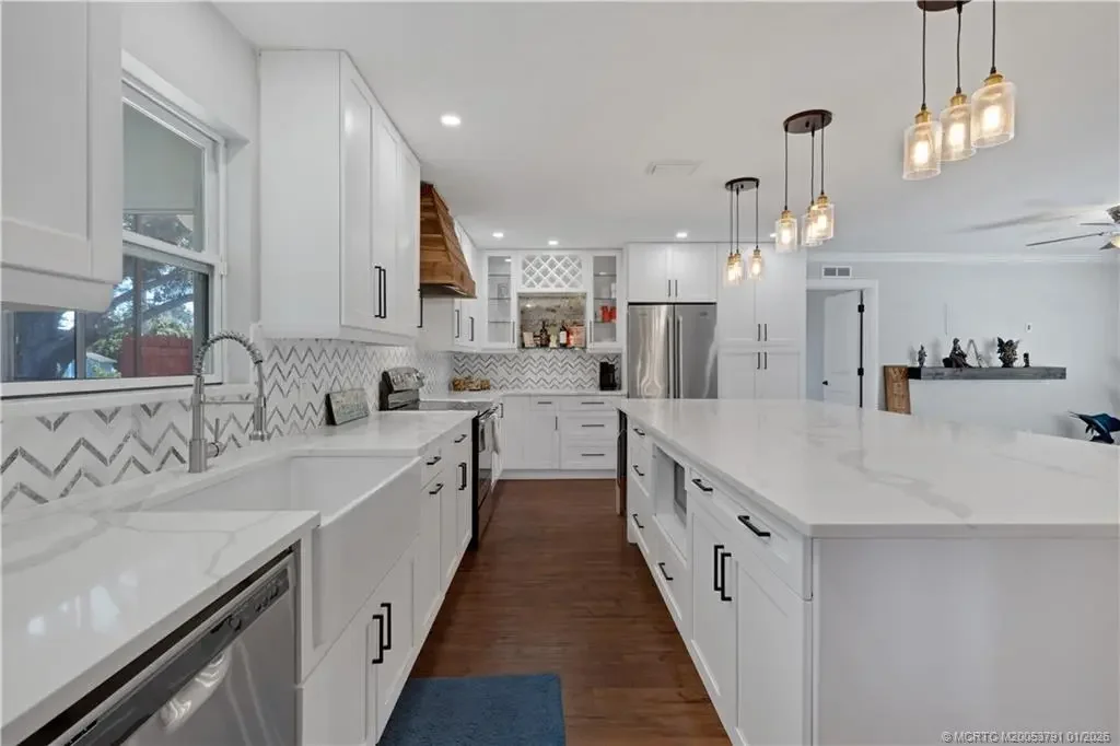 Recently renovated 3-bedroom, 2-bathroom home situated on an over half-acre lot in the heart of Stuart, with plenty of room to add a pool. Move-in ready and filled with natural light, the open-concept layout features updated flooring throughout and a spacious living area ideal for everyday living and entertaining. The upgraded kitchen offers quartz countertops, a large center island, stainless steel appliances including a wine fridge, premium cabinetry, and custom lighting. Outside, new landscaping enhances the property and creates a relaxed, tropical feel. Enjoy the screened-in patio overlooking the expansive backyard. Tucked away on a quiet cul-de-sac in a family-friendly neighborhood, this home offers privacy, space, and convenience. Located in the highly rated Martin County school district, just minutes from beaches, major roads, shopping, and dining.
