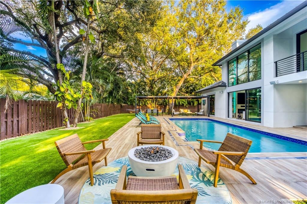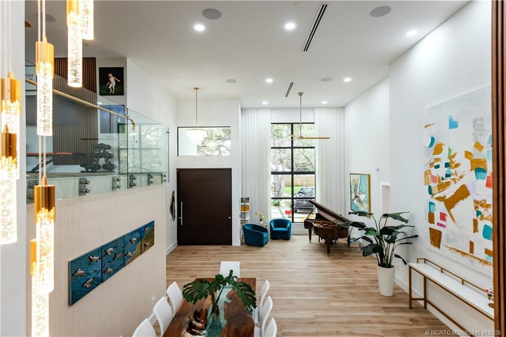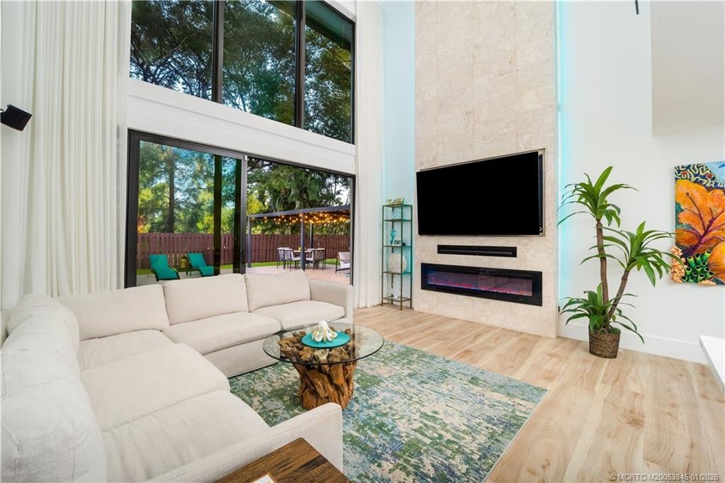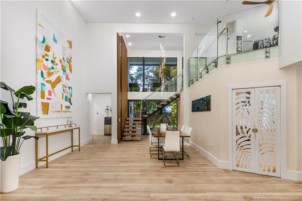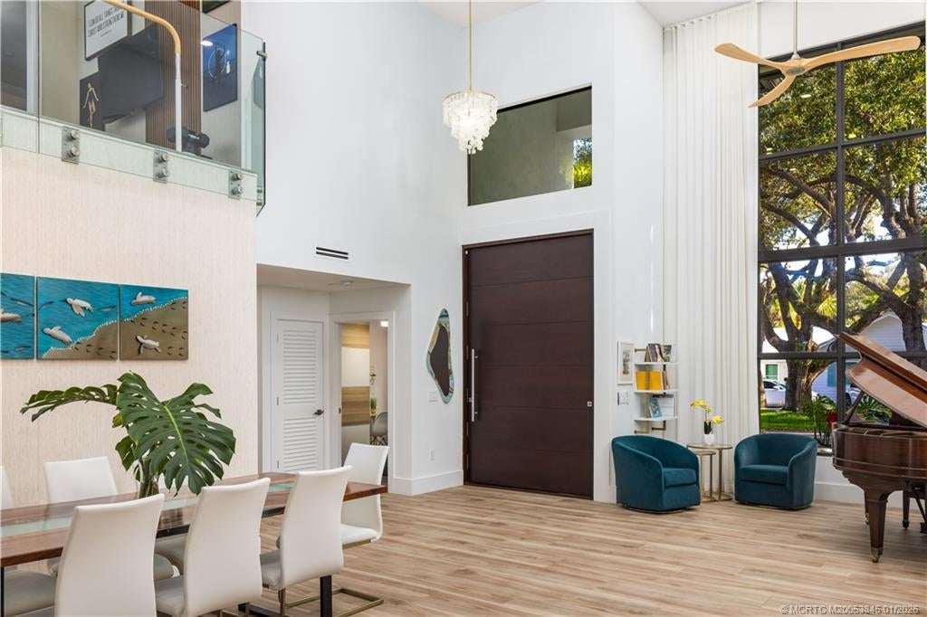 Welcome to Villa Pelican in South Sewall’s Point. This reimagined home offers soaring 18.5–19’ ceilings, 5 bedrooms, and 5 full bathrooms across just under 4,000 SF following a full renovation. Designed for seamless indoor/outdoor living, the layout includes an upstairs primary suite, three en-suite bedrooms downstairs, an additional guest bedroom, second-floor den, loft/gym, and a detached office with courtyard and pool access. The chef’s kitchen features custom plywood cabinetry, quartz countertops, high-end appliances, and an oversized island. Notable upgrades include new trusses, metal roof, foam insulation, Marvin impact windows, all new HVAC, plumbing, electrical, and drainfield, smart home technology, whole-home sound system, and reverse osmosis/alkaline water system. Outdoor living centers around a saltwater heated pool, oversized pergola, artificial turf, new landscaping, EV hookup, and an A/C-cooled garage, located near Sewall's Point Park, beaches, restaurants, and shopping.