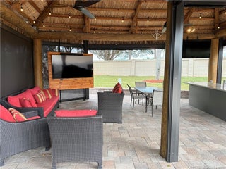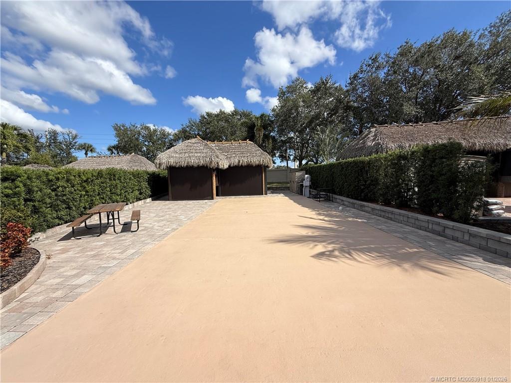 An oversized 3,334 sq ft lot offering refined resort-style living in a premier Class A motorcoach community. This enhanced property features a custom tiki hut with remote-controlled screens and a marine-grade granite kitchen complete with hot water, upgraded fans, and an eye-level wall-mounted TV—ideal for elegant entertaining or relaxed evenings under the stars. The extra-long pad provides generous parking in front of the coach, while additional side width allows effortless golf cart access without the need to back up. Set on a picturesque, mature royal palm-lined street within one of the nation’s top-rated luxury motorcoach resorts, this one ticks the boxes. Dog lovers will appreciate the green space in the rear. Amenities include pickleball and tennis courts, bocce ball, shuffleboard, a par-3 executive golf course, 4 pools/spas and a vibrant clubhouse hosting year-round social events—all included in the HOA. Sold furnished and move in ready, just bring your coach and join the fun!