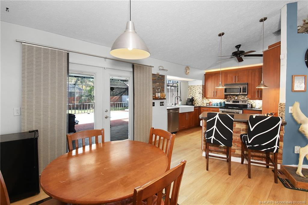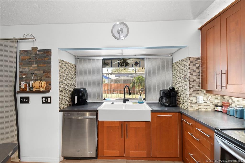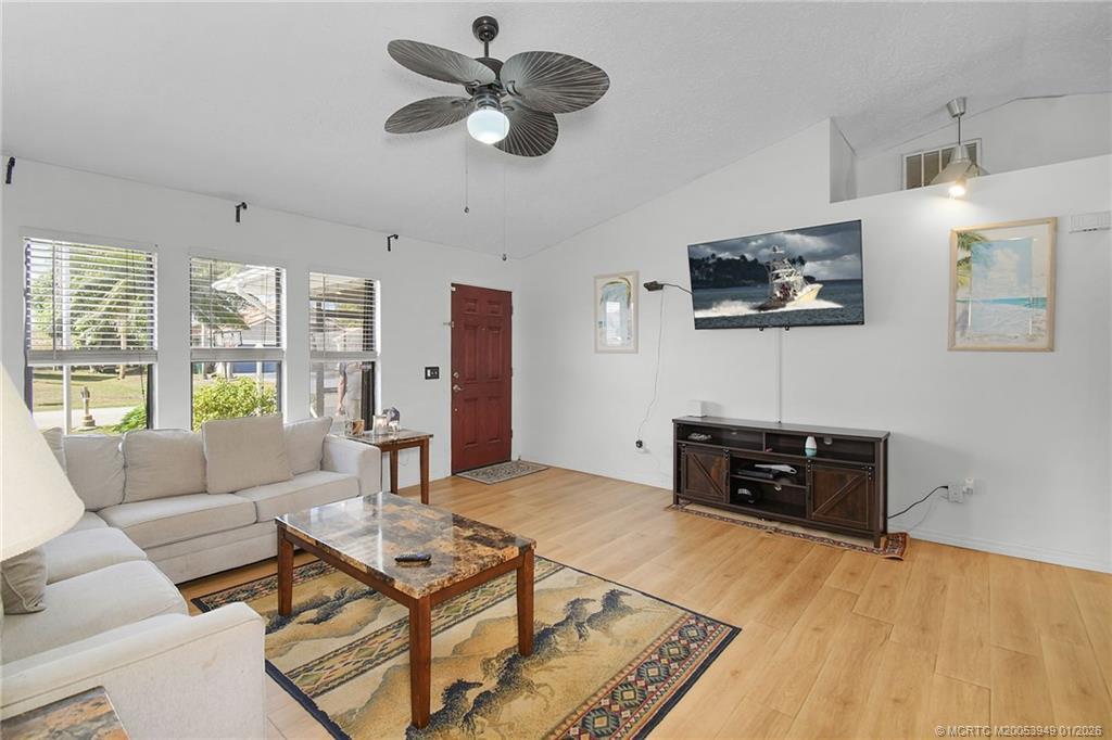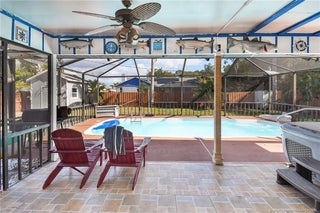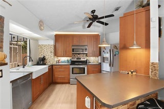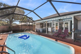 Welcome home to this charming and well-maintained family residence offering 3 bedrooms, 2 full bathrooms, and a 2-car garage, all set on a quiet street close to shopping and dining. Step inside to vaulted ceilings and an open-concept layout that seamlessly connects the living room, kitchen, and dining area—perfect for both everyday living and entertaining. The kitchen features attractive cabinetry, a tile backsplash, a deep farmhouse-style sink, creating a functional and inviting space. Sliding doors lead you outdoors to a covered patio and screened-in pool area, complete with a hot tub that conveys with the sale, making this backyard a true retreat. Enjoy a spacious, fully fenced backyard with a storage shed for added convenience. Additional highlights include accordion storm shutters, two driveways with ample boat/RV parking, and a new washer and dryer. This home offers comfort, functionality, and lifestyle—don’t miss the opportunity to make it yours.